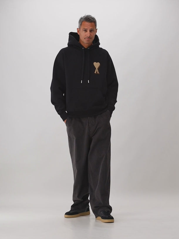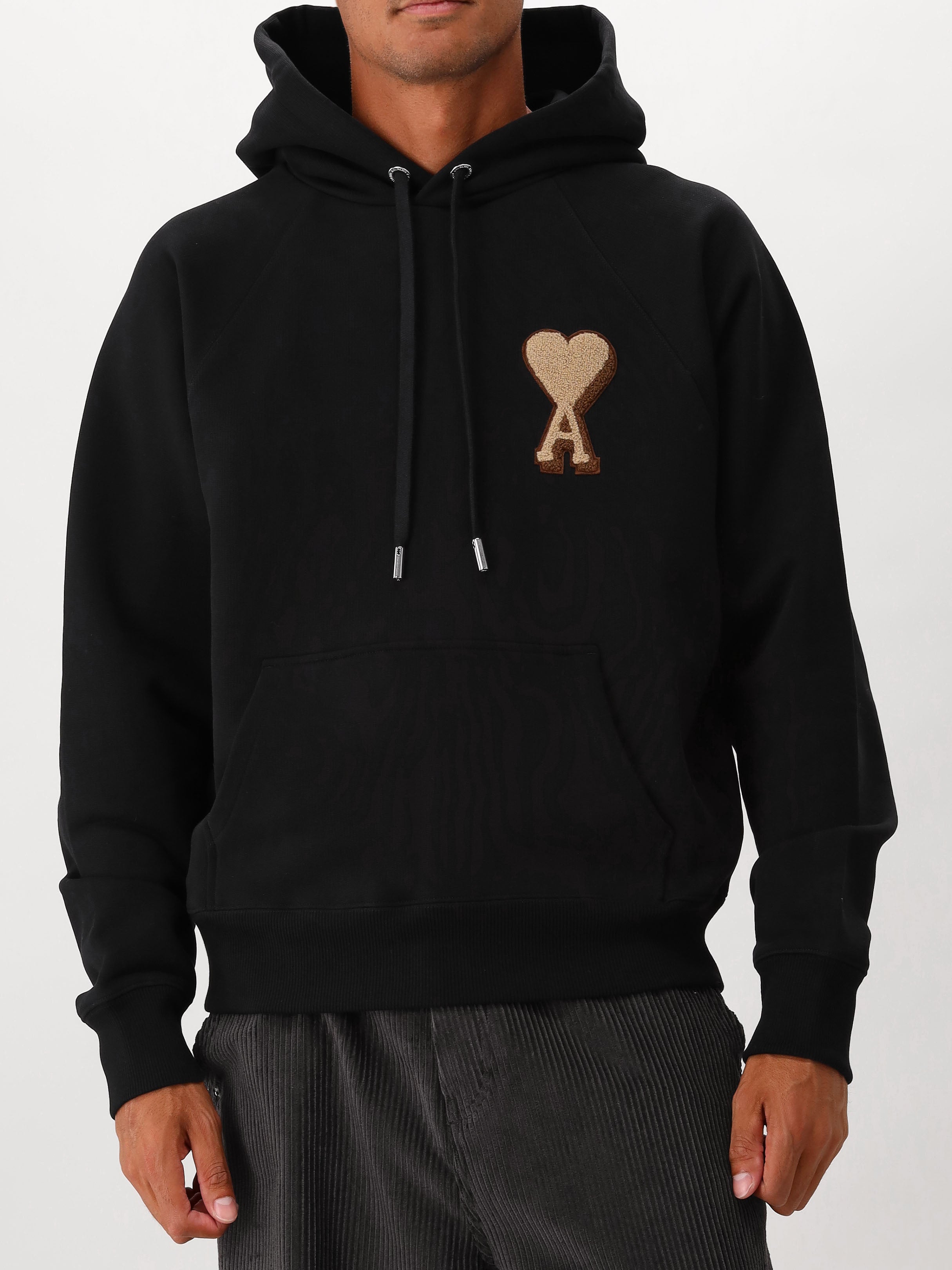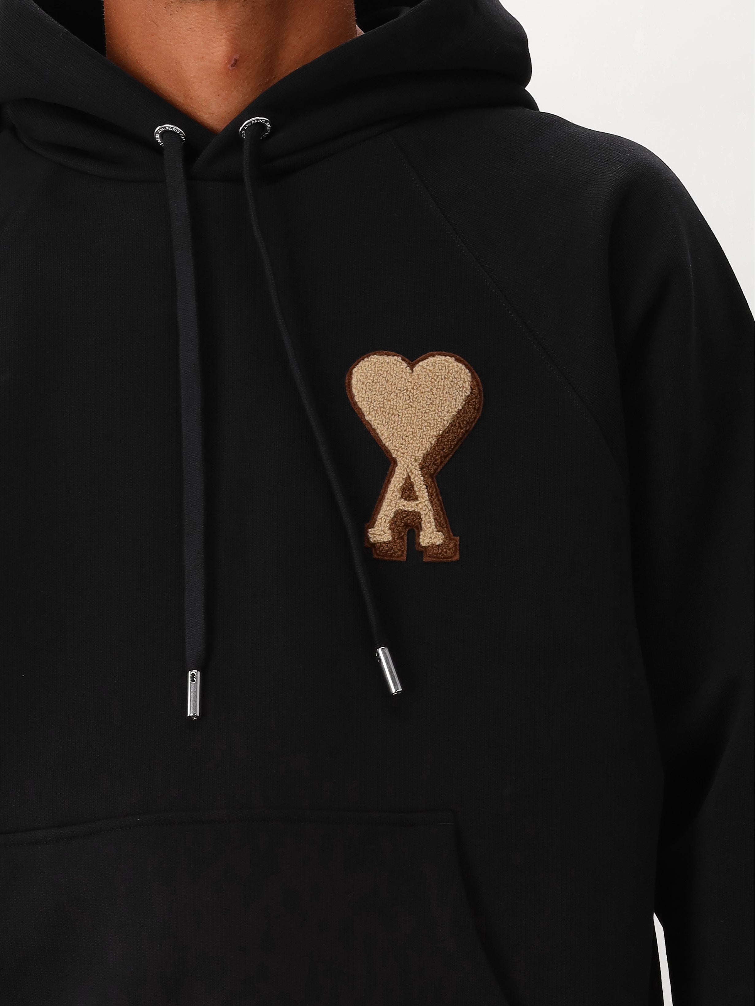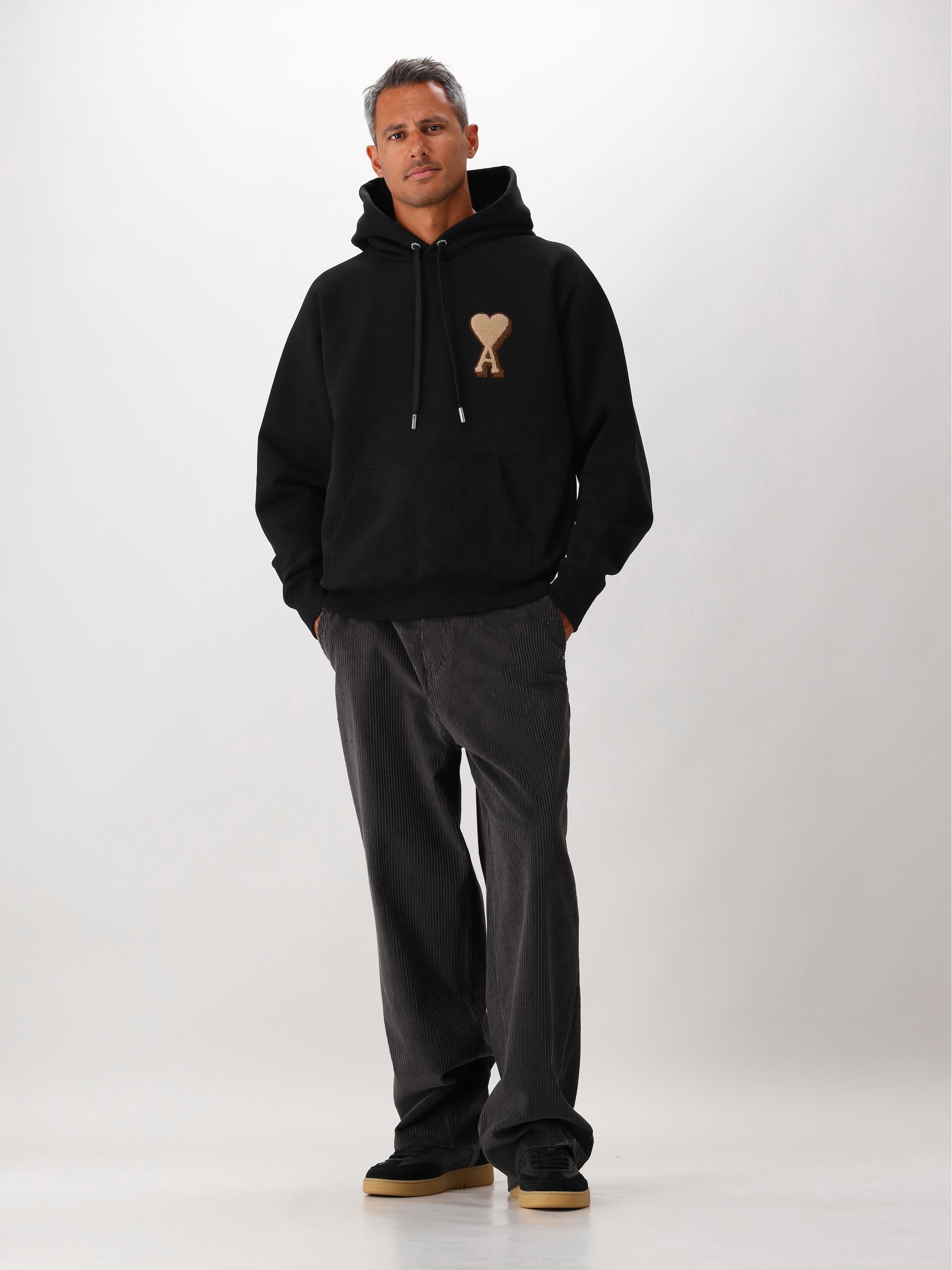 Deze zwarte hoodie van AMI Paris bestaat uit een mix van katoen en elastaan. Op de borst vind je het AMI logo terug in een bruin/beige kleur. De zwarte hoodie is tijdloos en casual.