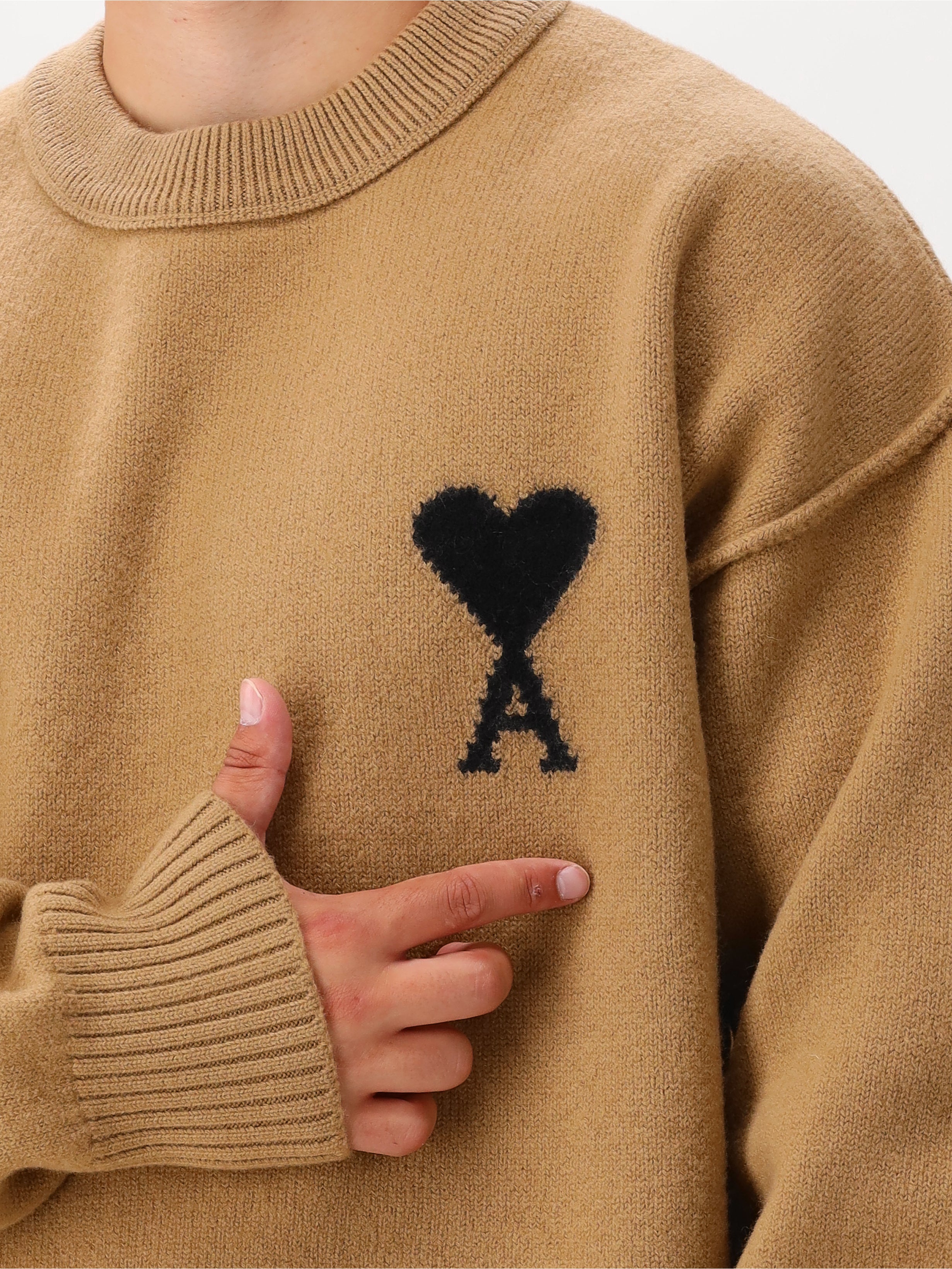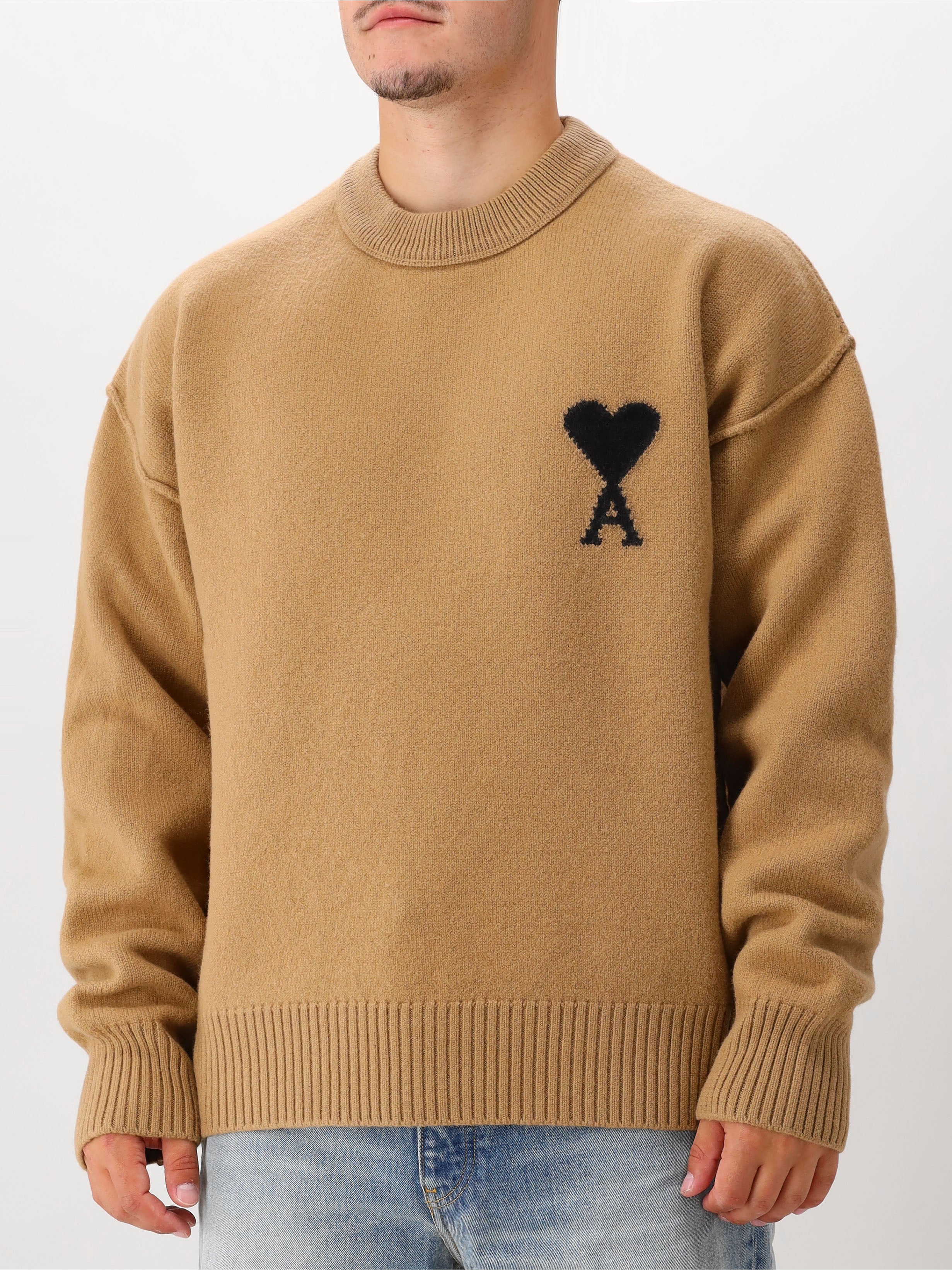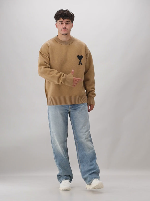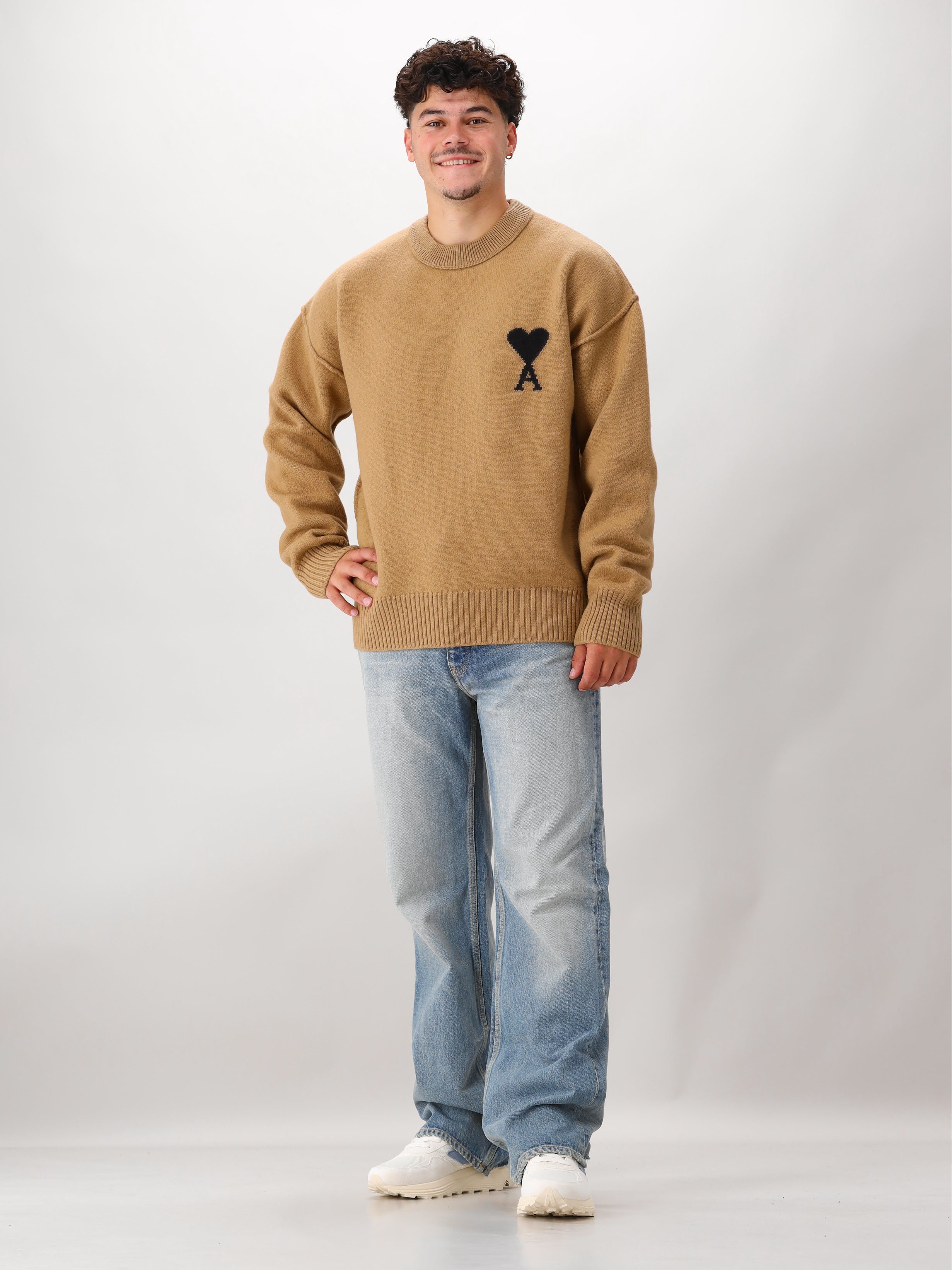 Deze bruine gebreide trui van AMI Paris bestaat voor 100% uit onbewerkte wol. Op de borst vind je het AMI logo in het zwart terug. De gebreide trui is stijlvol en extreem comfortabel. Stijl het voor een ultieme streetwear look, of kies voor een comfy casual outfit.