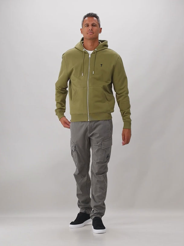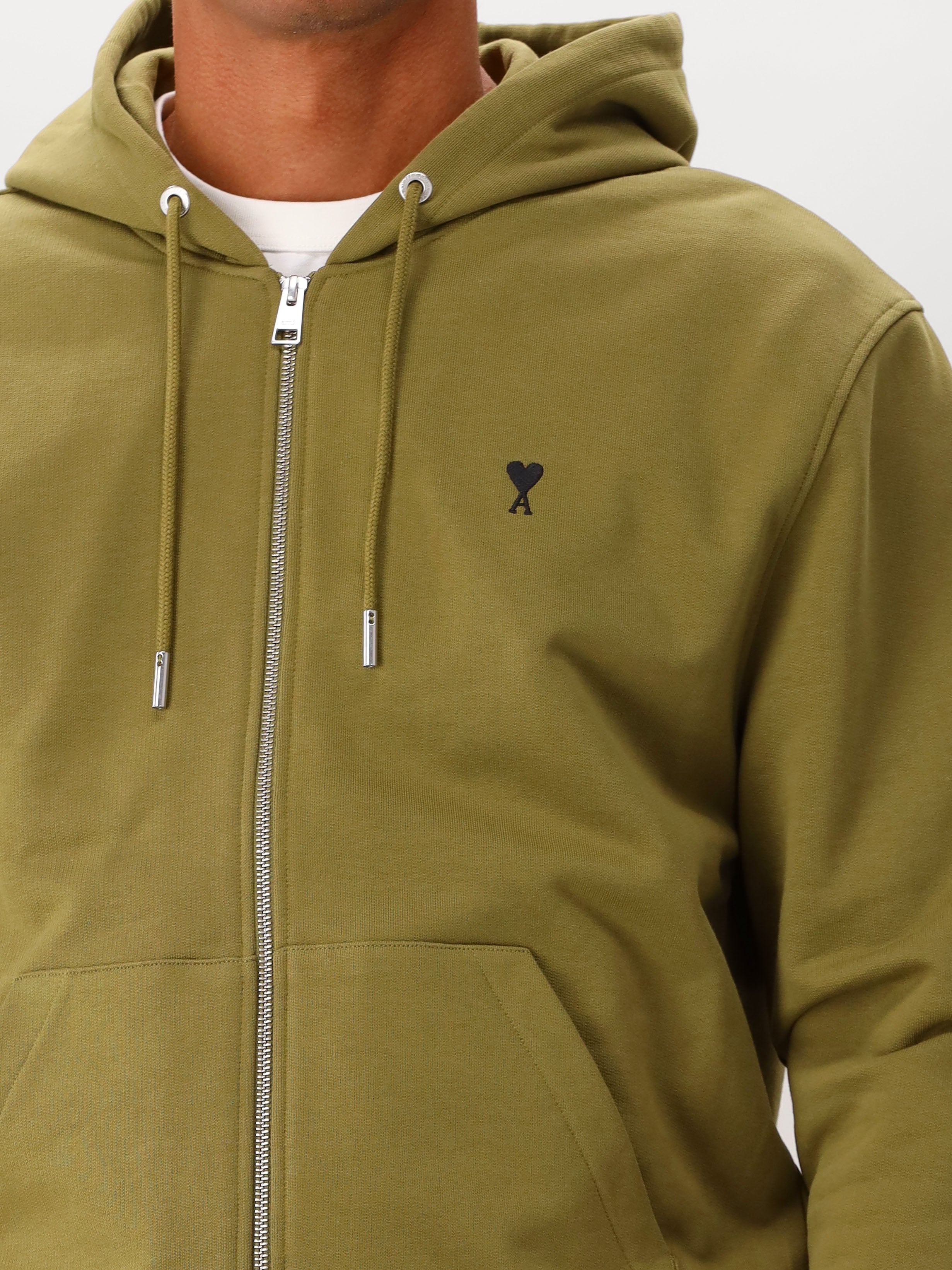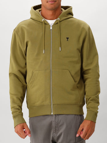 Check dit groene vest van AMI Paris! Het vest heeft een olijfgroene kleur en op de borst zie je het merklogo, geborduurd in het zwart. Het sluit met een rits en heeft een capuchon met trekkoord. Aan de voorkant zitten twee zakken. Het vest is gemaakt van een mix van katoen en elastaan.