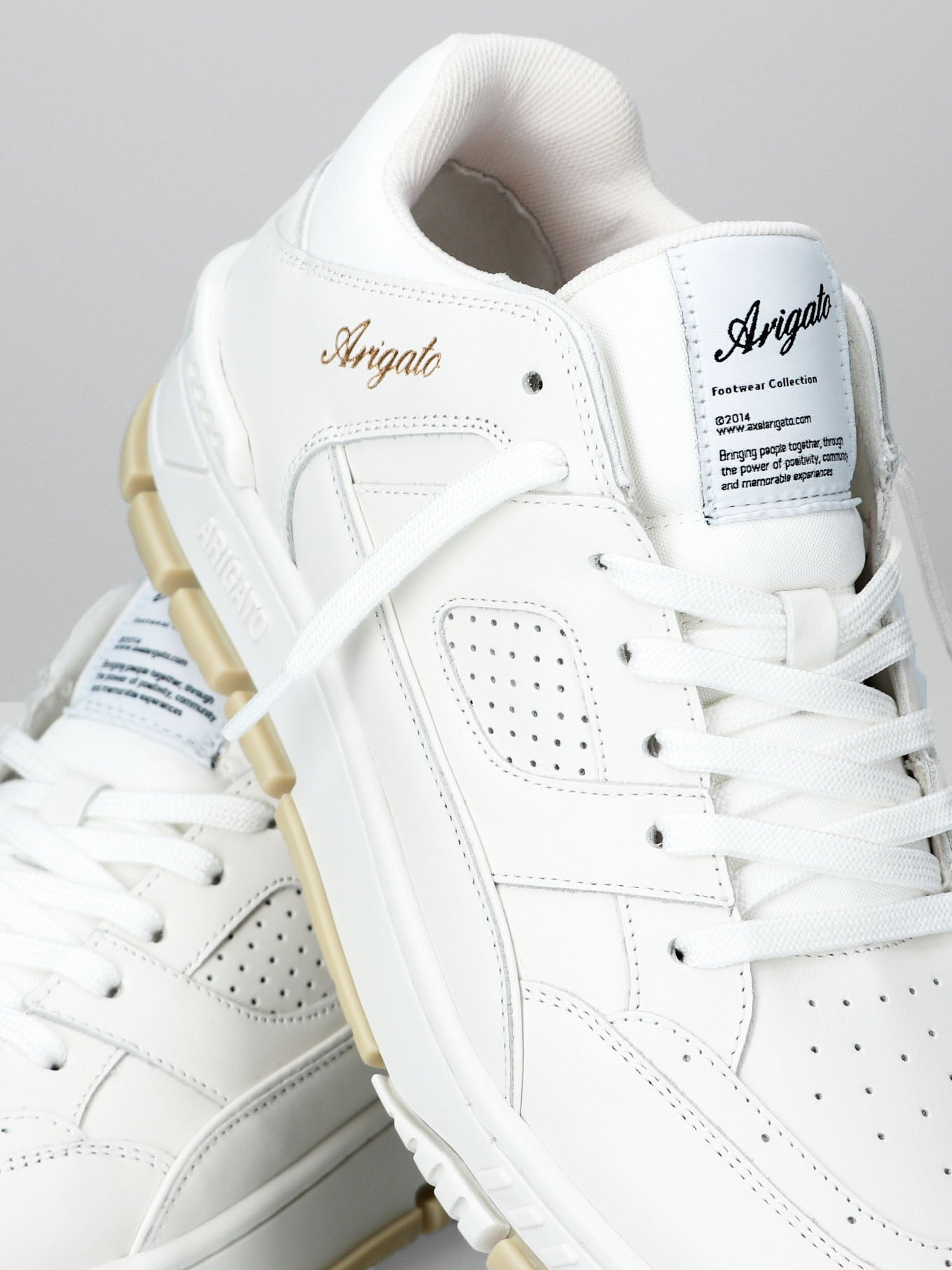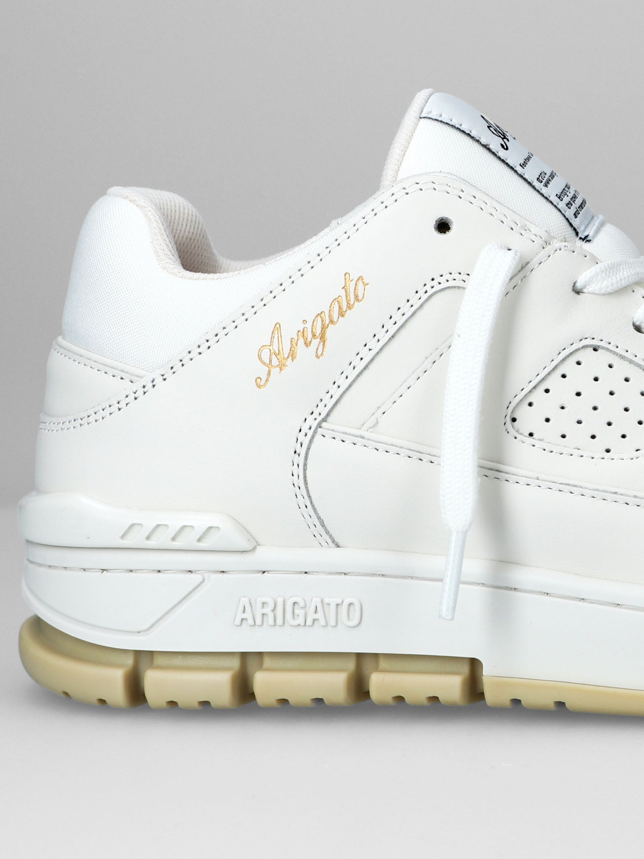 Kies voor deze witte sneakers van Axel Arigato. De sneakers zijn wit, maar een deel van de zool heeft een beige kleur. Op de zijkant van de sneakers zie je een goudkleurig merkdetail, en op de lip van de schoen zie je een merklabel.