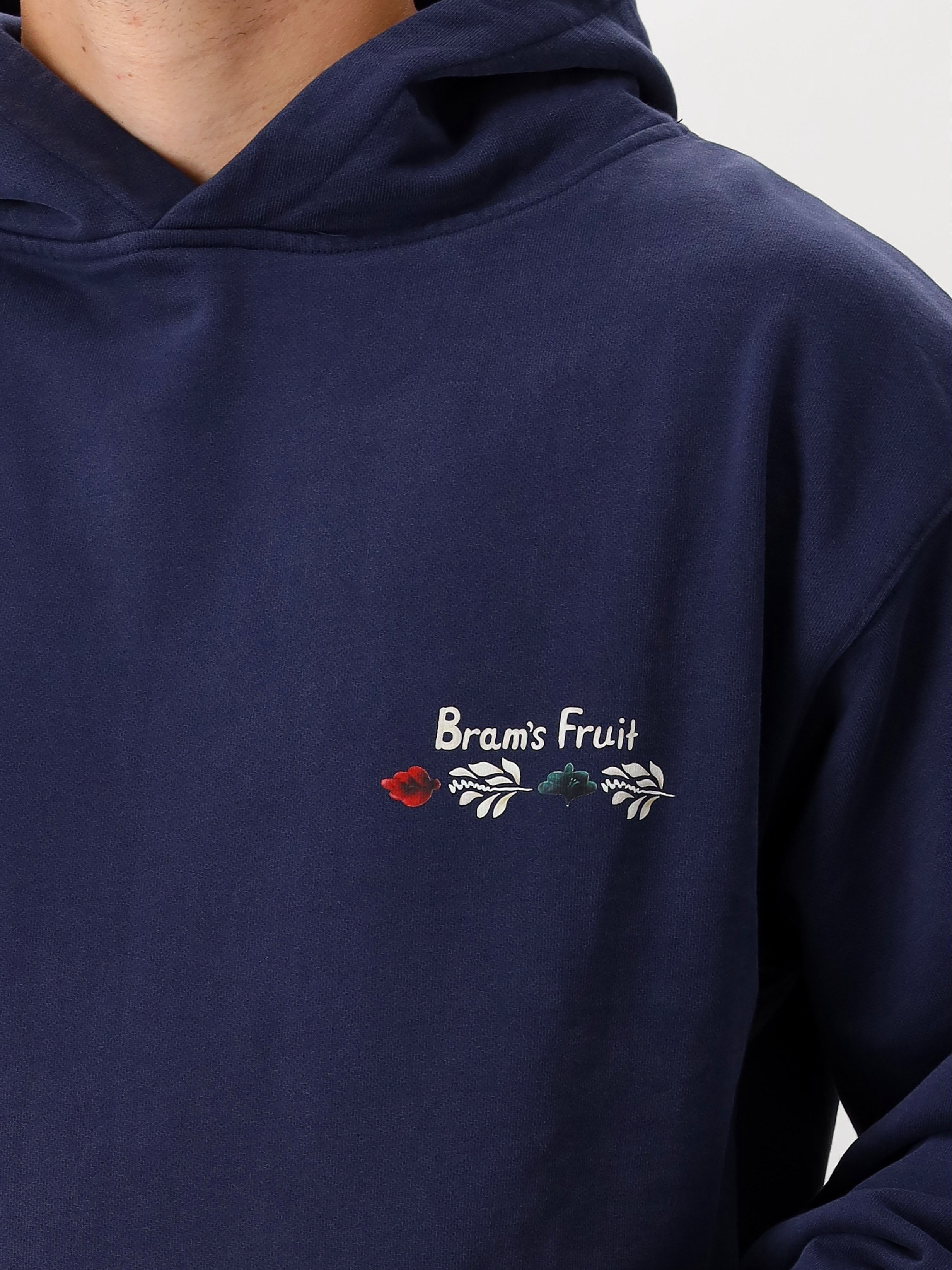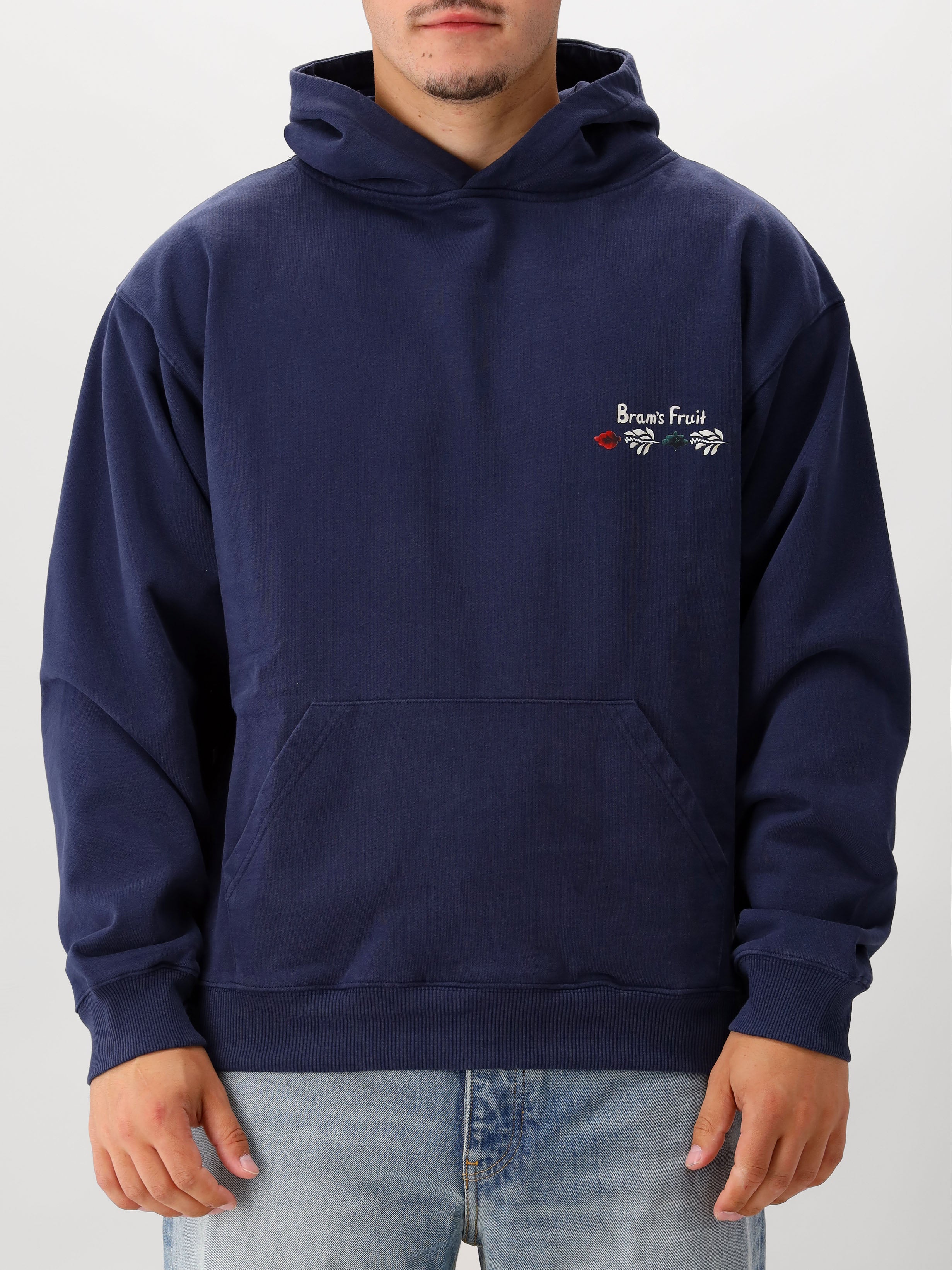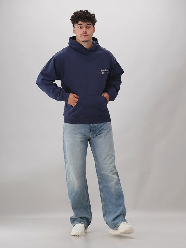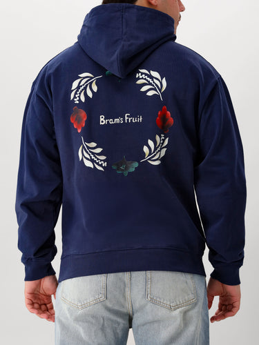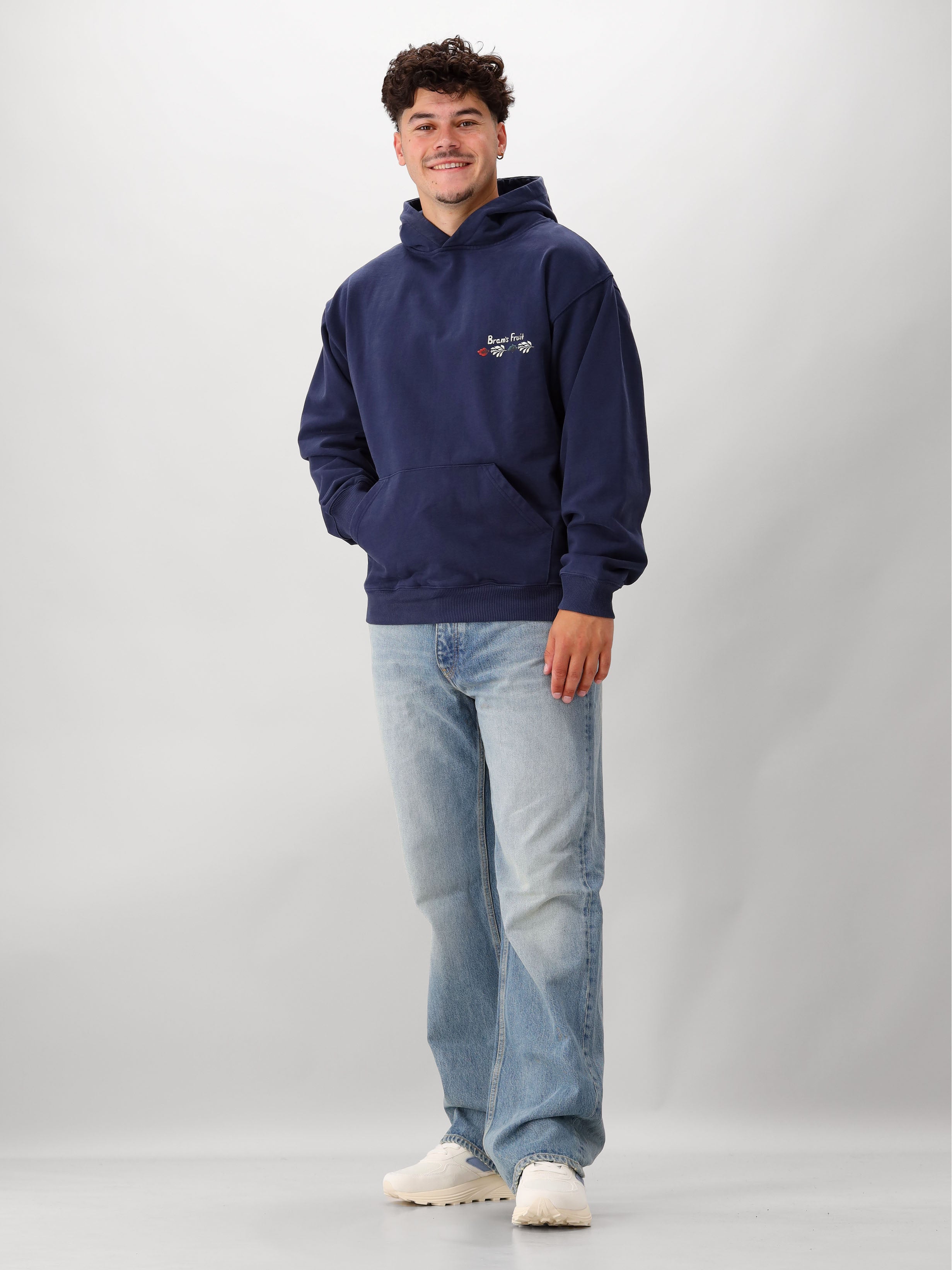 Check deze donkerblauwe Flora hoodie van Bram's Fruit! De hoodie heeft een oversized fit en is voorzien van een capuchon. Op de voorkant zie je het merklogo, en op de achterkant staat een grote merkprint met het logo en meerdere bloemen. De hoodie is gemaakt van 100% katoen.