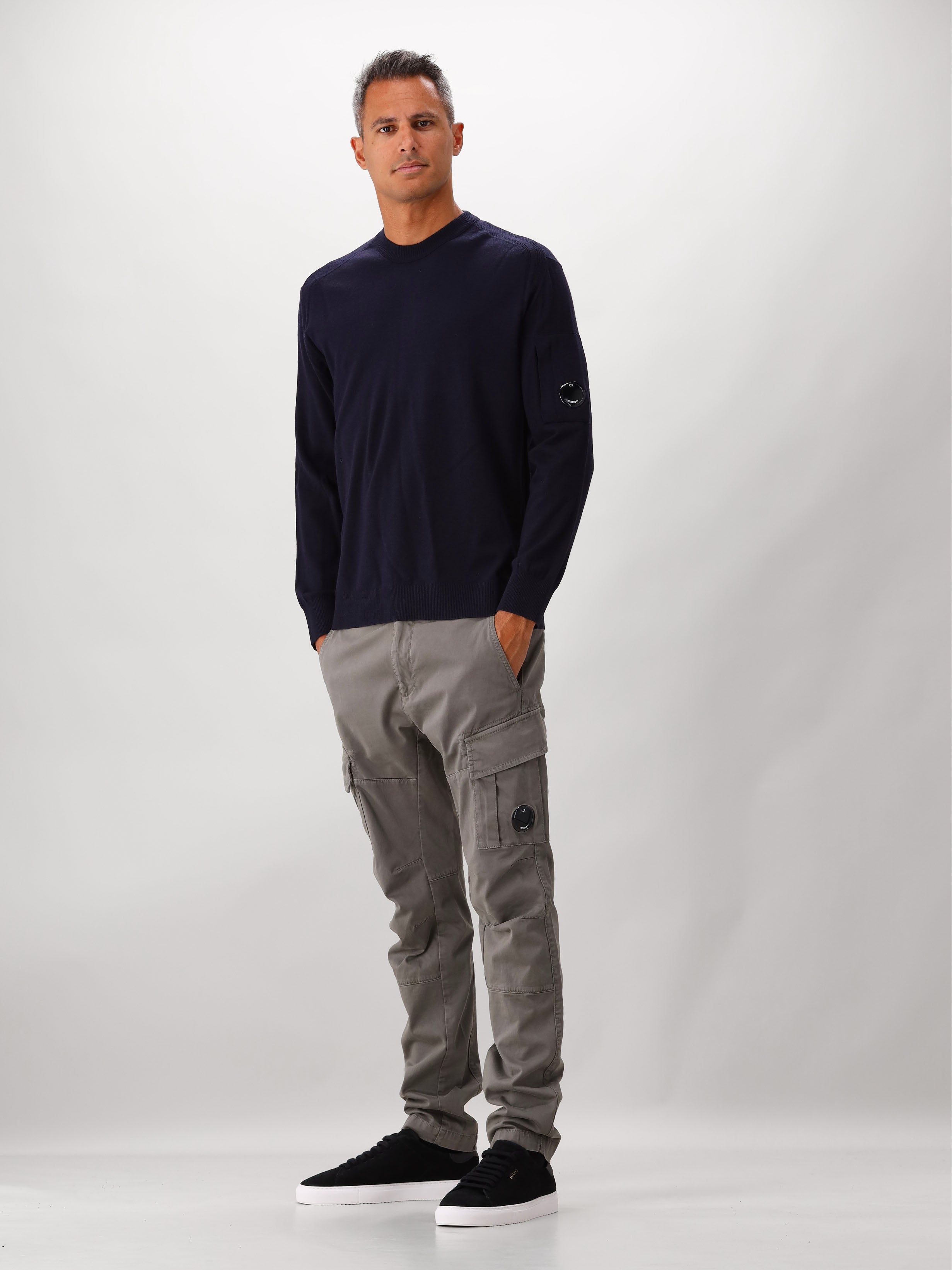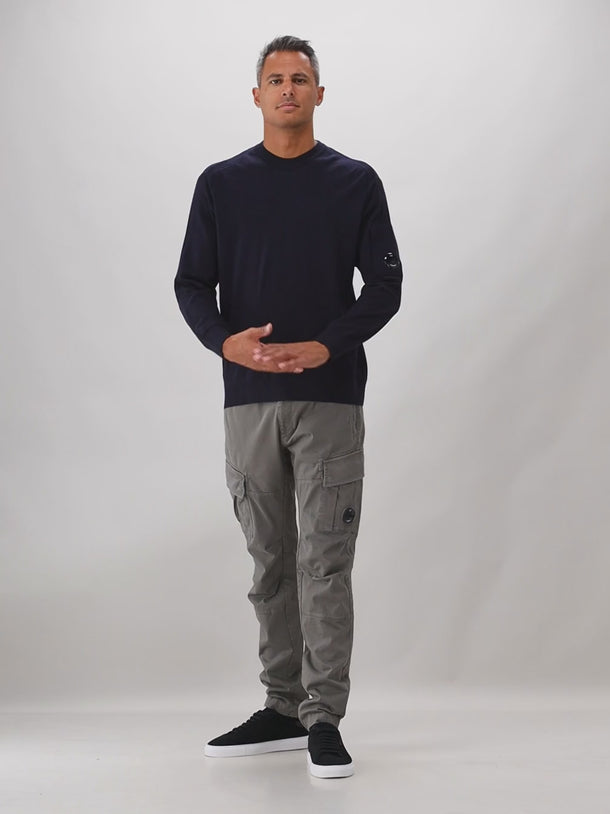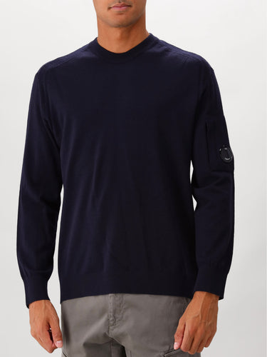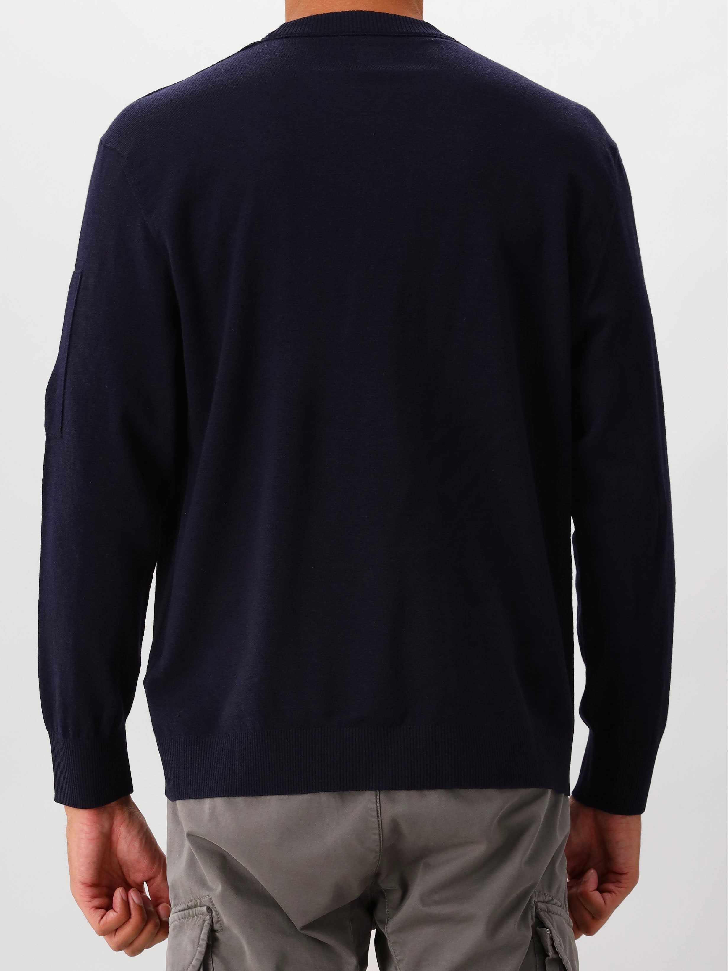 Deze navyblauwe gebreide trui van C.P. Company bestaat uit een mix van wol en polyester. De kleur is diepblauw, en gemakkelijk te stijlen op verschillende broeken. Op de linkermouw vind je de C.P. lens.