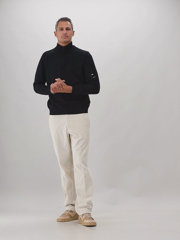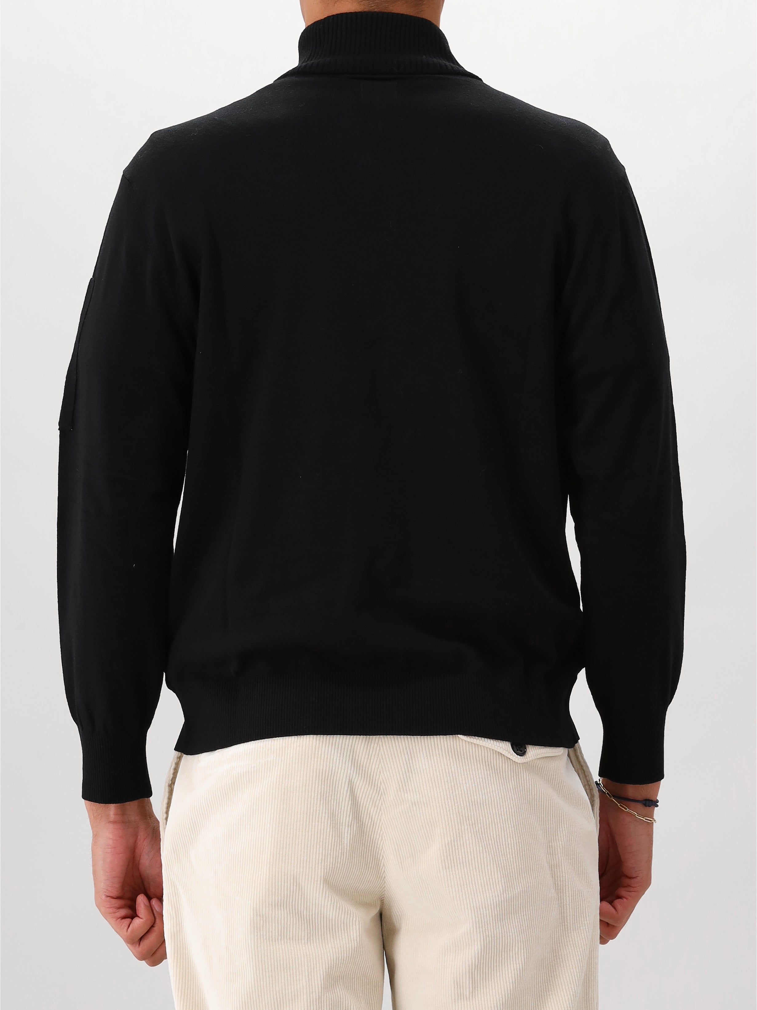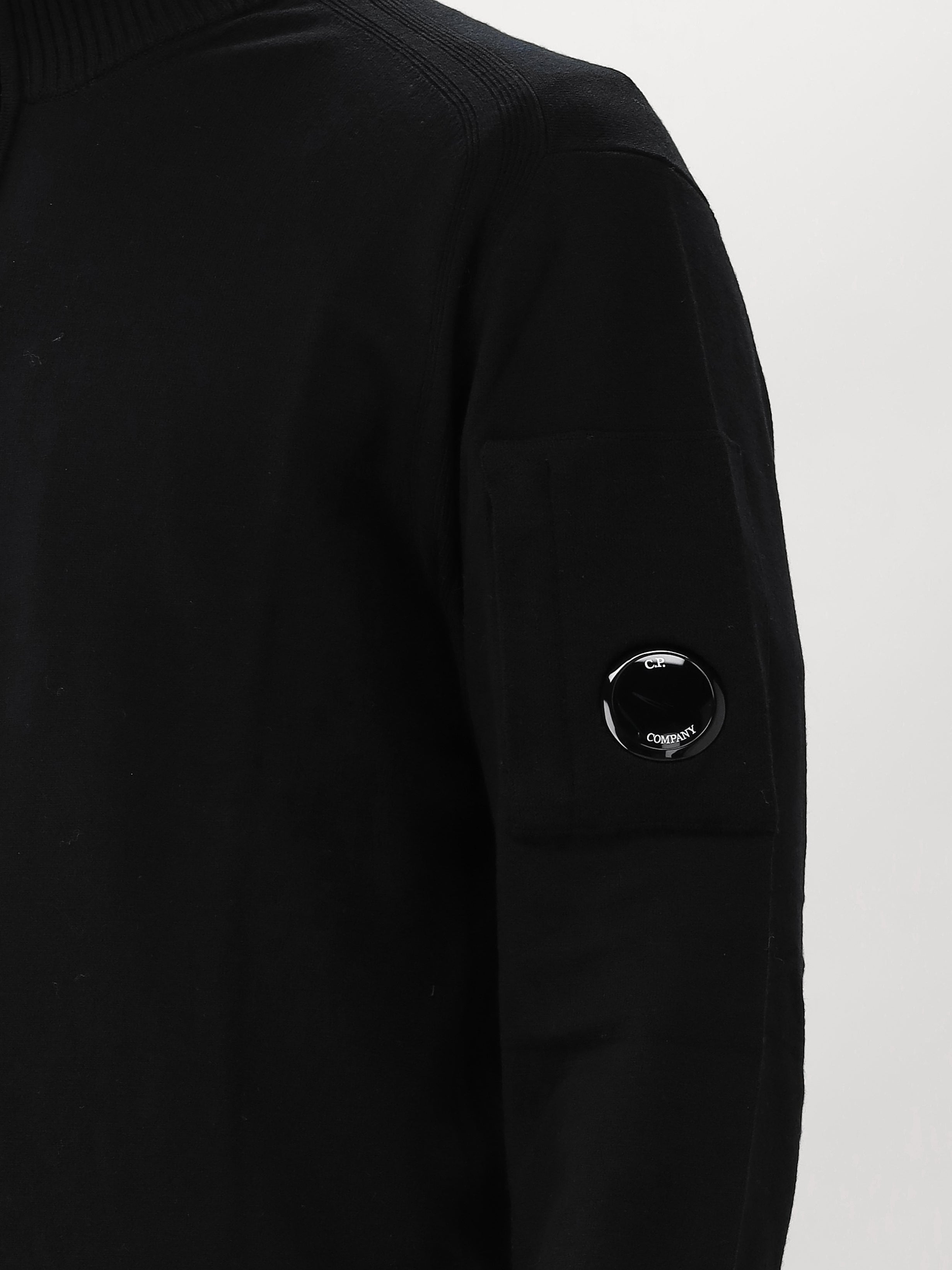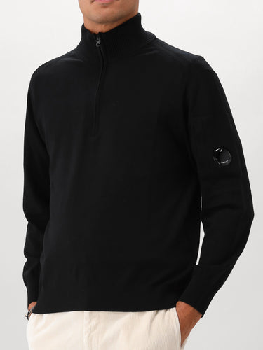 Deze zwarte gebreide trui van C.P. Company bestaat uit een mix van onbewerkte wol en polyester. Op de linkermouw vind je de C.P. Company lens terug. De gebreide trui heeft een halve rits.