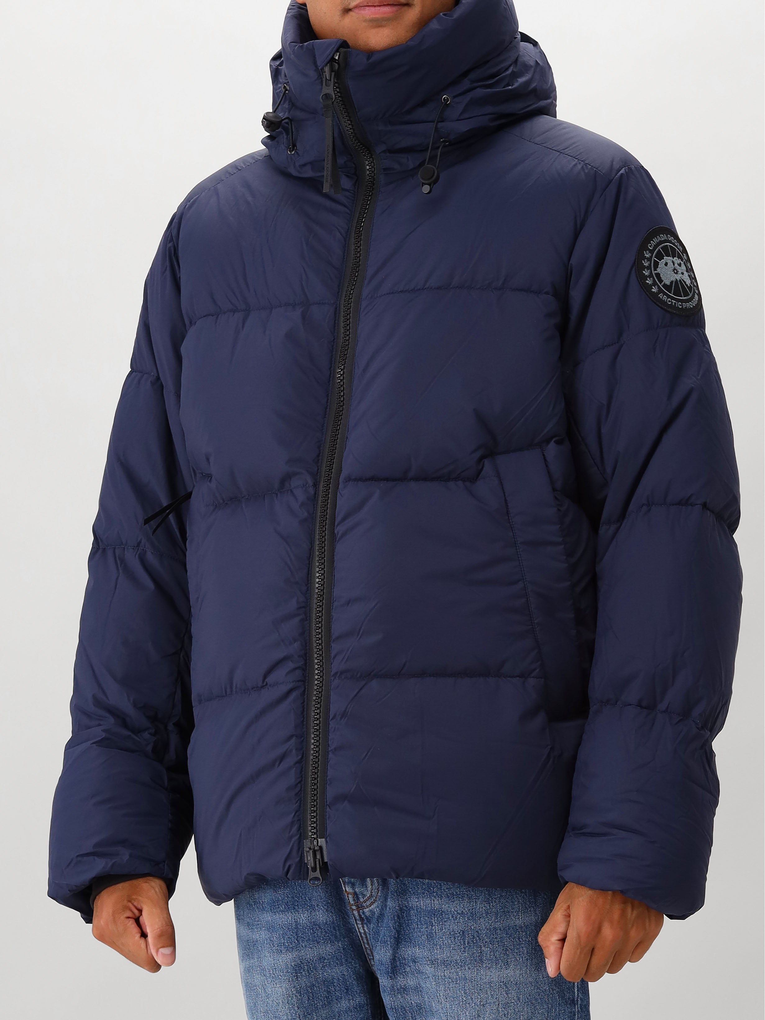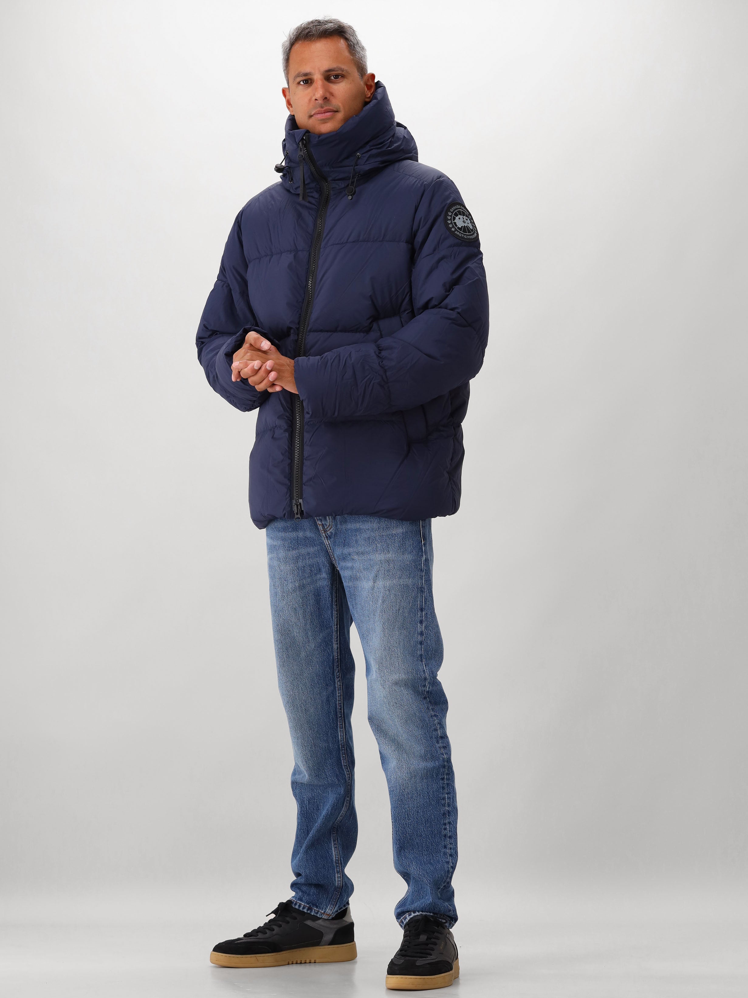Deze donkerblauwe puffer jacket van Canada Goose is erg lichtgewicht en comfortabel. De jas is geschikt voor temperaturen tot -25 graden onder Celsius! Op de linkermouw vind je een grote badge terug in een zwarte kleur.