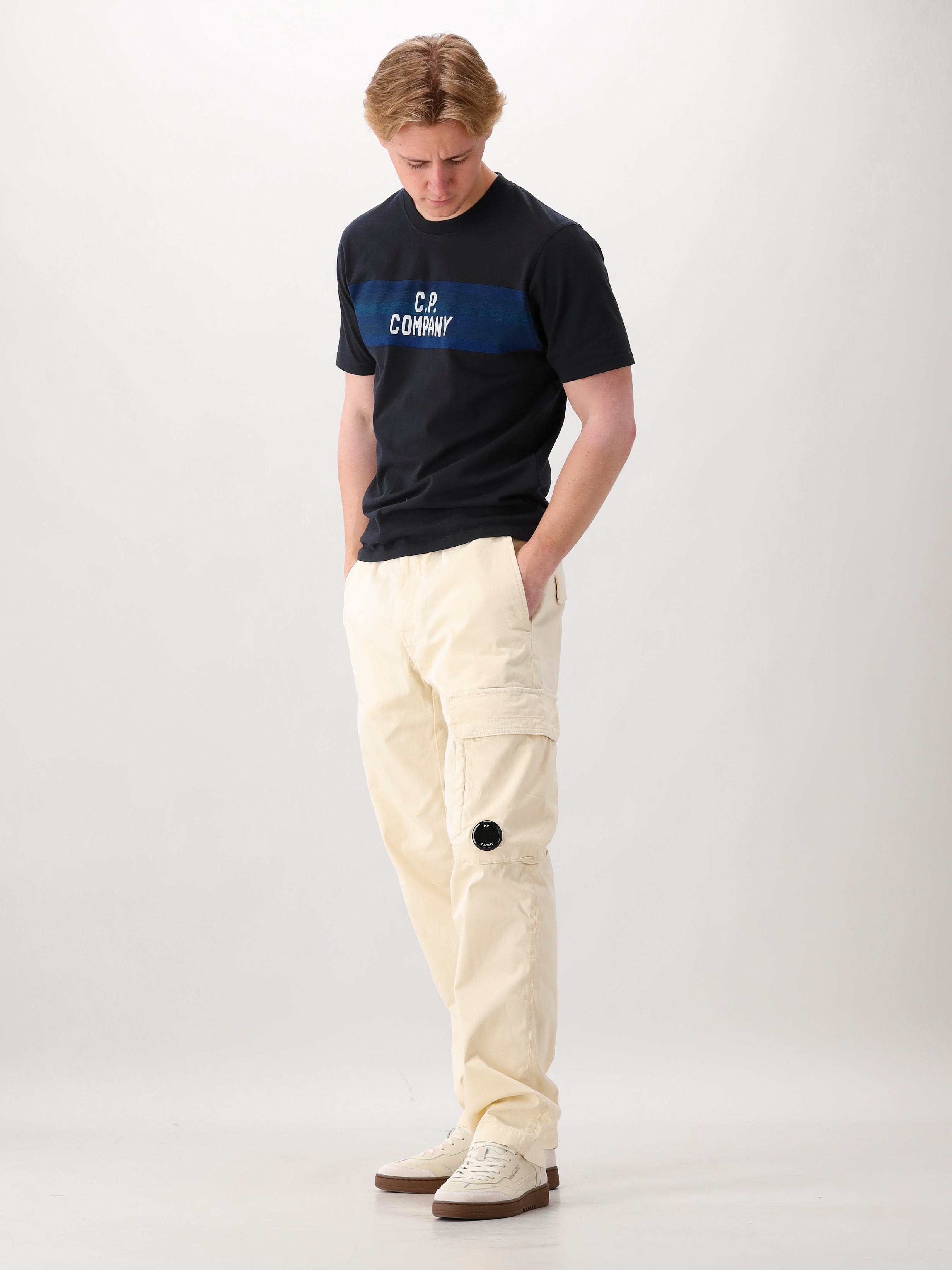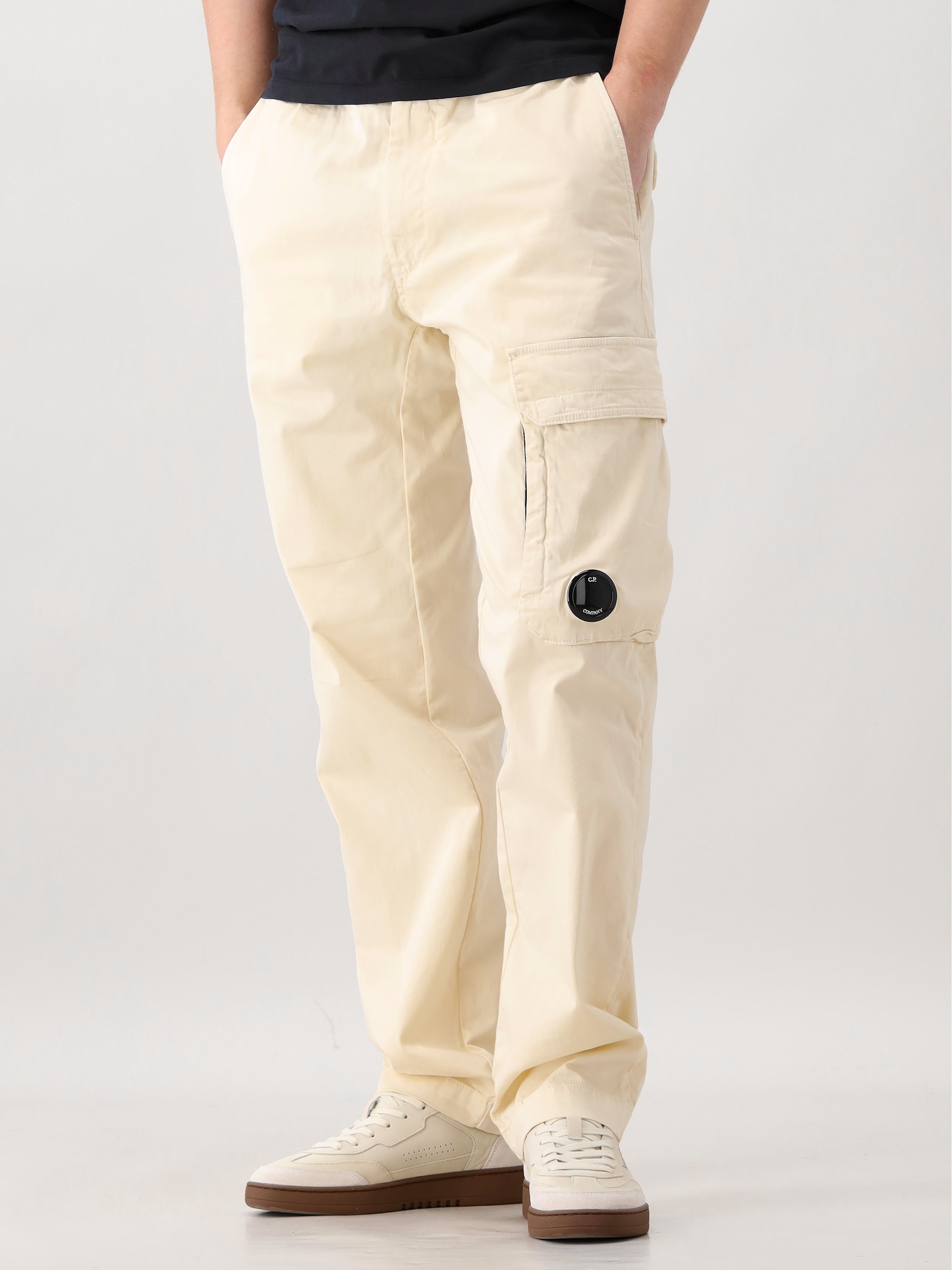 De cargobroek heeft praktische details zoals meerdere zakken, waaronder cargo zakken op de zijkant. Het iconische CP Company lens logo is subtiel verwerkt, wat zorgt voor een herkenbare merkuitstraling.