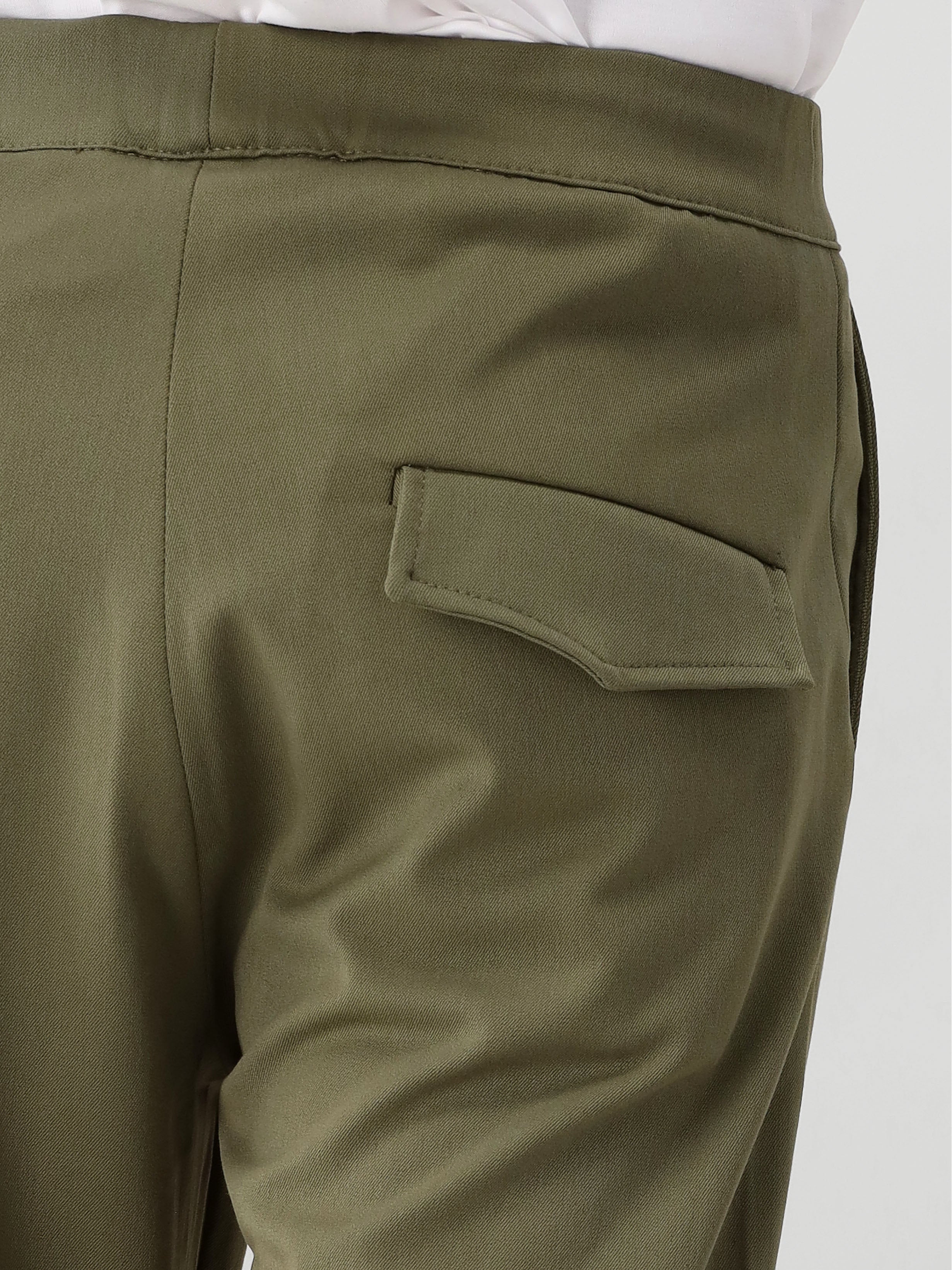 Deze groene pantalon van Flâneur is stijlvol en ontzettend comfortabel. Op het linkerbeen vind je een merkpatch geborduurd terug. Door de tailleband loopt een elastiek en een koord zodat deze op maat gesteld kan worden.