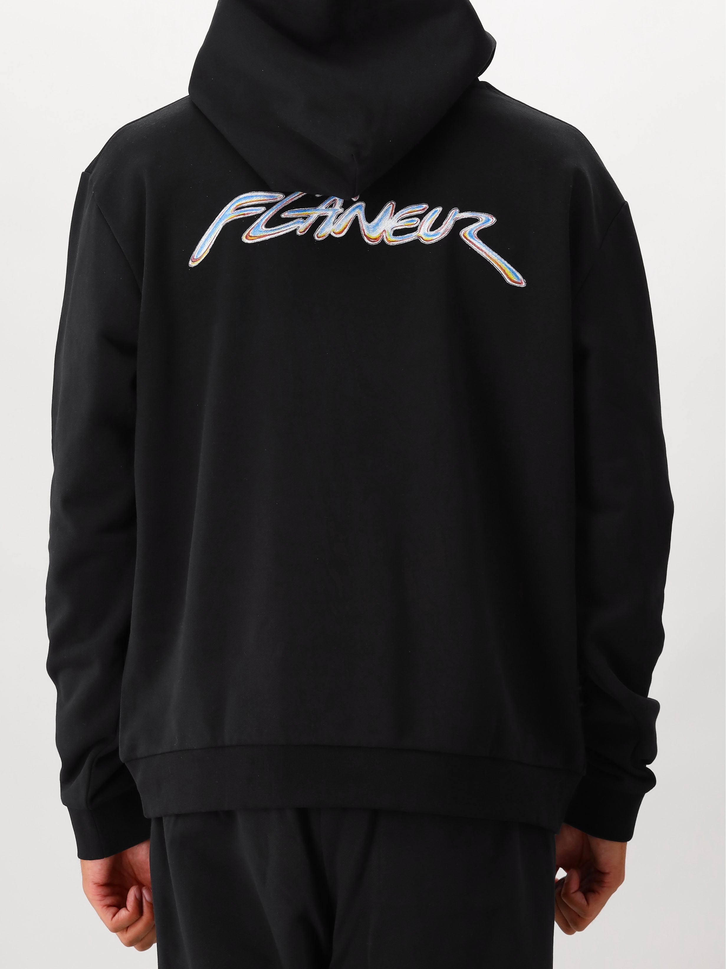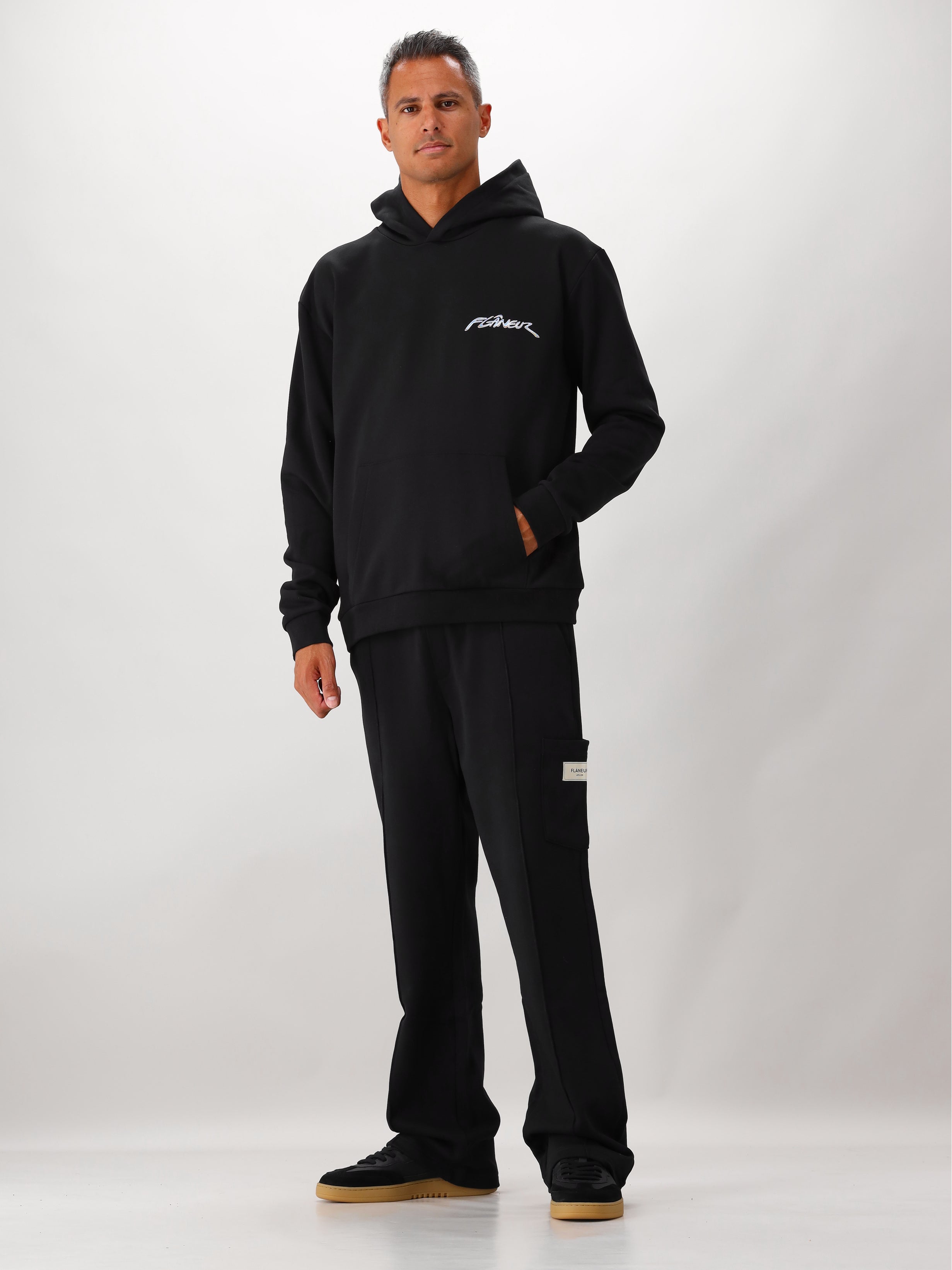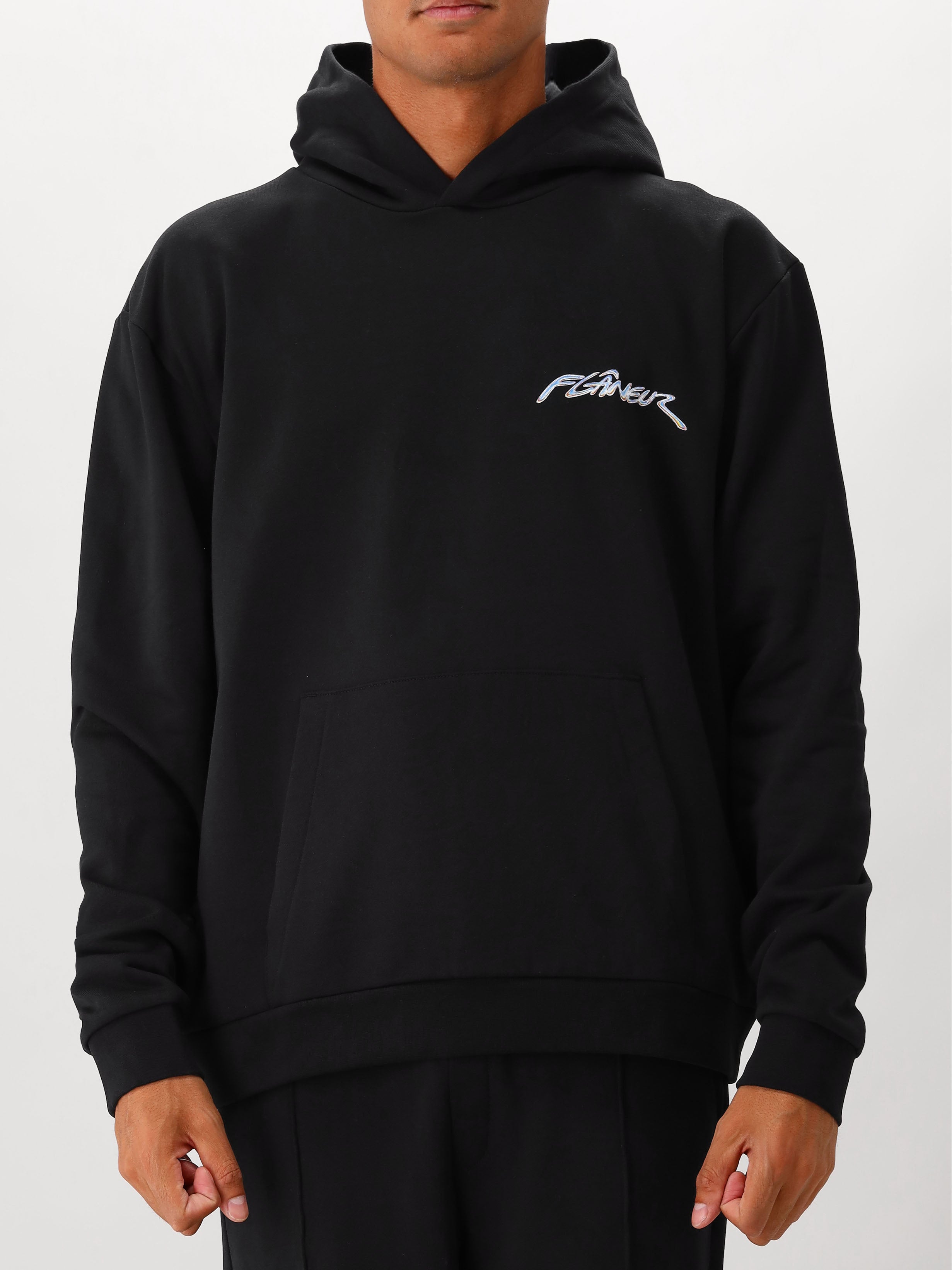 Check deze zwarte hoodie van Flaneur! Op de voorkant zie je een merkprint met een gaaf effect. De hoodie heeft een capuchon en een zak aan de voorkant. De trui is dik en lekker zacht aan de binnenkant. De hoodie is gemaakt van 100% katoen en heeft een oversized fit.