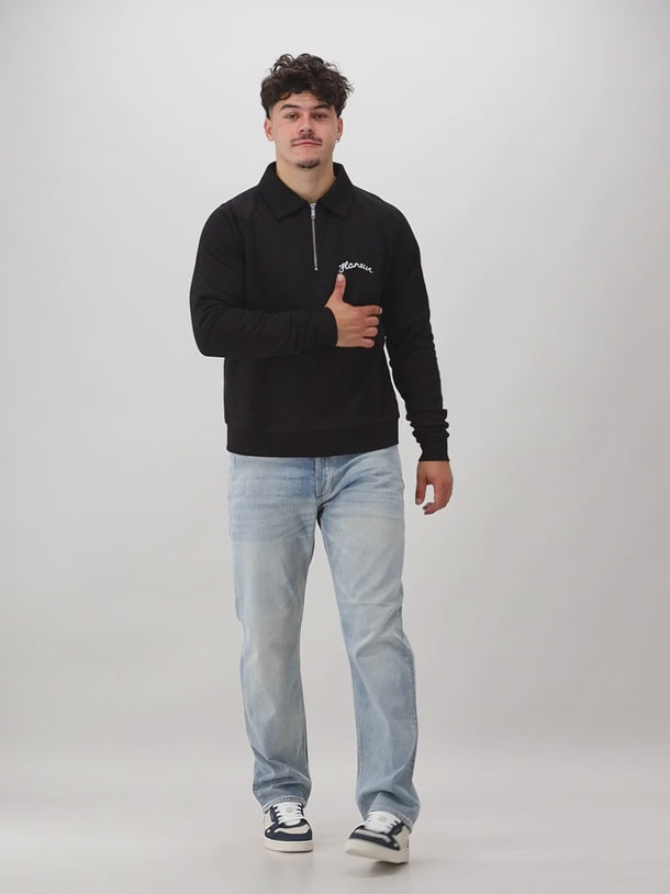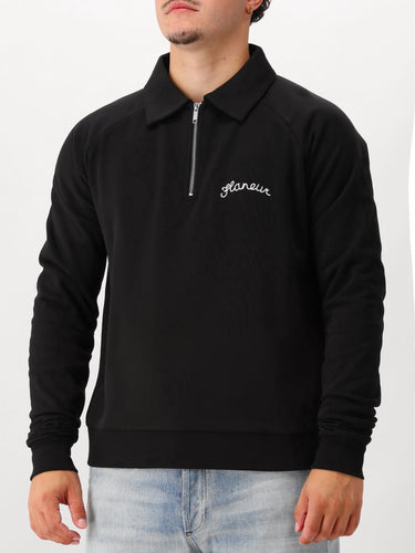 Kies voor deze zwarte half-zip sweater van Flâneur. De sweater heeft een regular fitting, op de borst vind je het signature van Flâneur. De sweater bestaat voor 100% uit katoen.