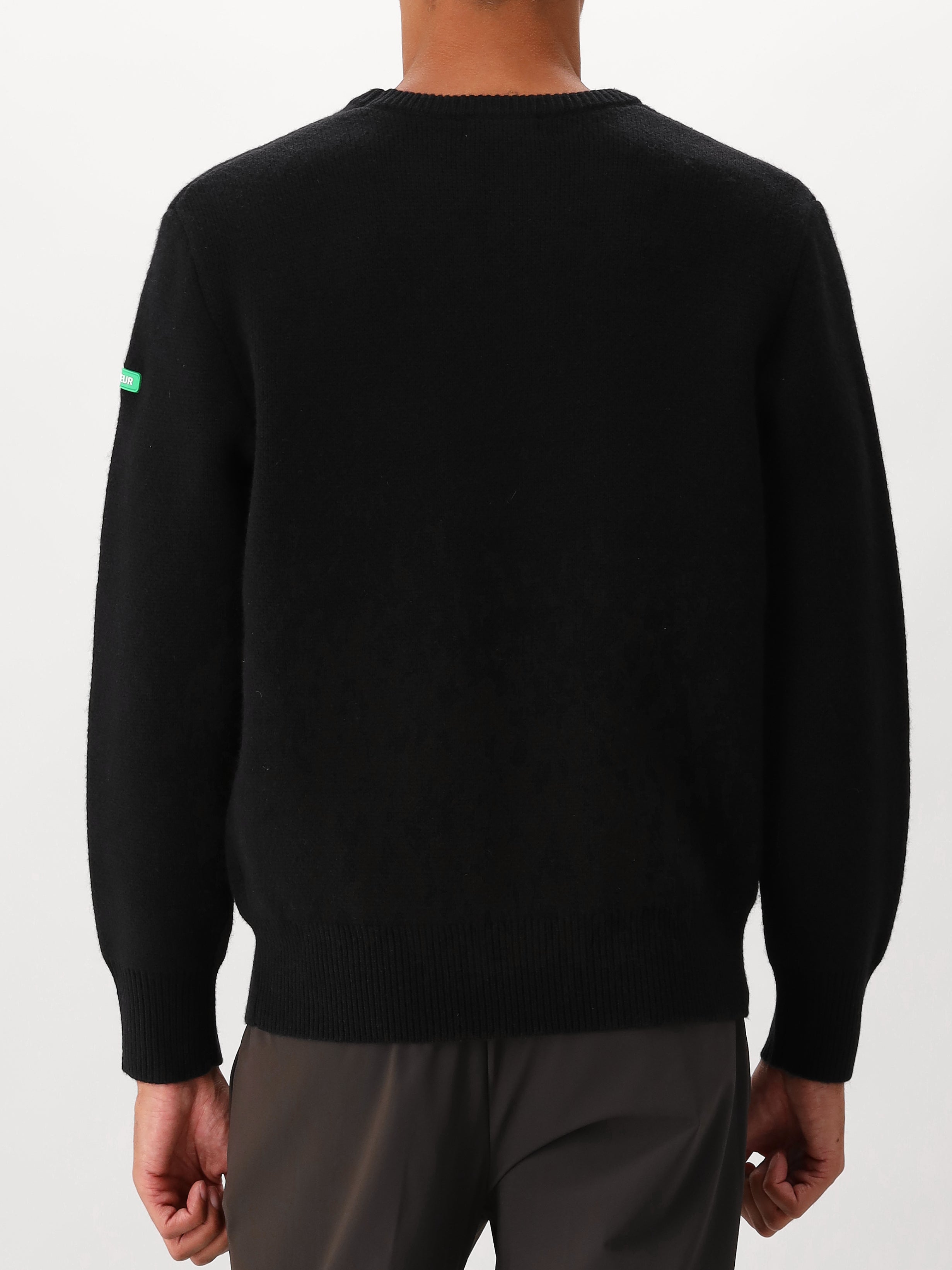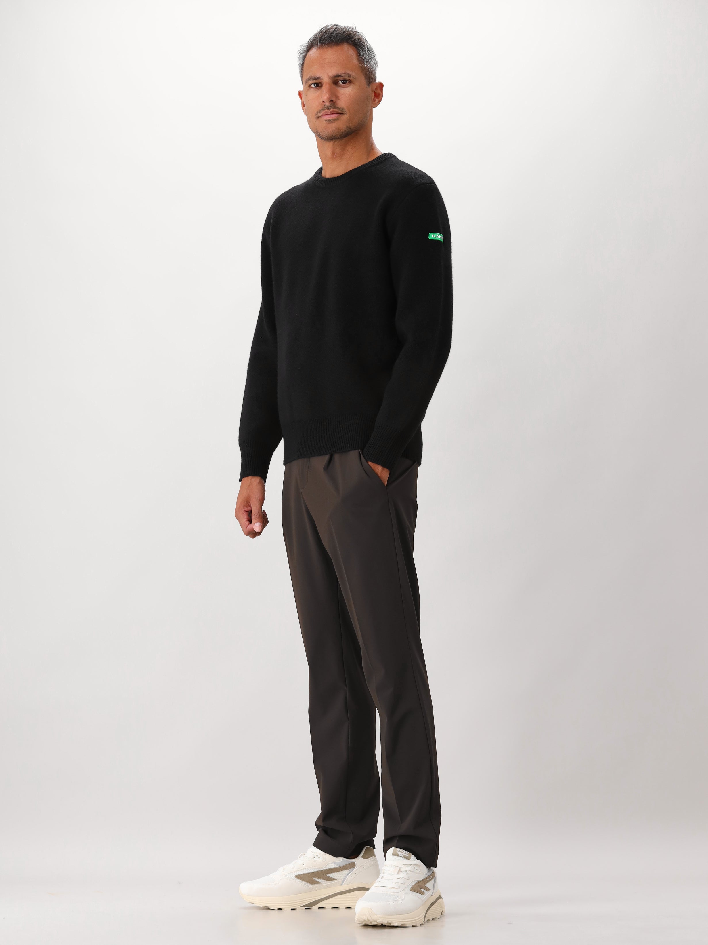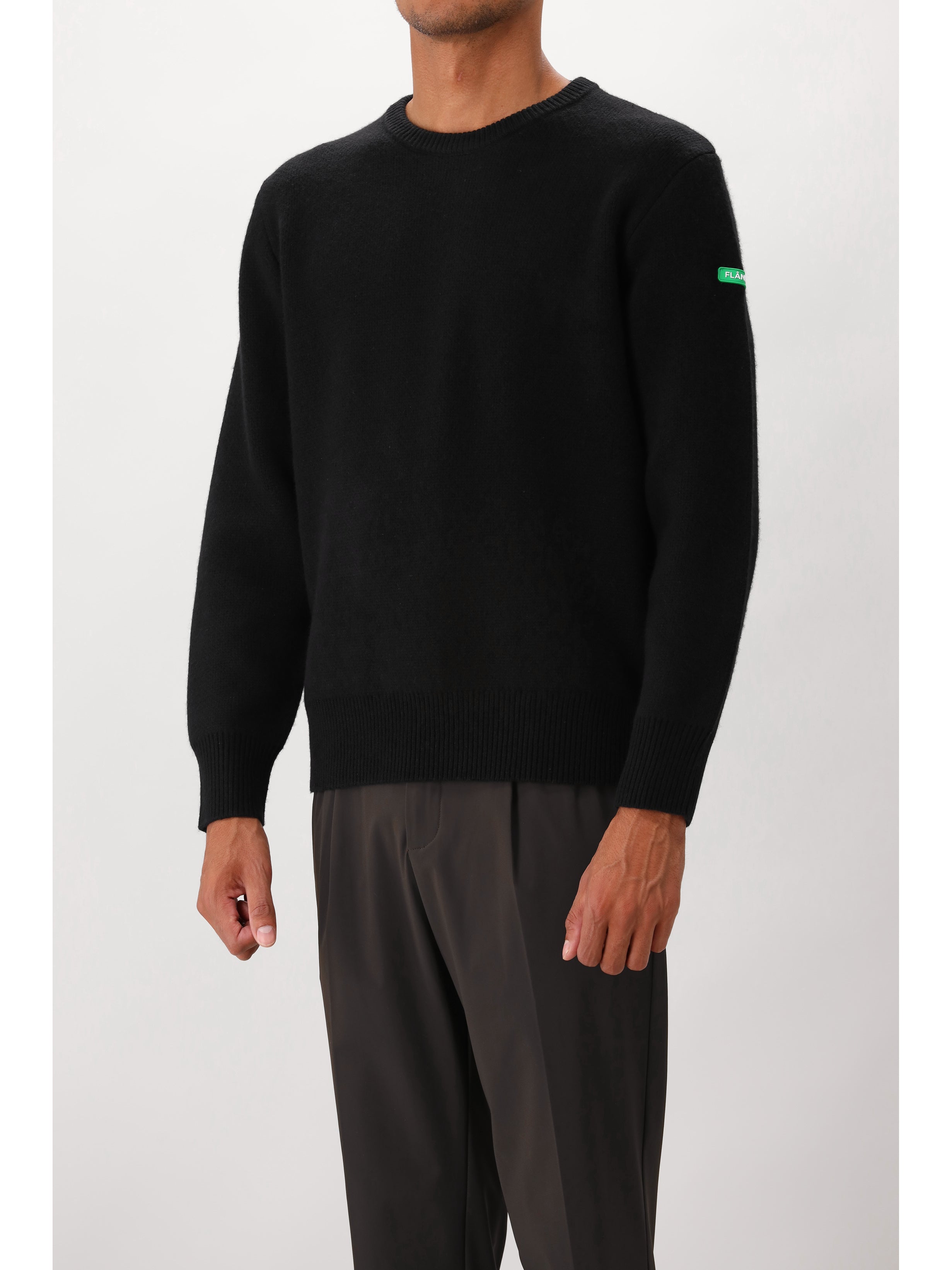 Deze zwarte gebreide trui van Flâneur heeft een tijdloze uitstraling. Op de linkermouw vind je een groene badge met daarop het logo terug. De trui heeft een clean look en kan gemakkelijk gestijld worden op verschillende broeken.