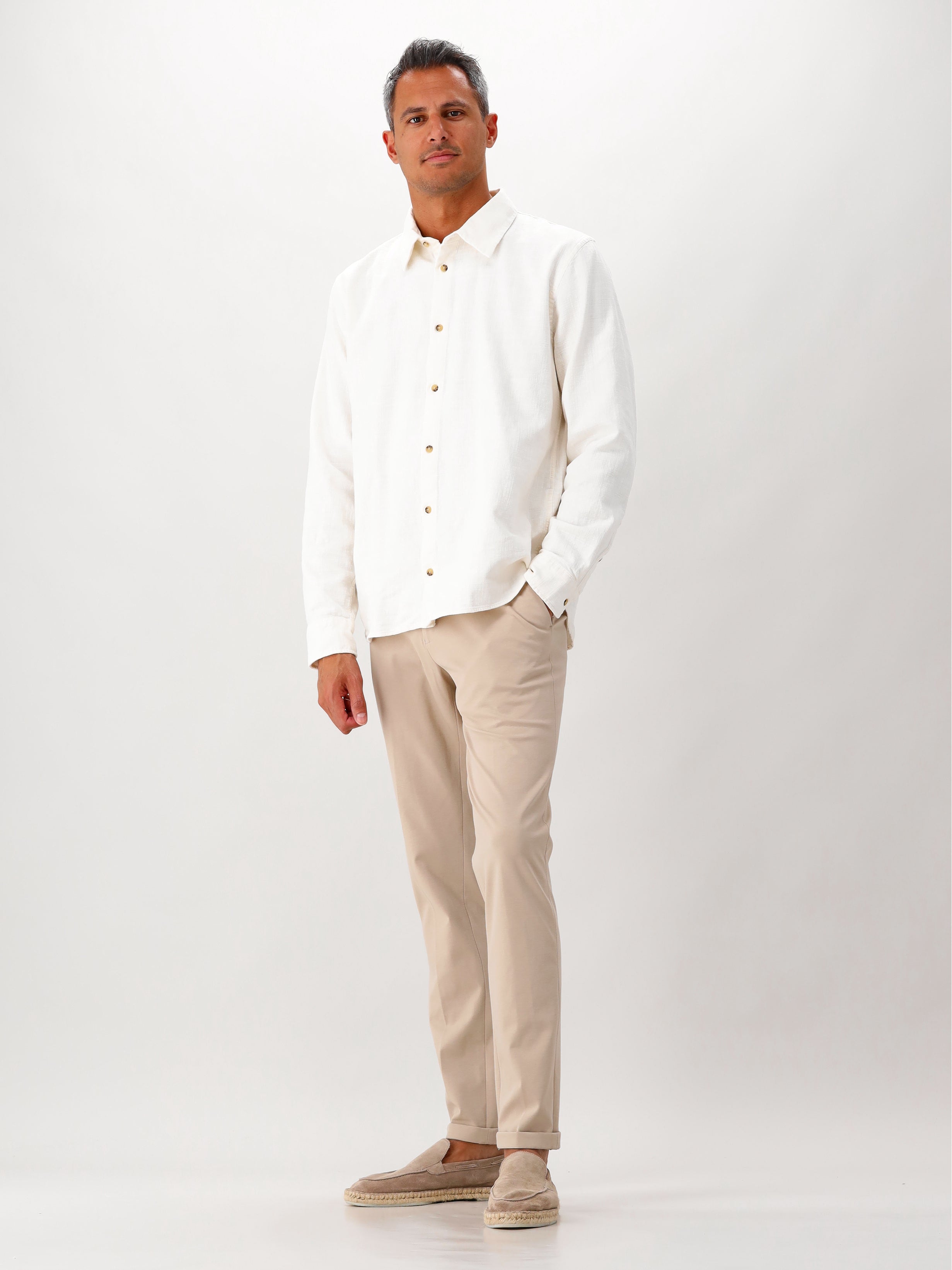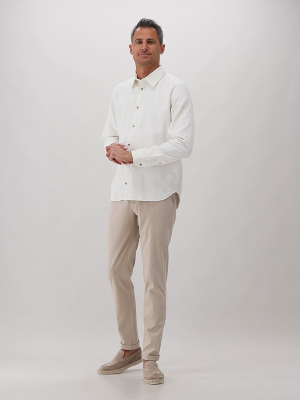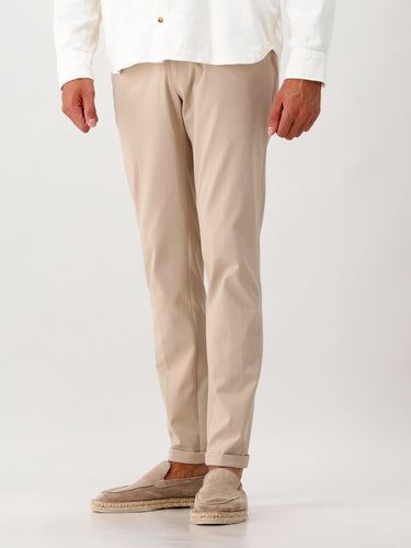 De Genti pantalon in lichtbruin/beige is een moderne en veelzijdige keuze. Deze pantalon heeft een rechte pasvorm en is vervaardigd uit een hoogwaardige katoenmix met een lichte stretch, wat zorgt voor zowel comfort als een scherpe uitstraling. De broek is voorzien van een klassieke tailleband met riemlussen, schuine steekzakken en achterzakken.