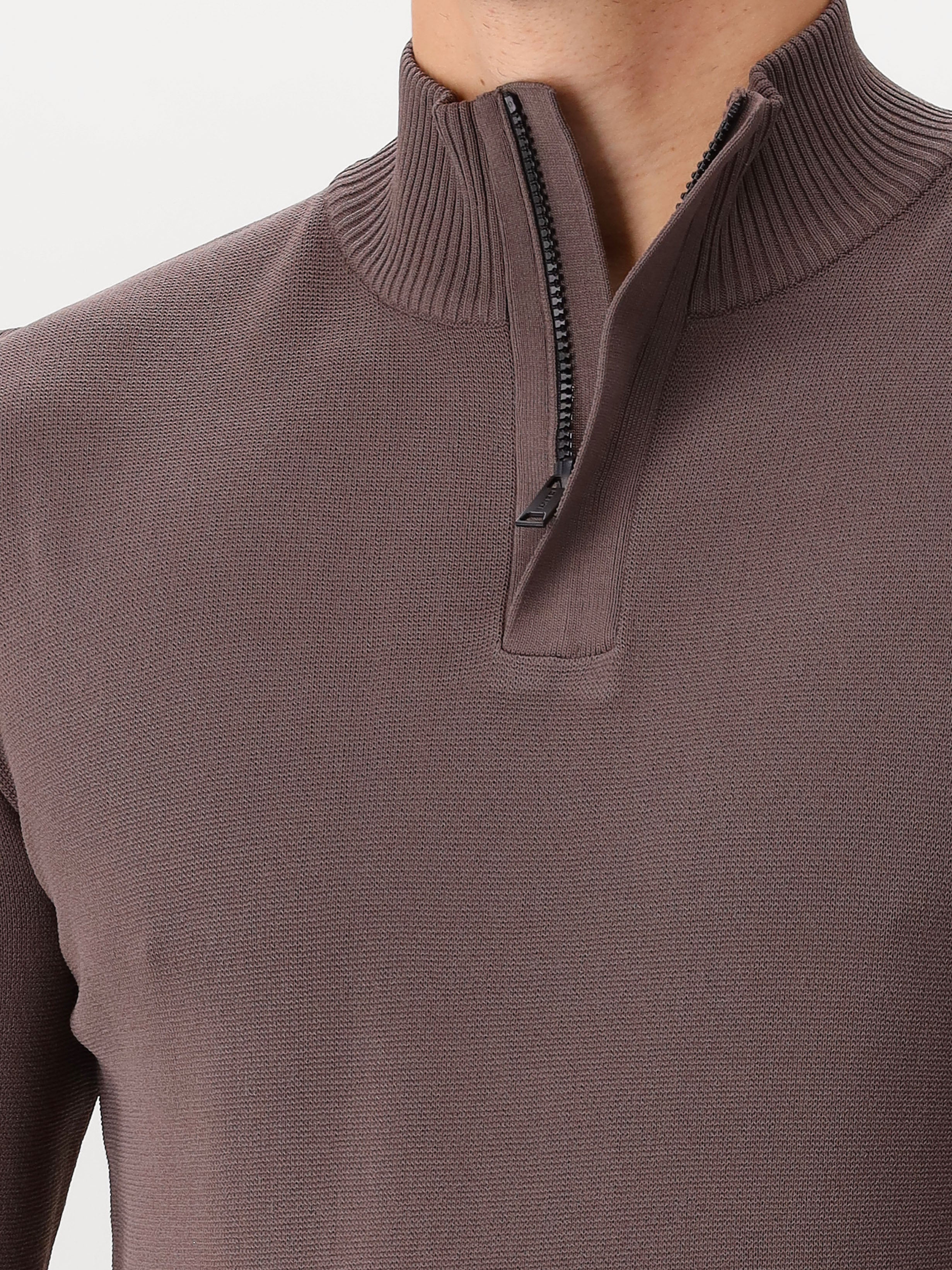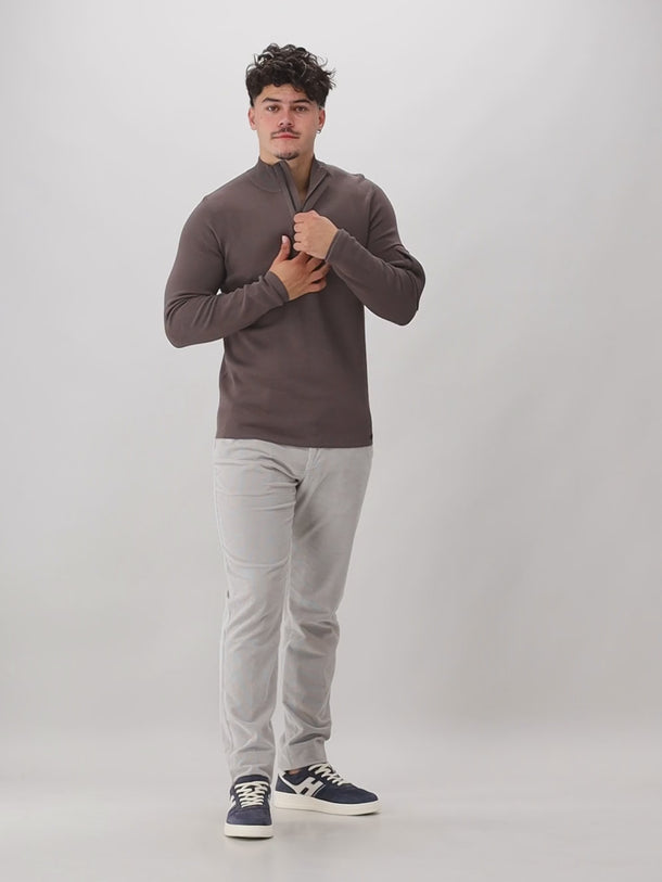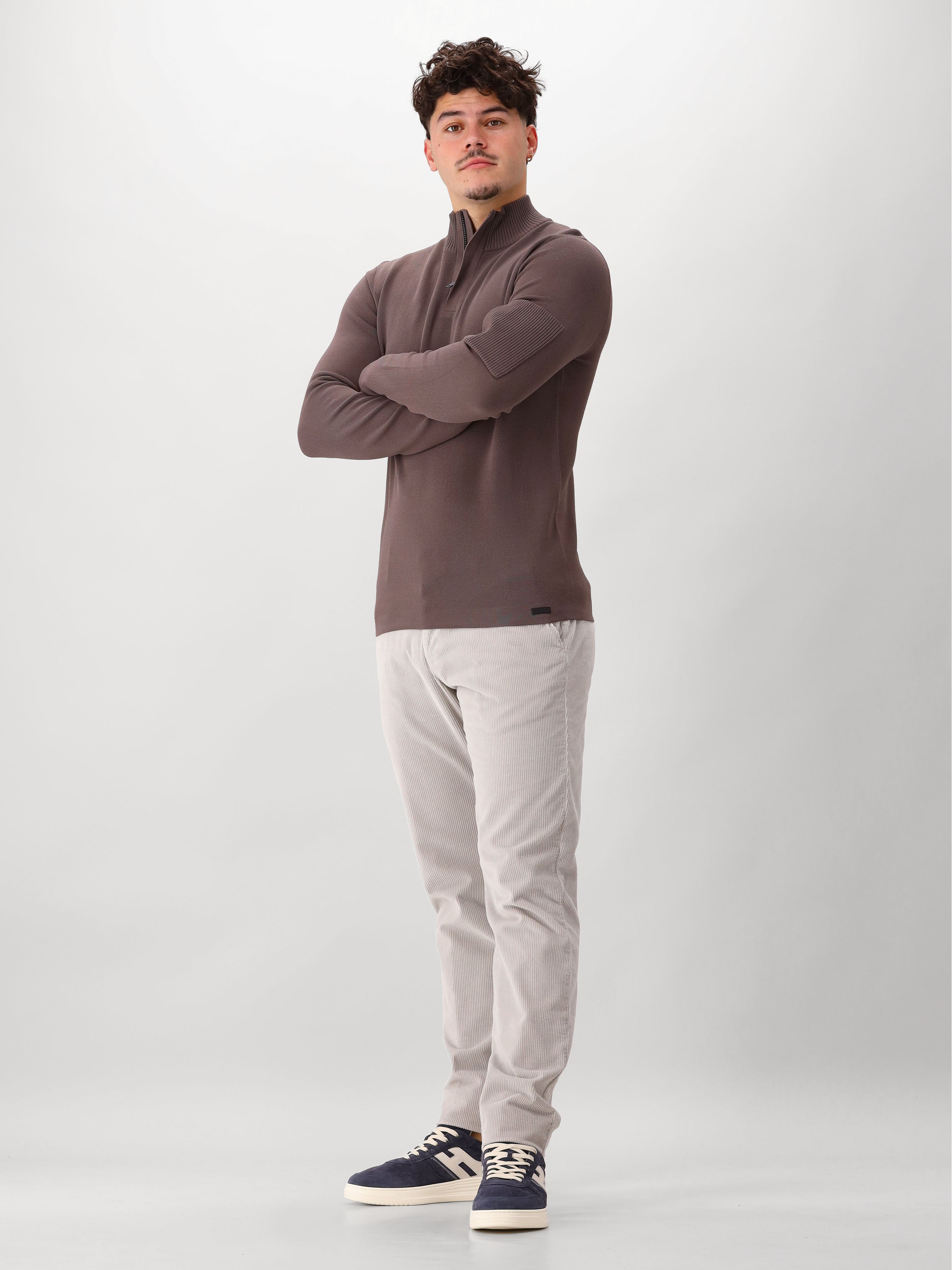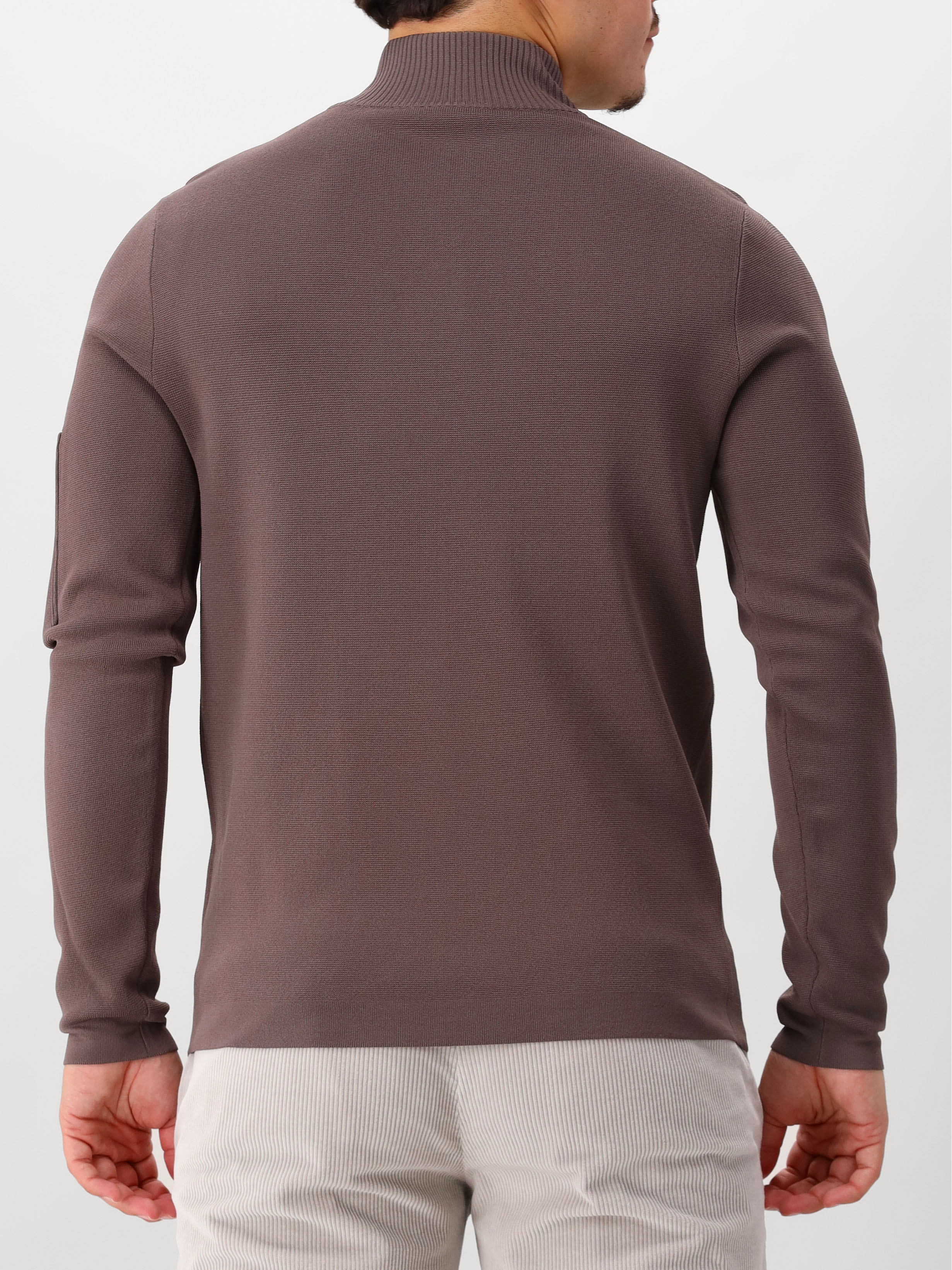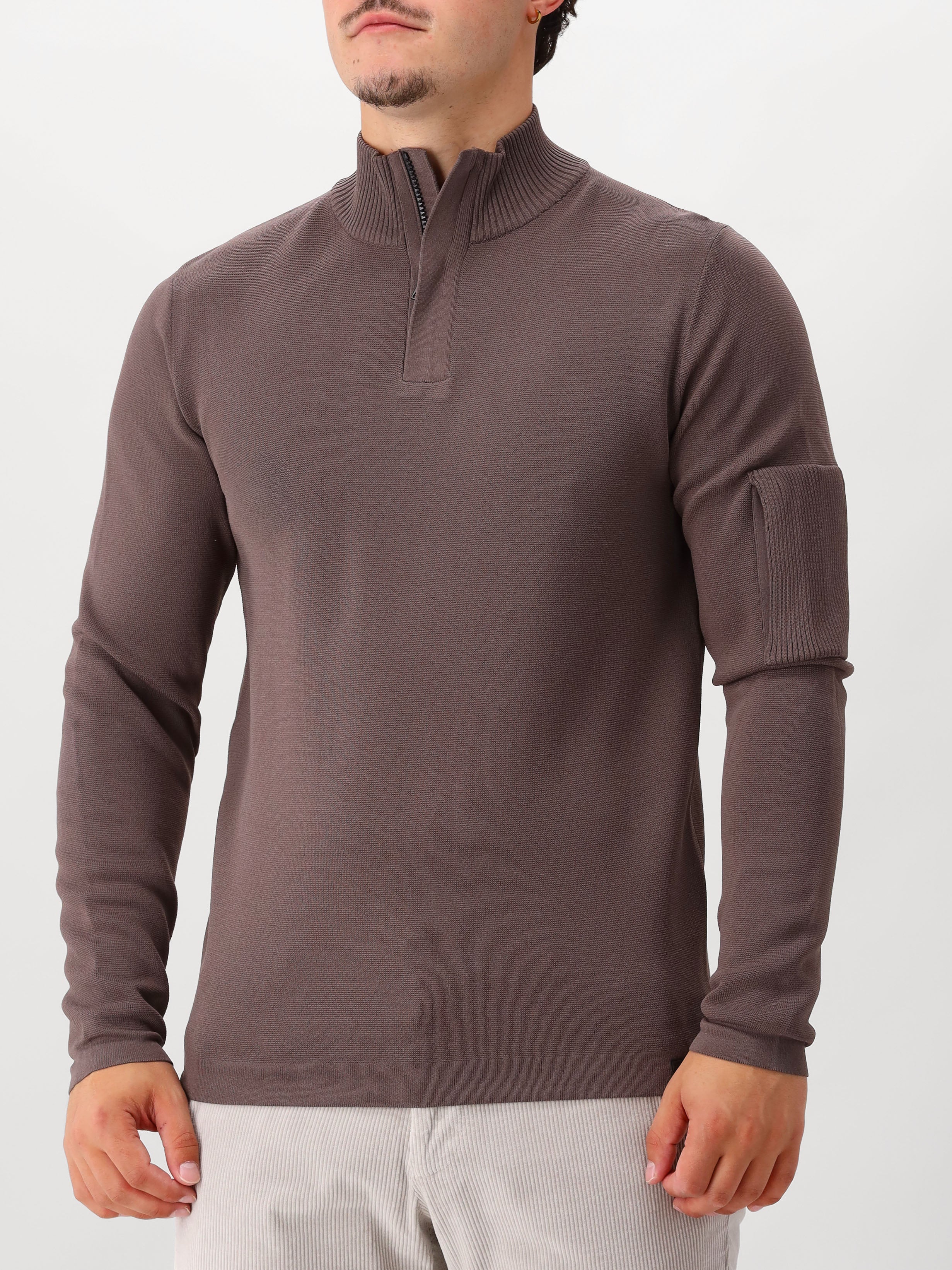 Deze bruine gebreide half-zip van Genti is stijlvol en tijdloos. Op de linkermouw zit een kleine zak die gesloten wordt met een rits. De trui bestaat uit een mix van viscose en polyamide, dit zorgt voor comfort en een getailleerde fitting.