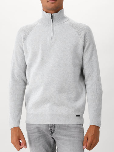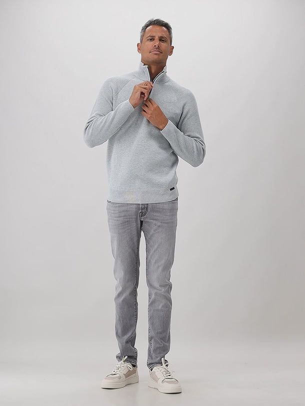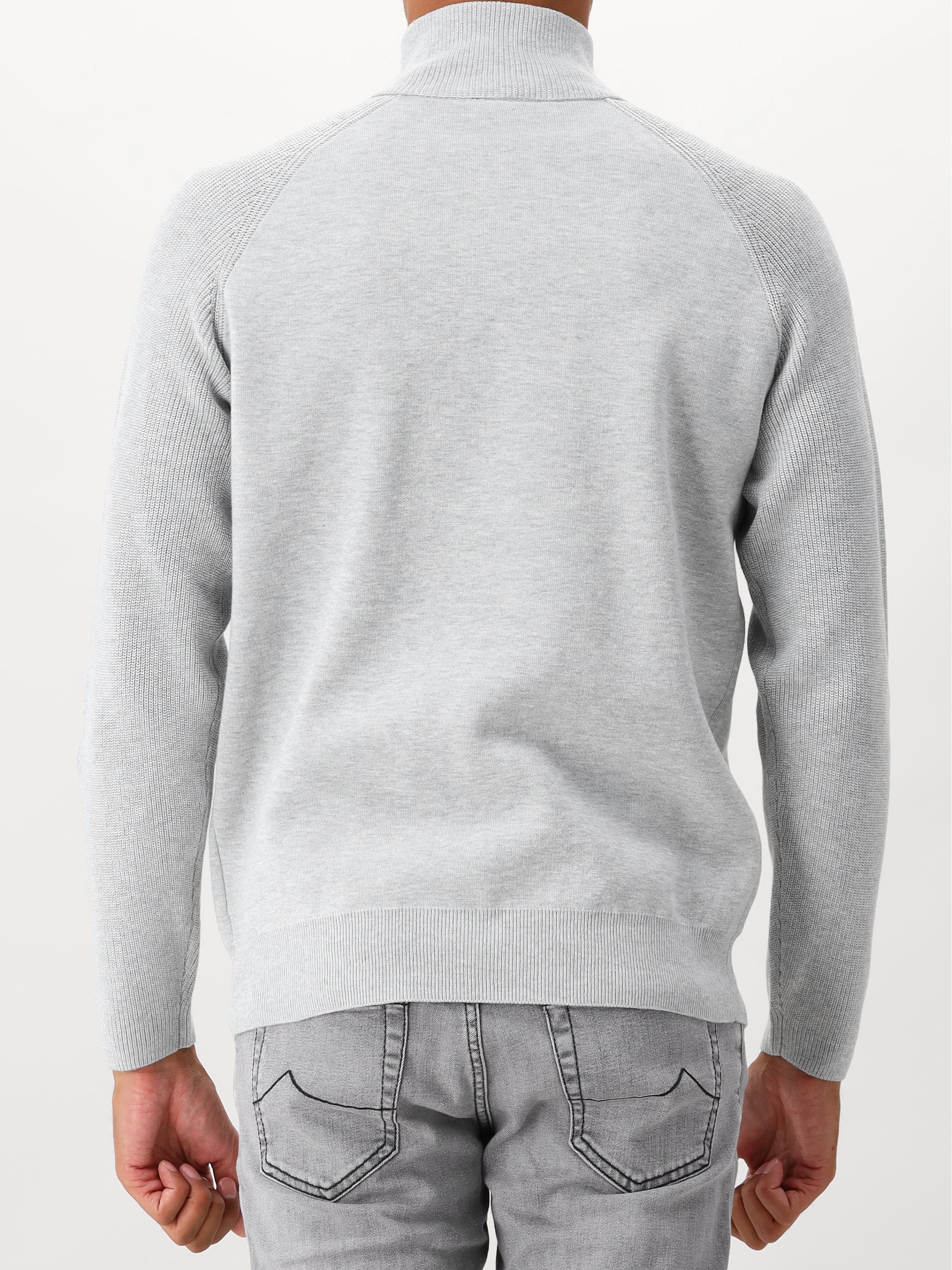 Deze grijze gebreide trui van Genti bestaat uit een mix van katoen en polyamide. De trui heeft een halve rits en aan de onderzijde vind je een merkpatch terug.