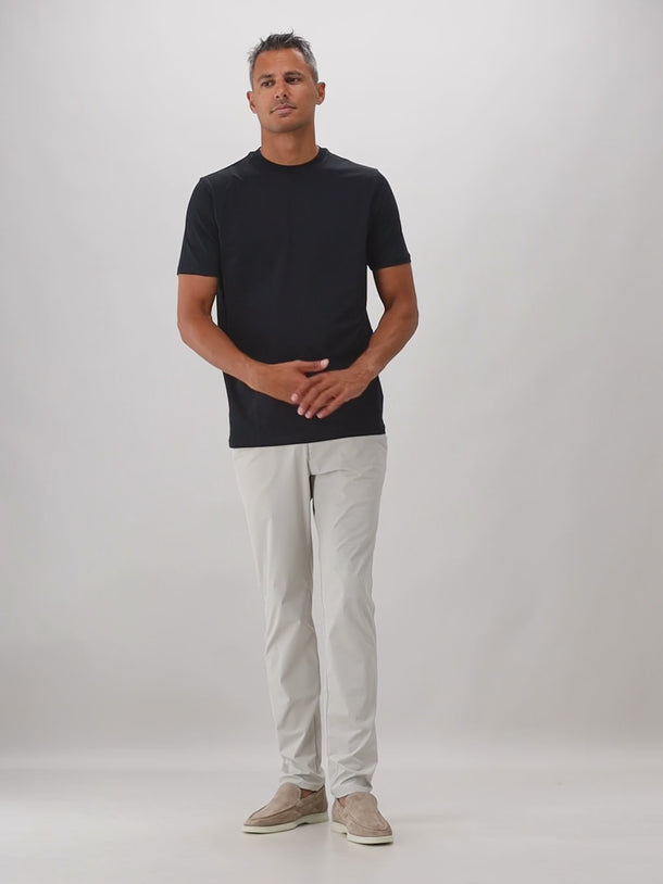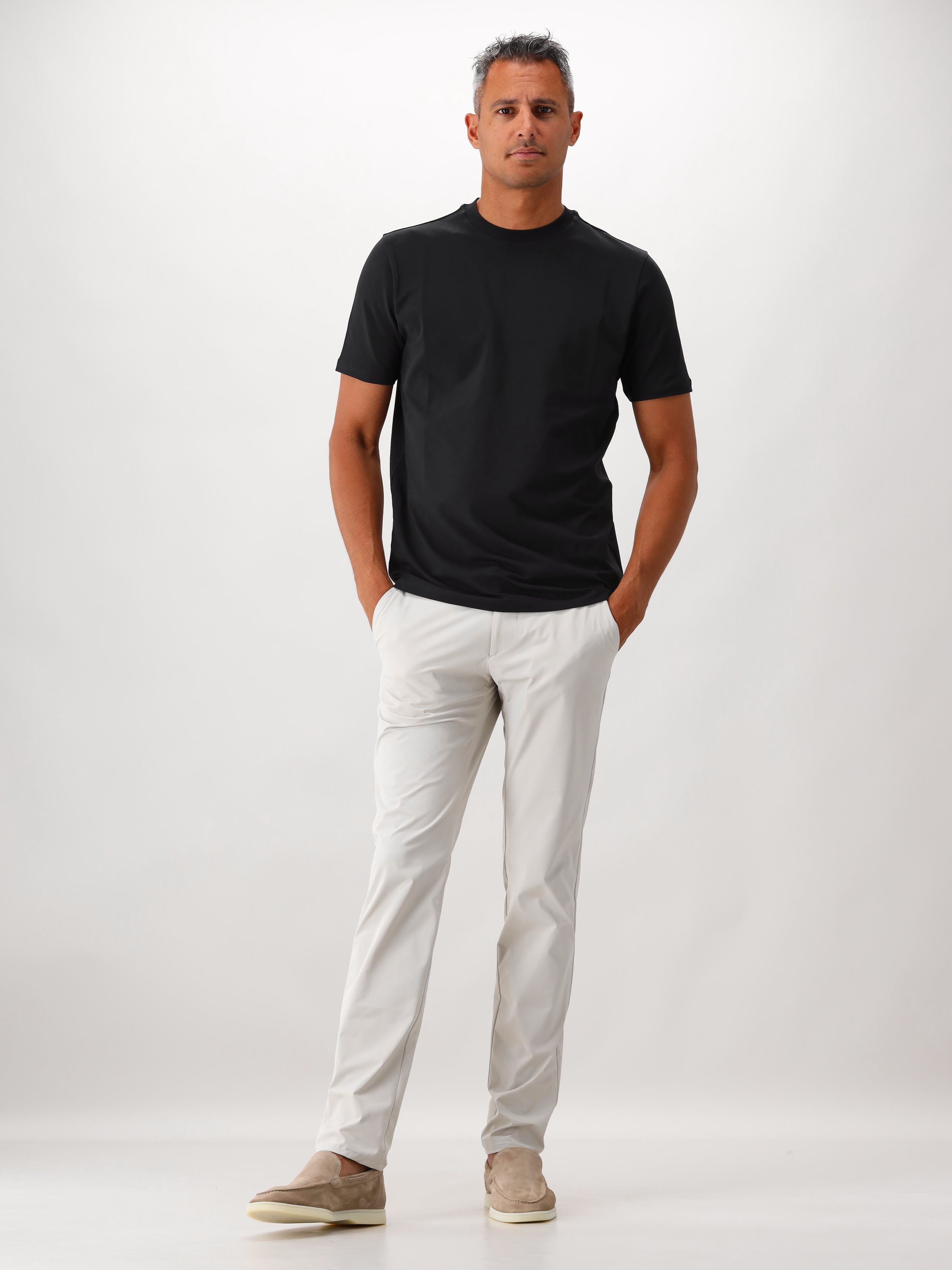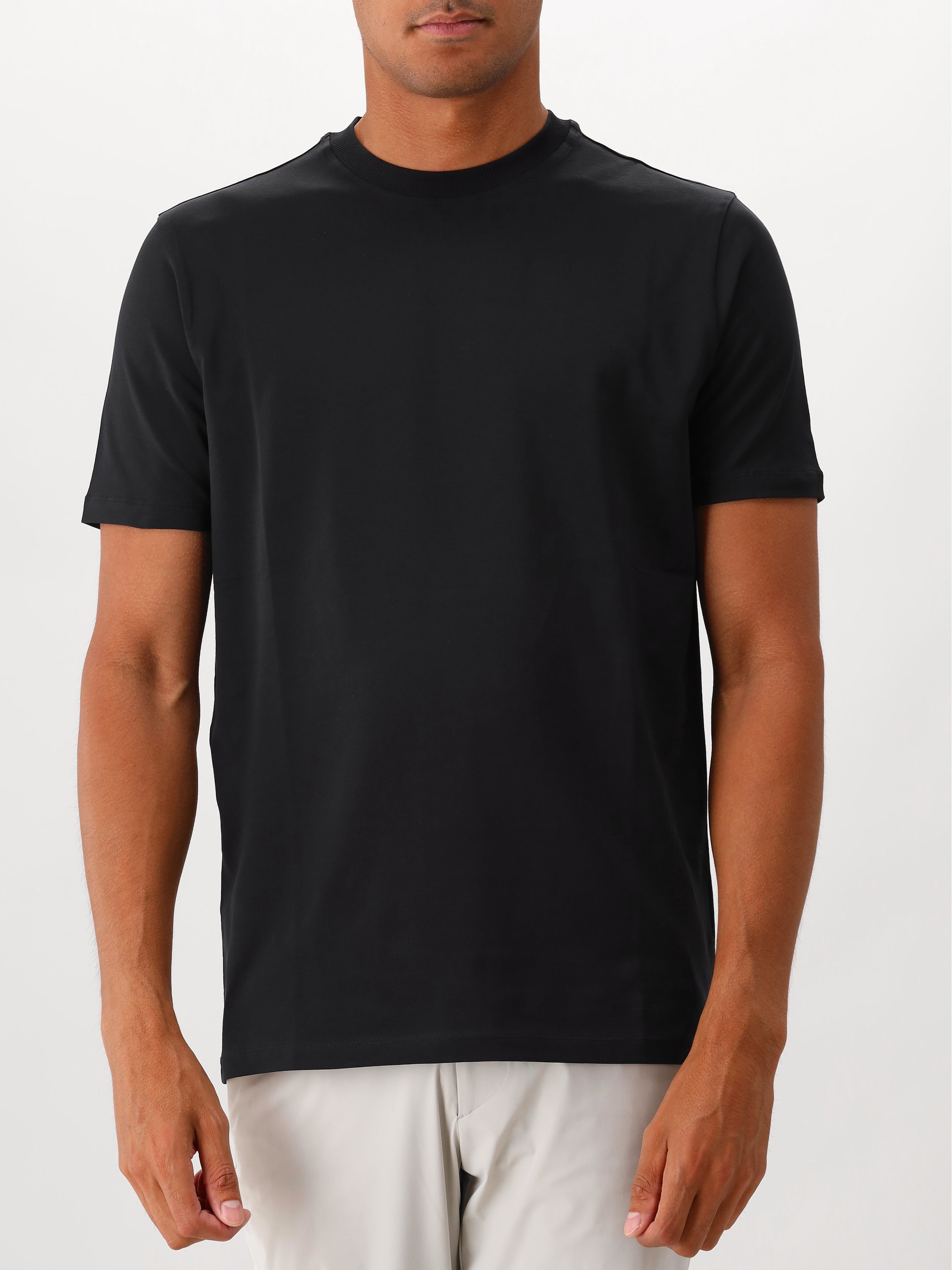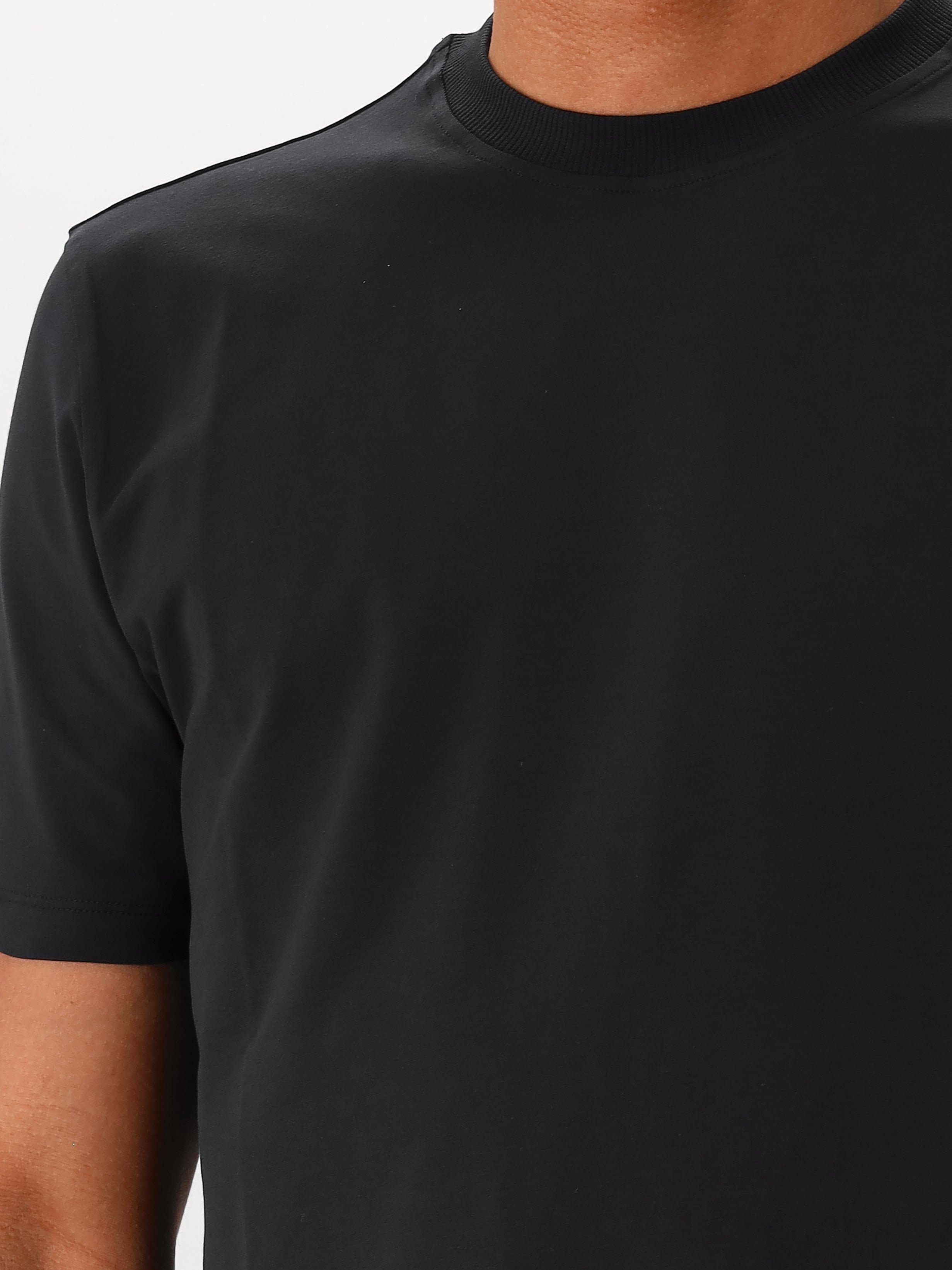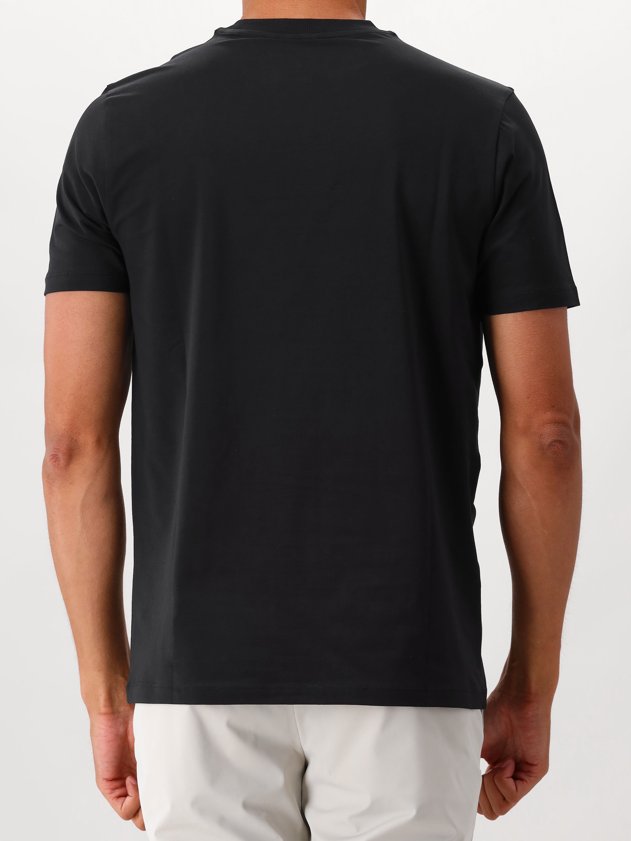 Dit zwarte T-shirt is een echte must-have. Een basic die iedereen in de kast zou moeten hebben, de perfecte basis voor talloze outfits. Het shirt heeft een zwarte kleur, een regular fit en een ronde hals. Er zijn geen merklogo’s zichtbaar, maar het is gemaakt van katoen en elastaan, wat zorgt voor een comfortabele pasvorm.