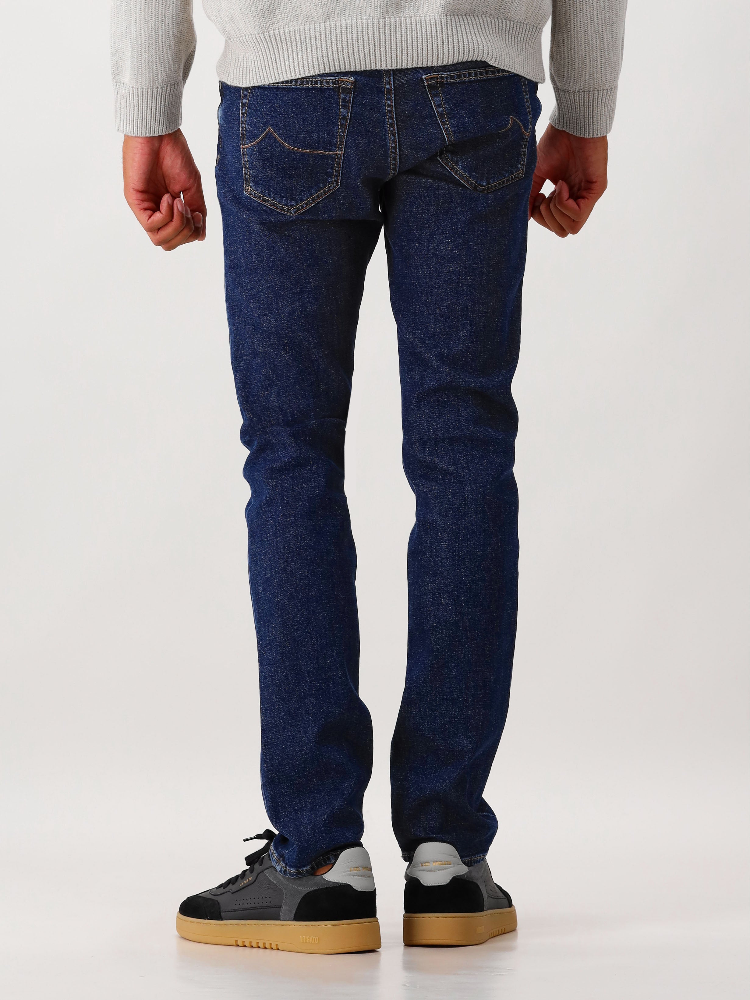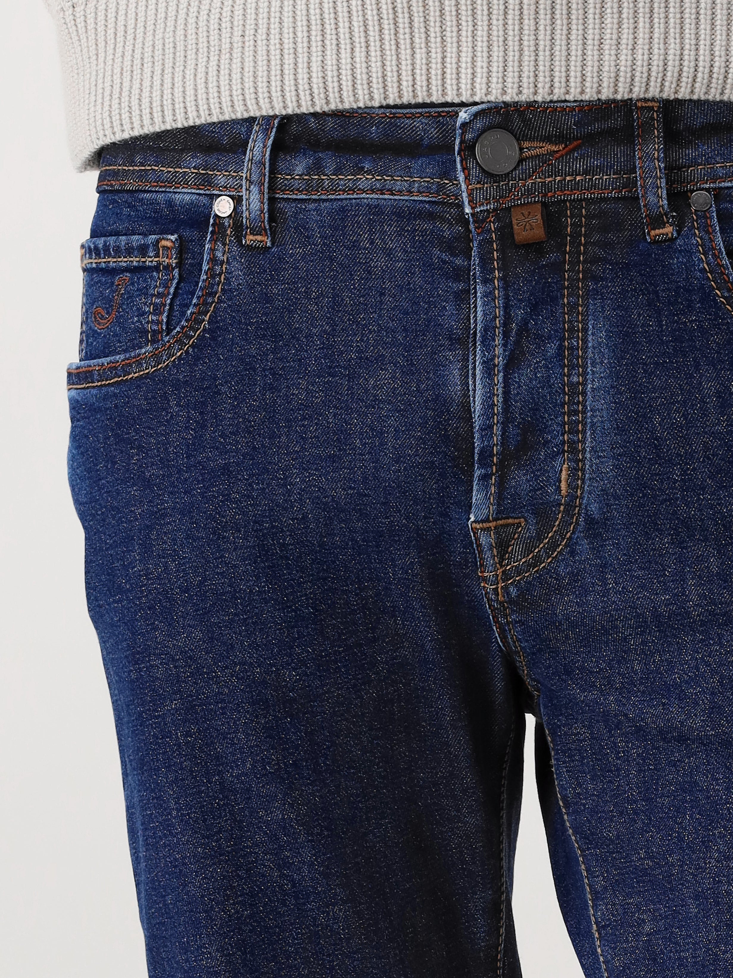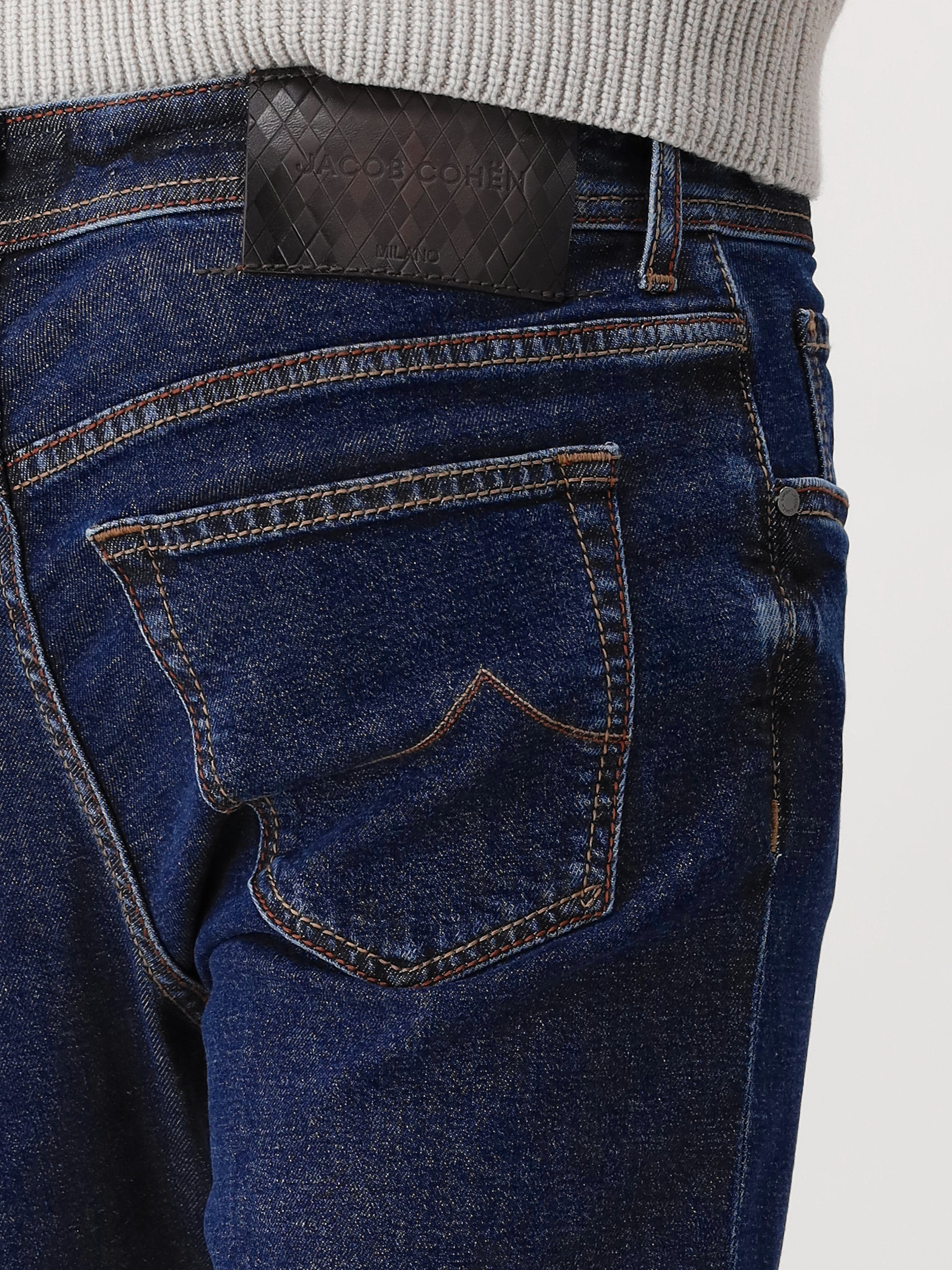 Deze donkerblauwe jeans van Jacob Cohen sluit met knopen, waarbij het merklogo subtiel zichtbaar is. De broek is voorzien van meerdere zakken en heeft op de achterkant een zwart merkembleem. Dankzij de mix van katoen en elastaan bevat de jeans stretch, waardoor hij niet alleen stijlvol, maar ook zeer comfortabel is om te dragen.