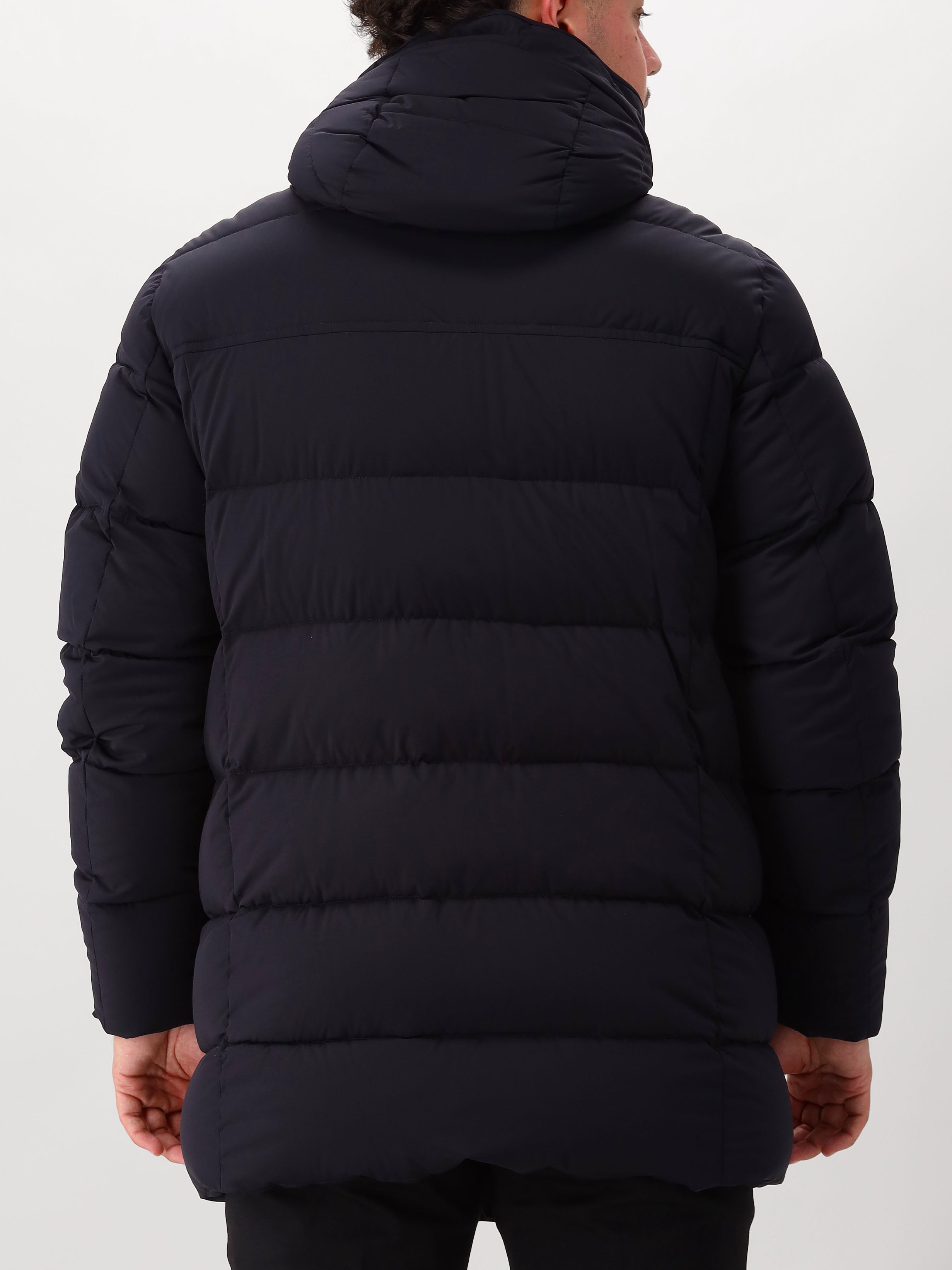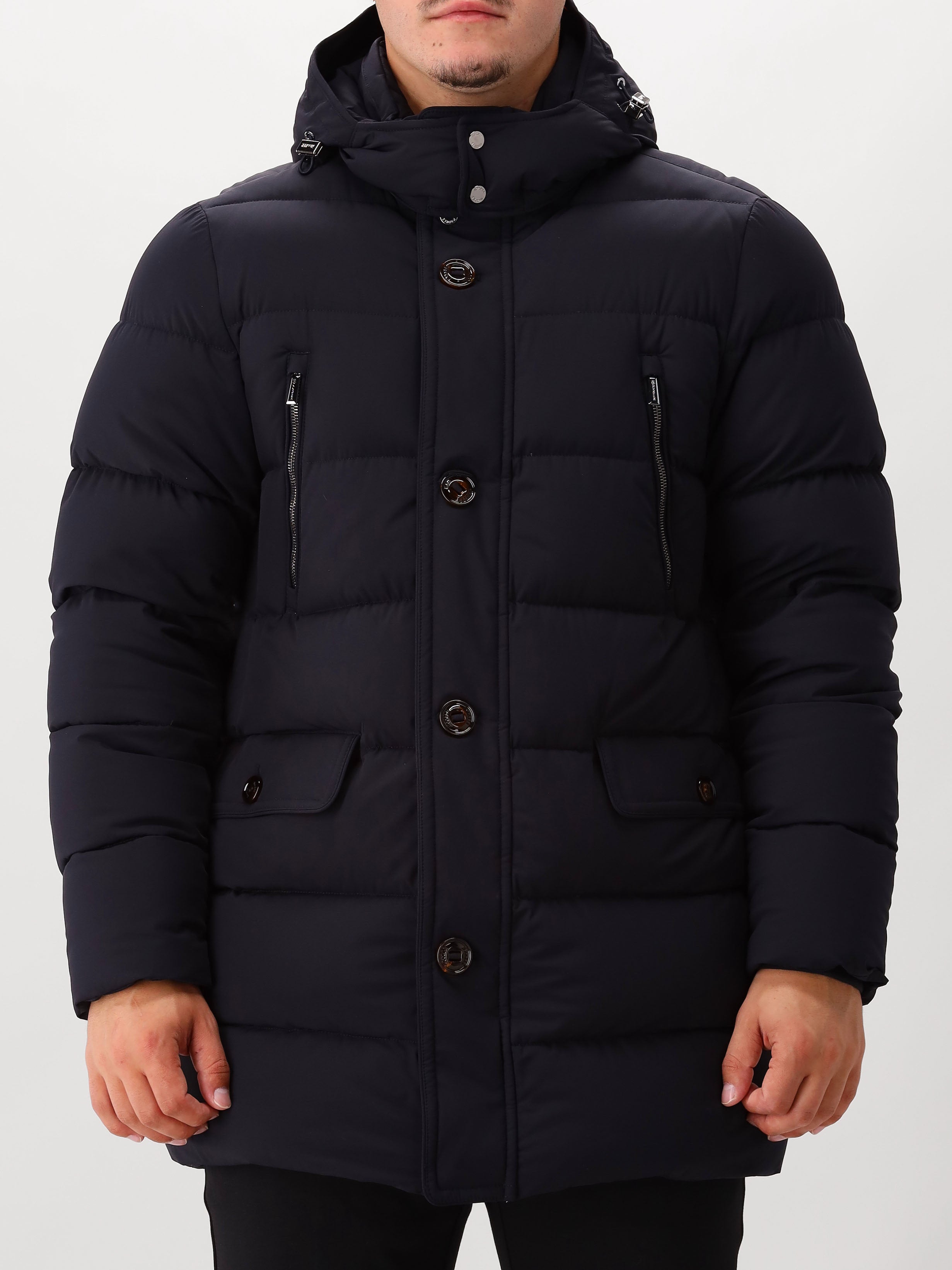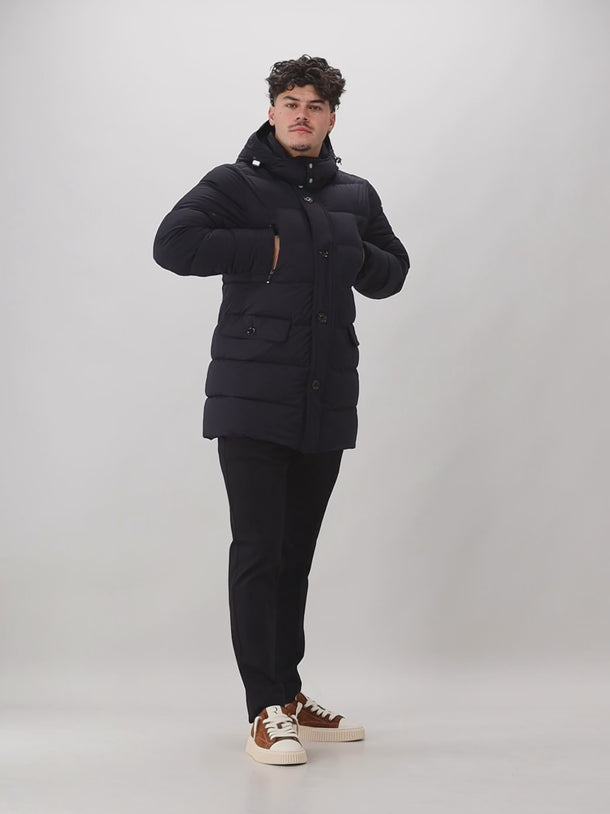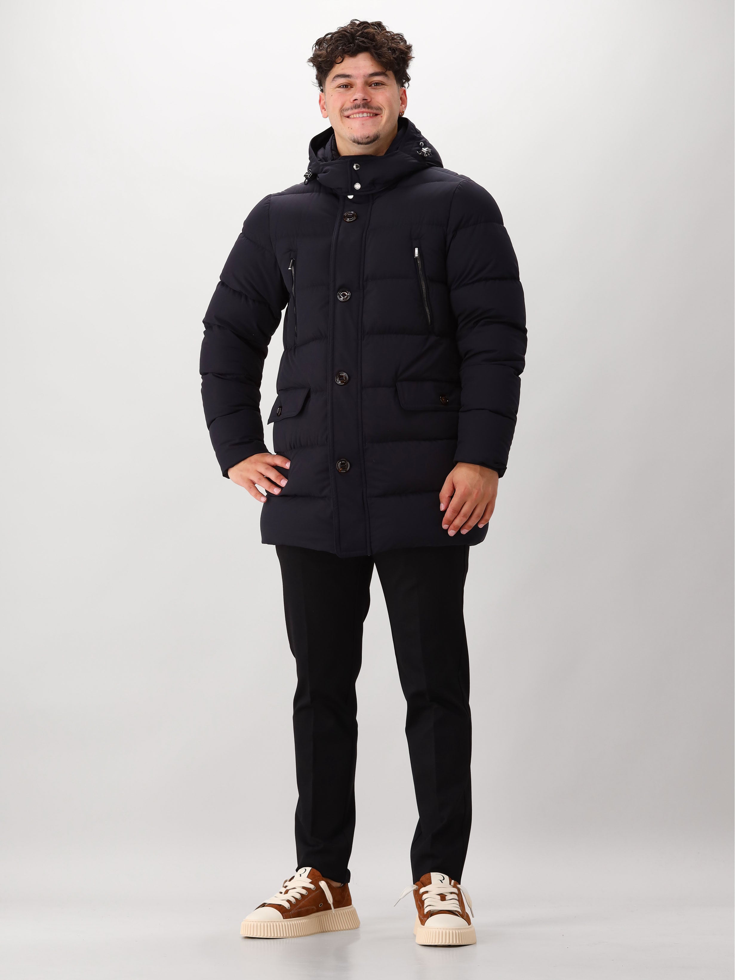 Deze exclusieve jas van Moorer heeft een donkerblauwe, bijna zwarte kleur. De jas heeft kleine merkdetails op de knopen en ritsen van de jas. De jas is gevuld met de meest verfijnde dons die jou op ieder moment comfortabel maken.