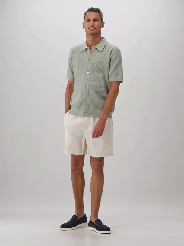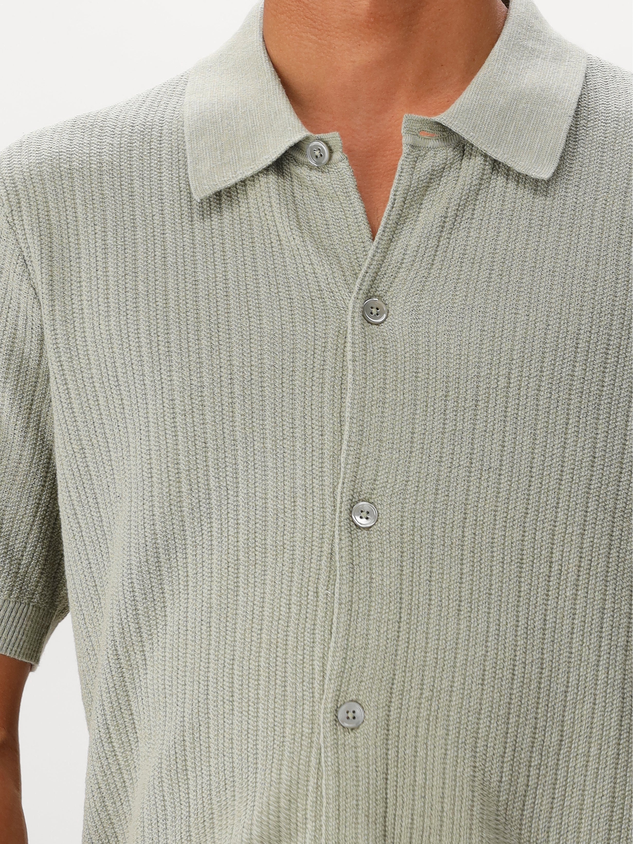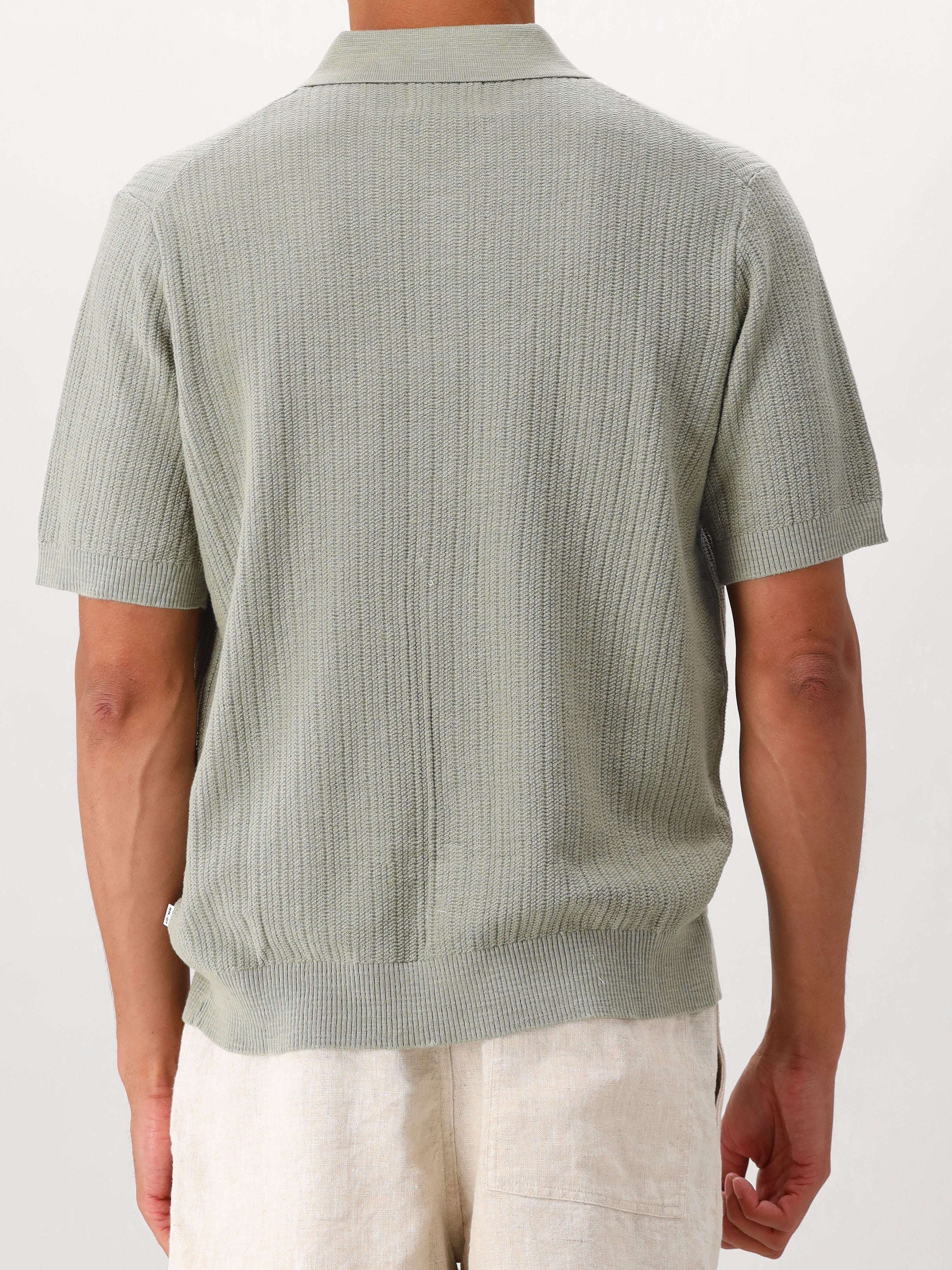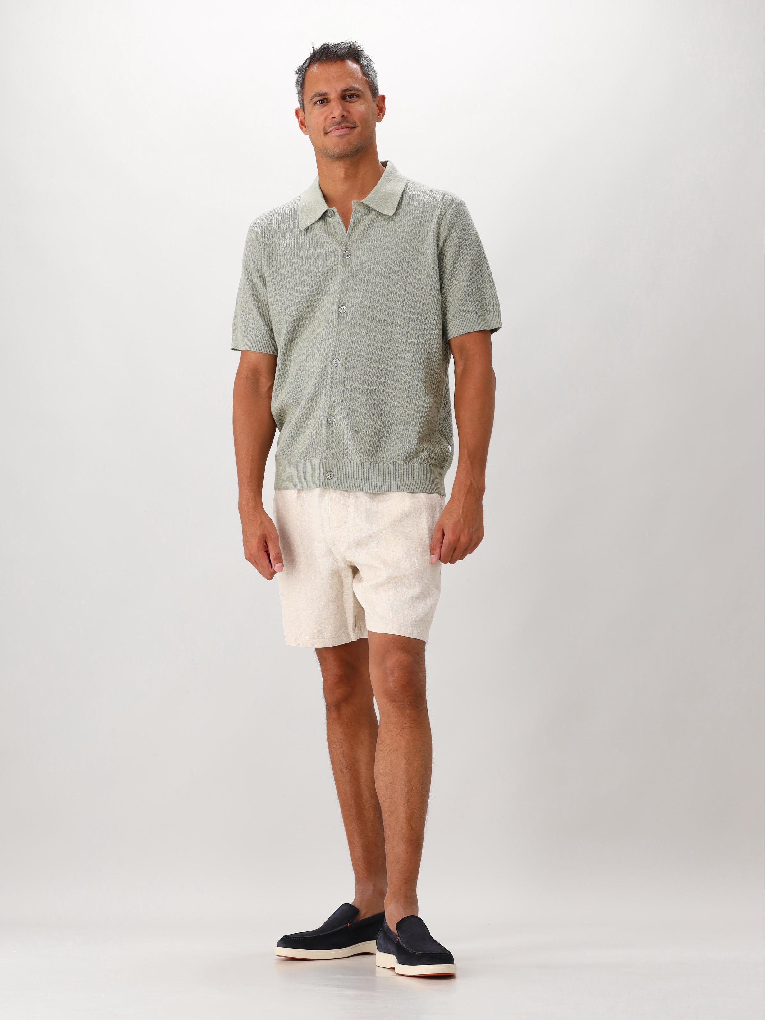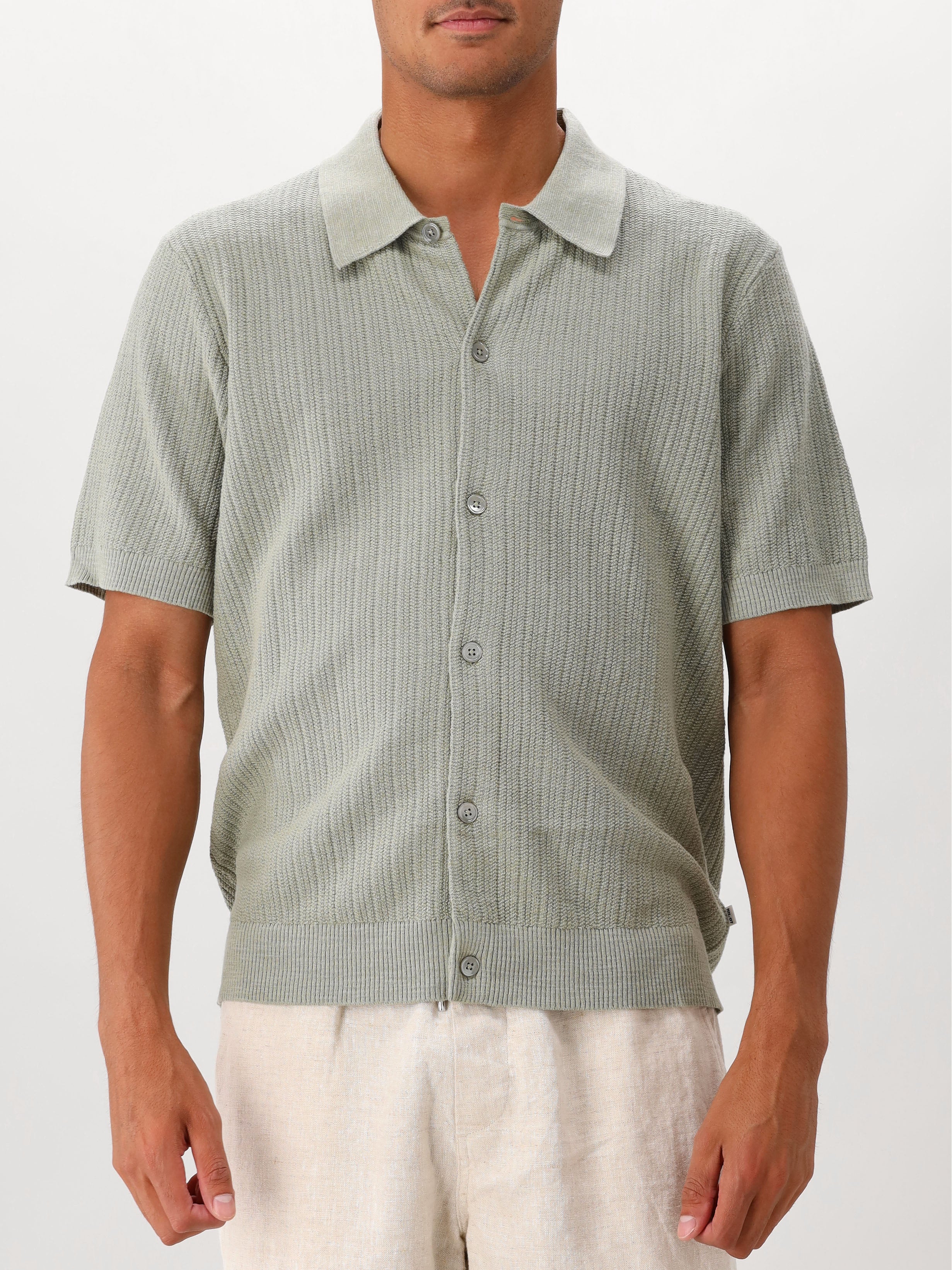 De NN.07 Nolan Cardigan 6695 in groen is een stijlvolle herenpolo met een open kraag en korte mouwen. Het kledingstuk heeft een subtiele ribstructuur, wat zorgt voor een verfijnde uitstraling. Het is gemaakt van ademend, organisch katoen, waardoor het comfortabel is om te dragen. De knoopsluiting aan de voorkant voegt een klassieke touch toe aan dit moderne ontwerp.