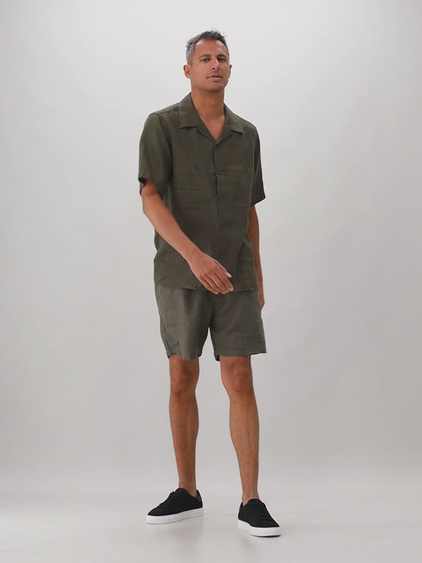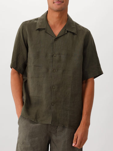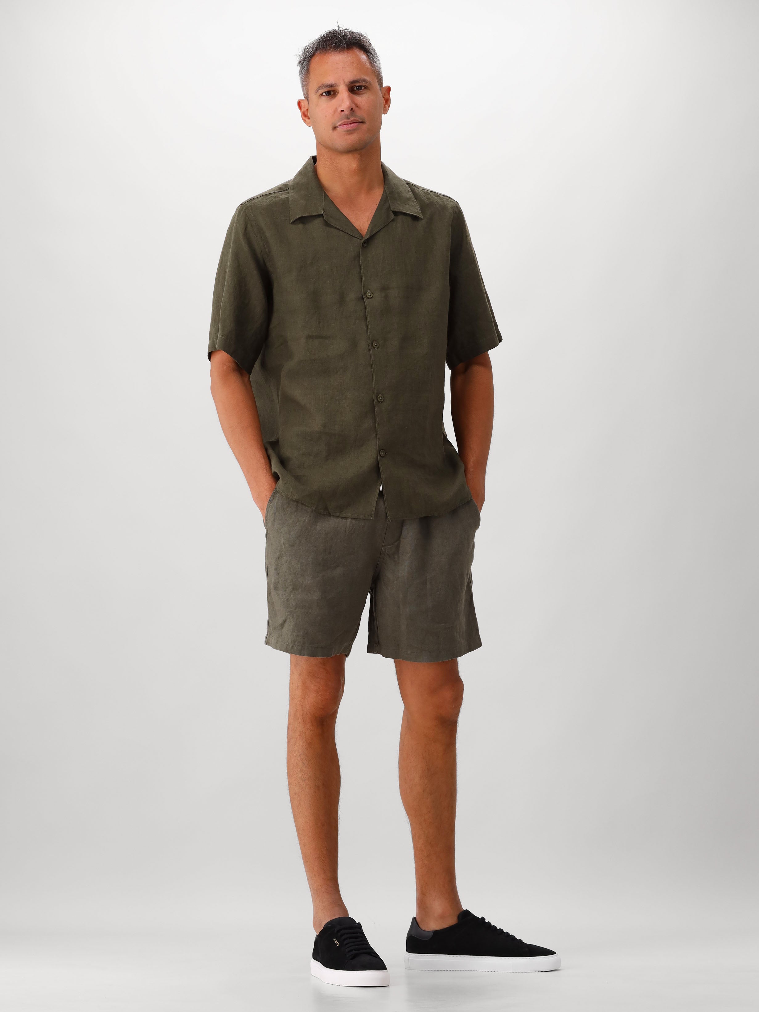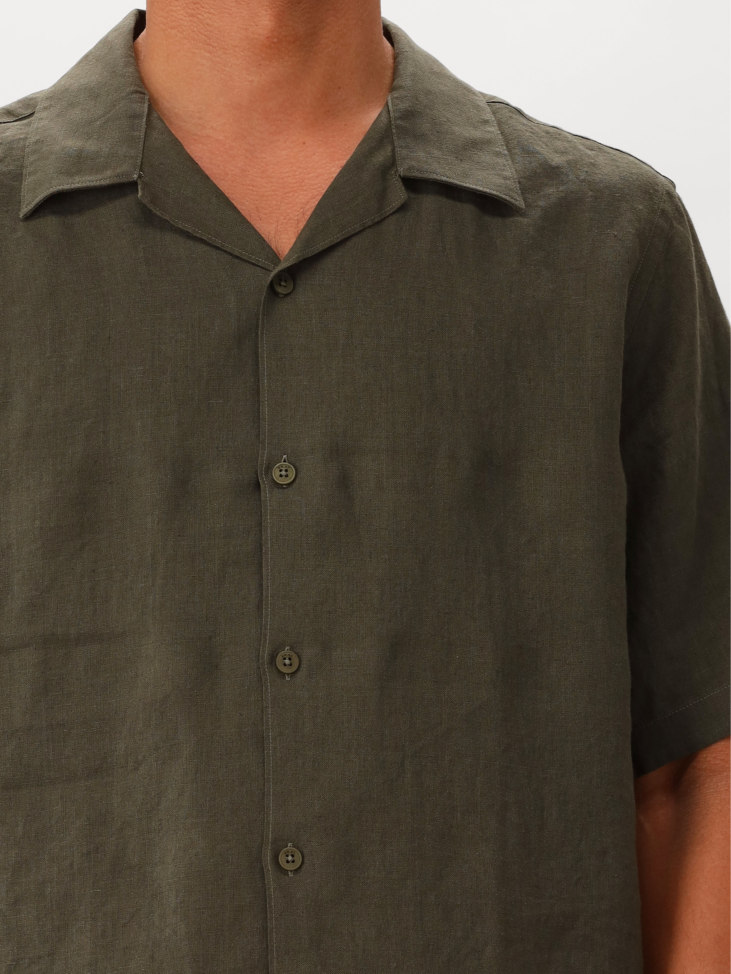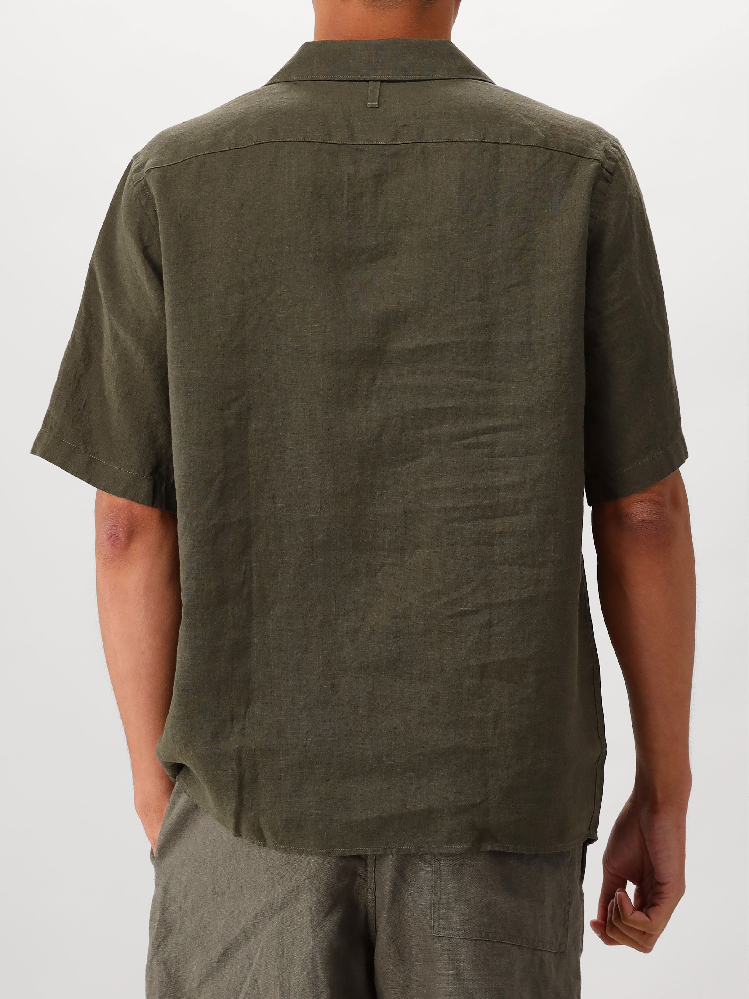 Het overhemd is gemaakt van 100% premium linnen, dat licht aanvoelt en goed ademt op warme dagen. Het heeft korte mouwen en een open, camp‑kraag die zorgt voor een relaxte, zomerse look. De kleur is een diepe, olijfgroene tint die makkelijk combineert met zowel lichte als donkere outfits. Het heeft een regular fit, valt normaal qua maat en is soepel dankzij de licht stevige linnenstructuur.