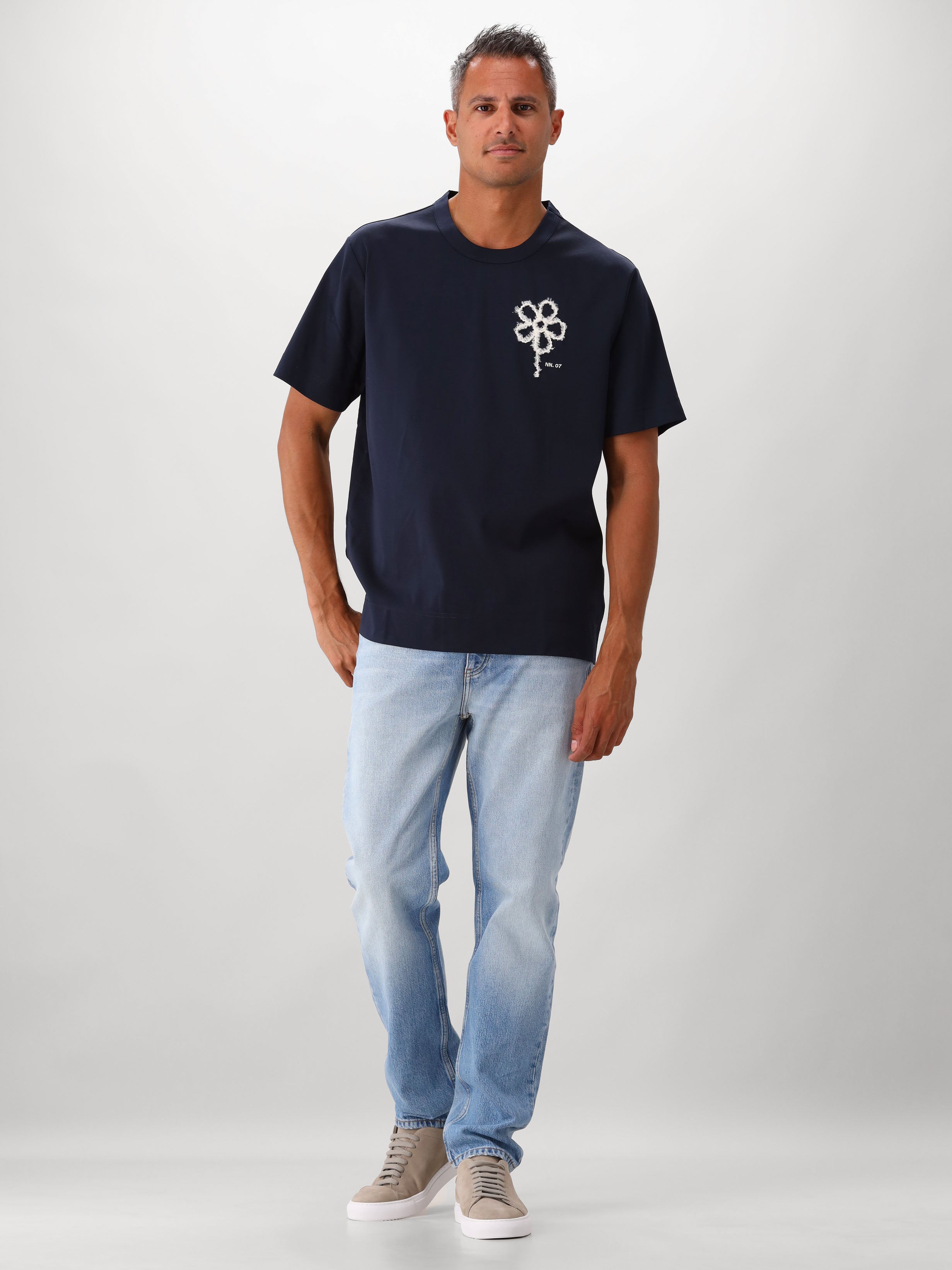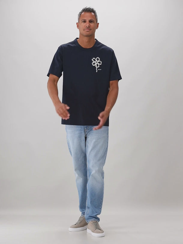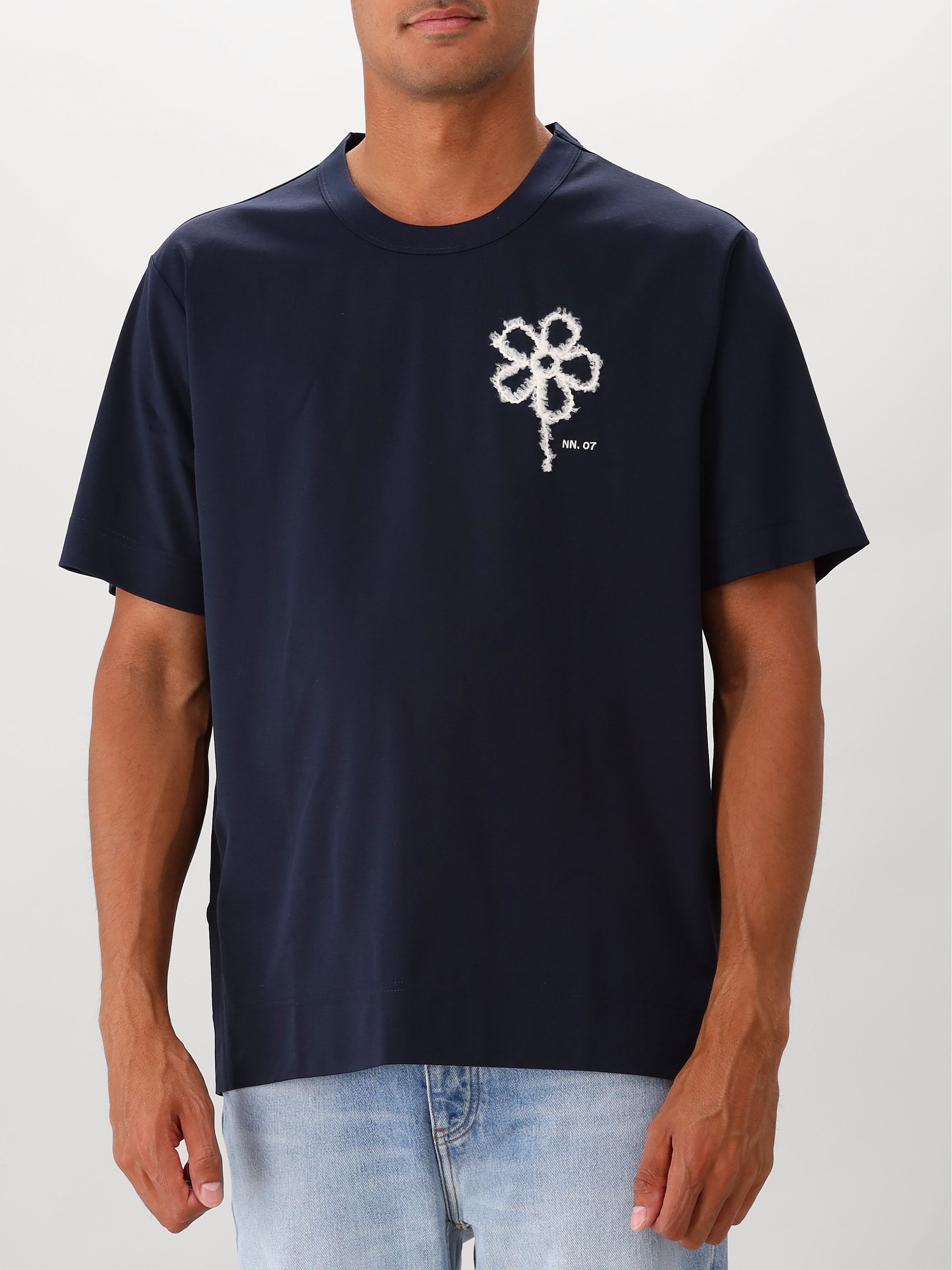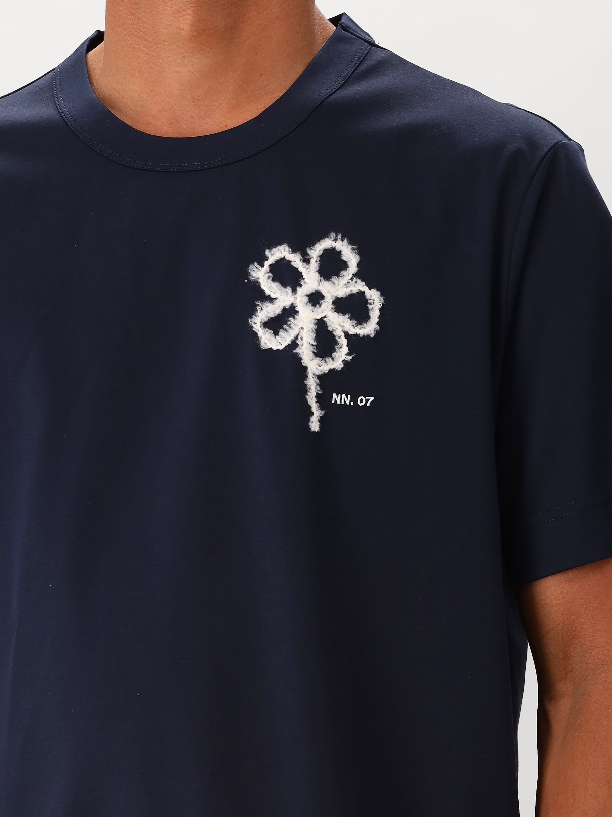 Dit blauwe T-shirt van NN.07 heeft een bloem geborduurd op de borst. Naast de bloem vind je in het klein het NN.07 logo terug. De blauwe kleur is gemakkelijk te stijlen op verschillende outfits.