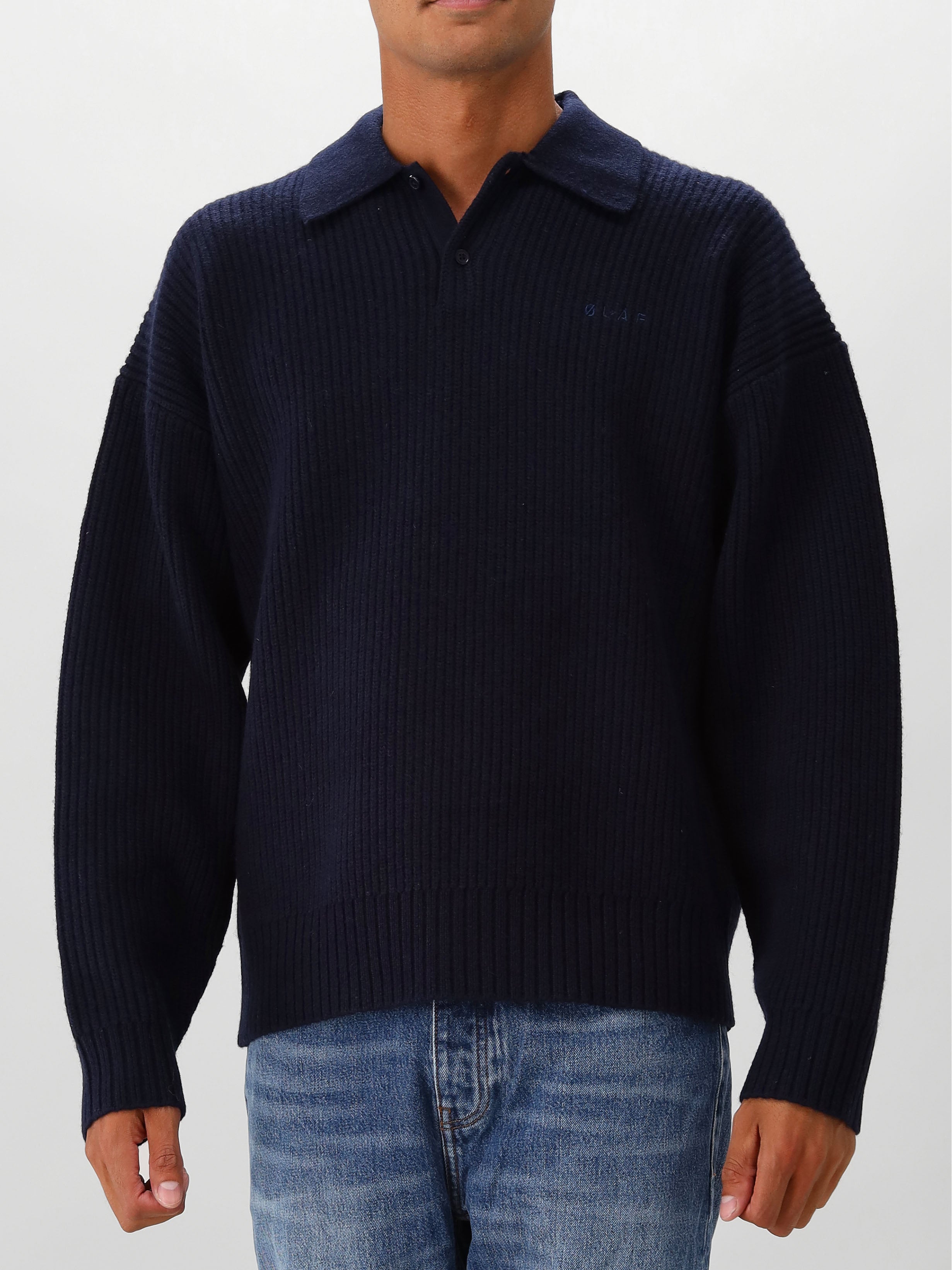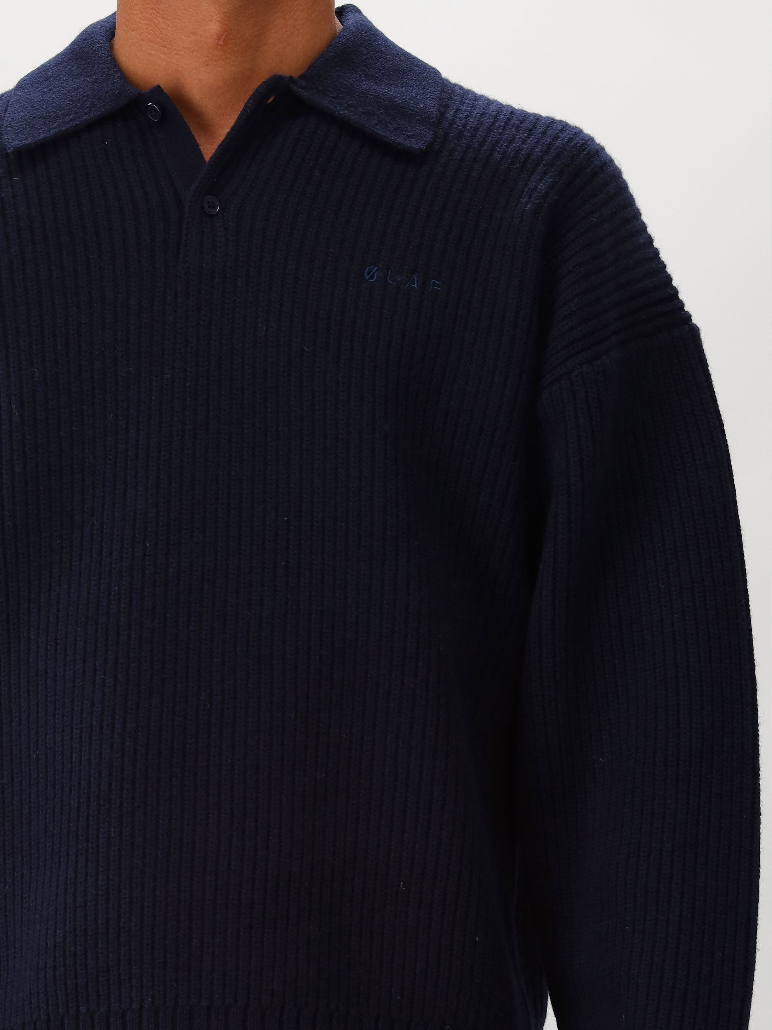 Deze blauwe gebreide polo van ØLÅF bestaat uit een mix van wol, polyamide en acryl De knitted longsleeve polo heeft een zware kwaliteit en zit erg comfortabel.