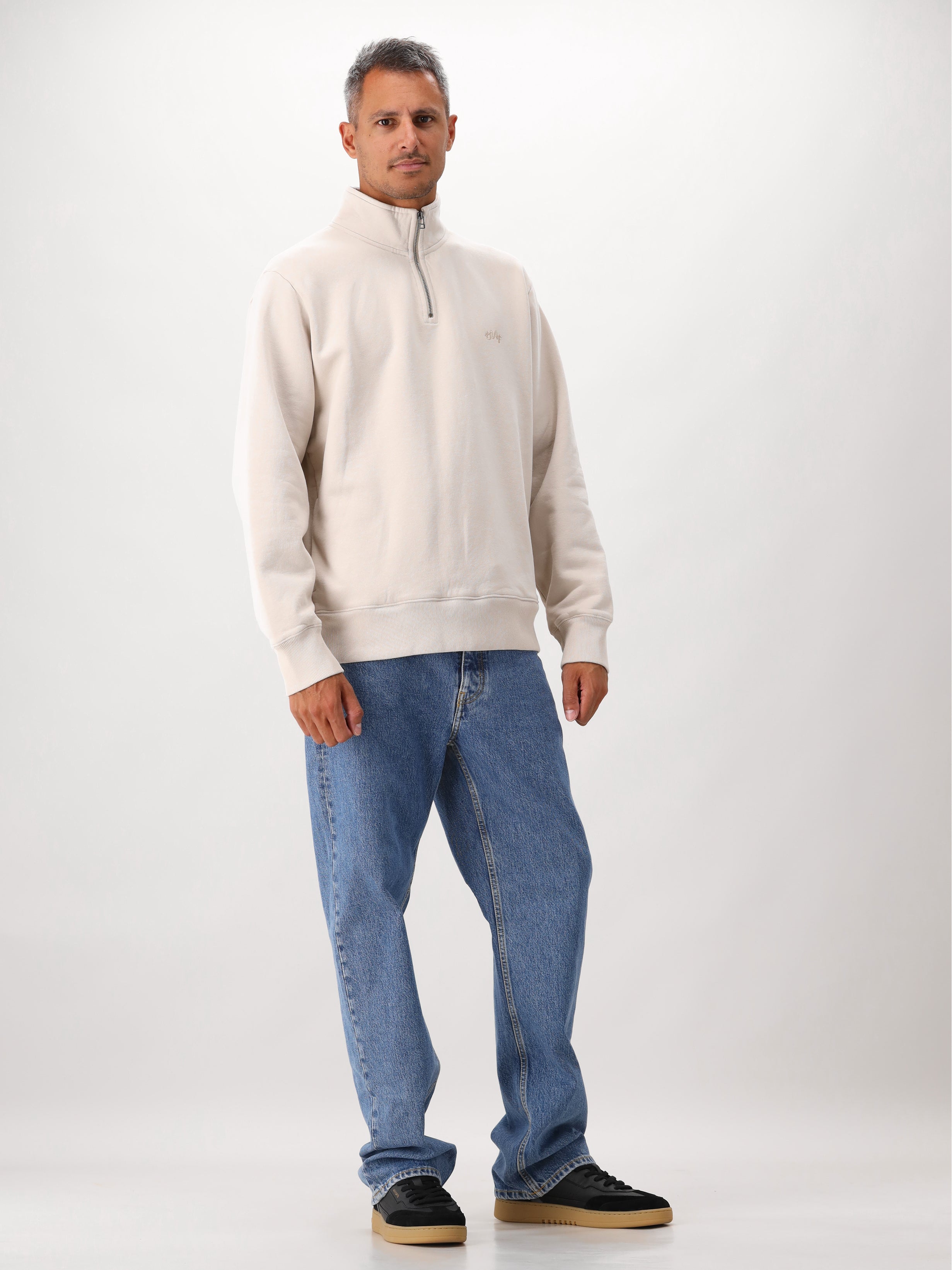 Kies voor deze beige half-zip sweater van ØLÅF! De sweater heeft een clean look en bestaat voor 100% uit biologisch katoen. De sweater heeft een oversized tot regular fitting. De half-zip geeft het item een interessant detail.