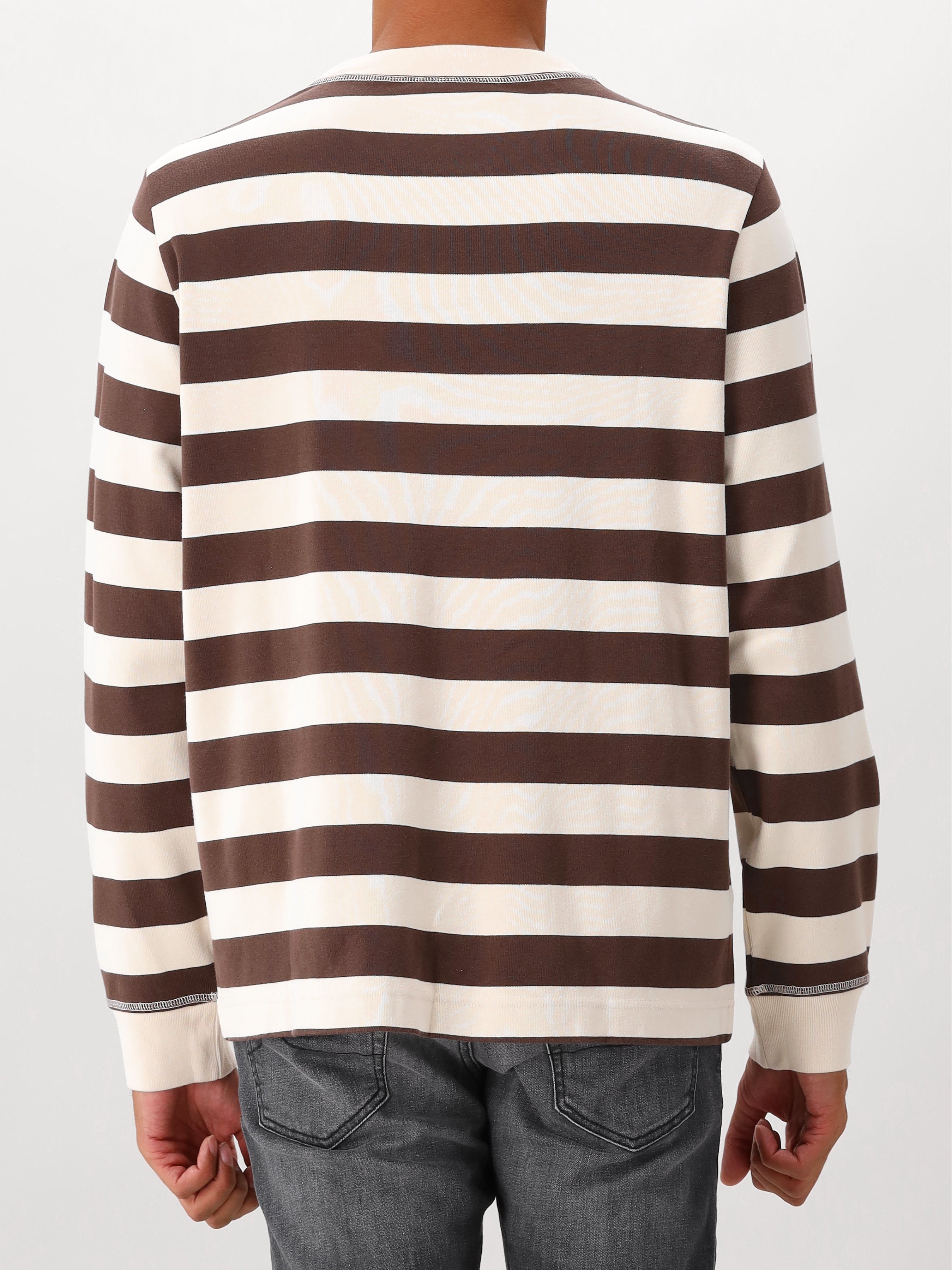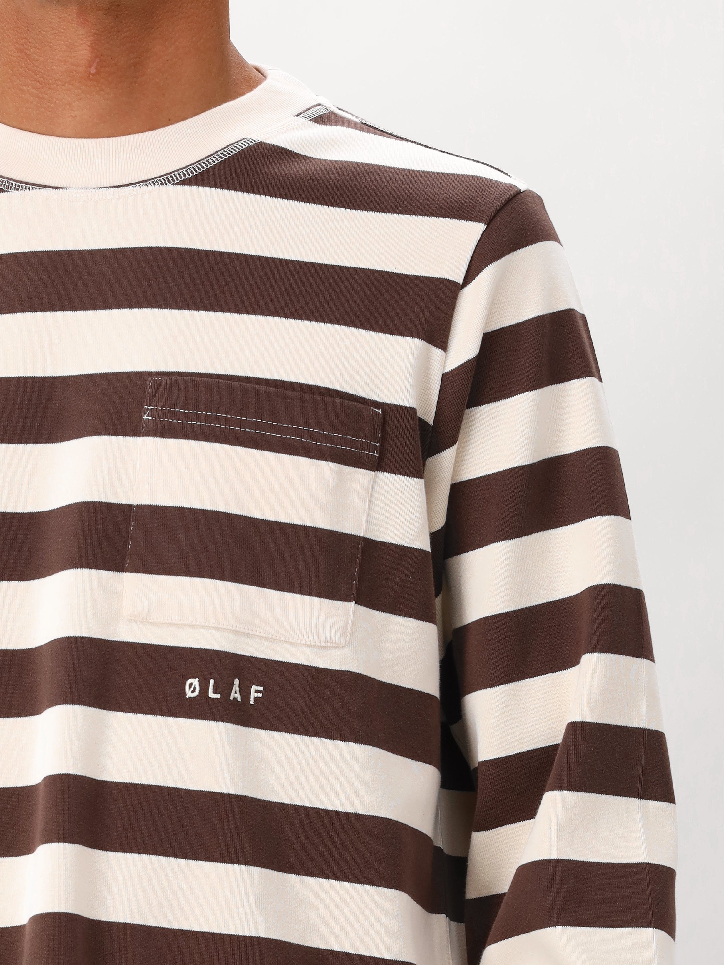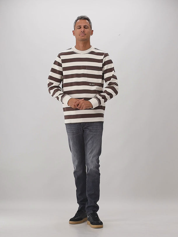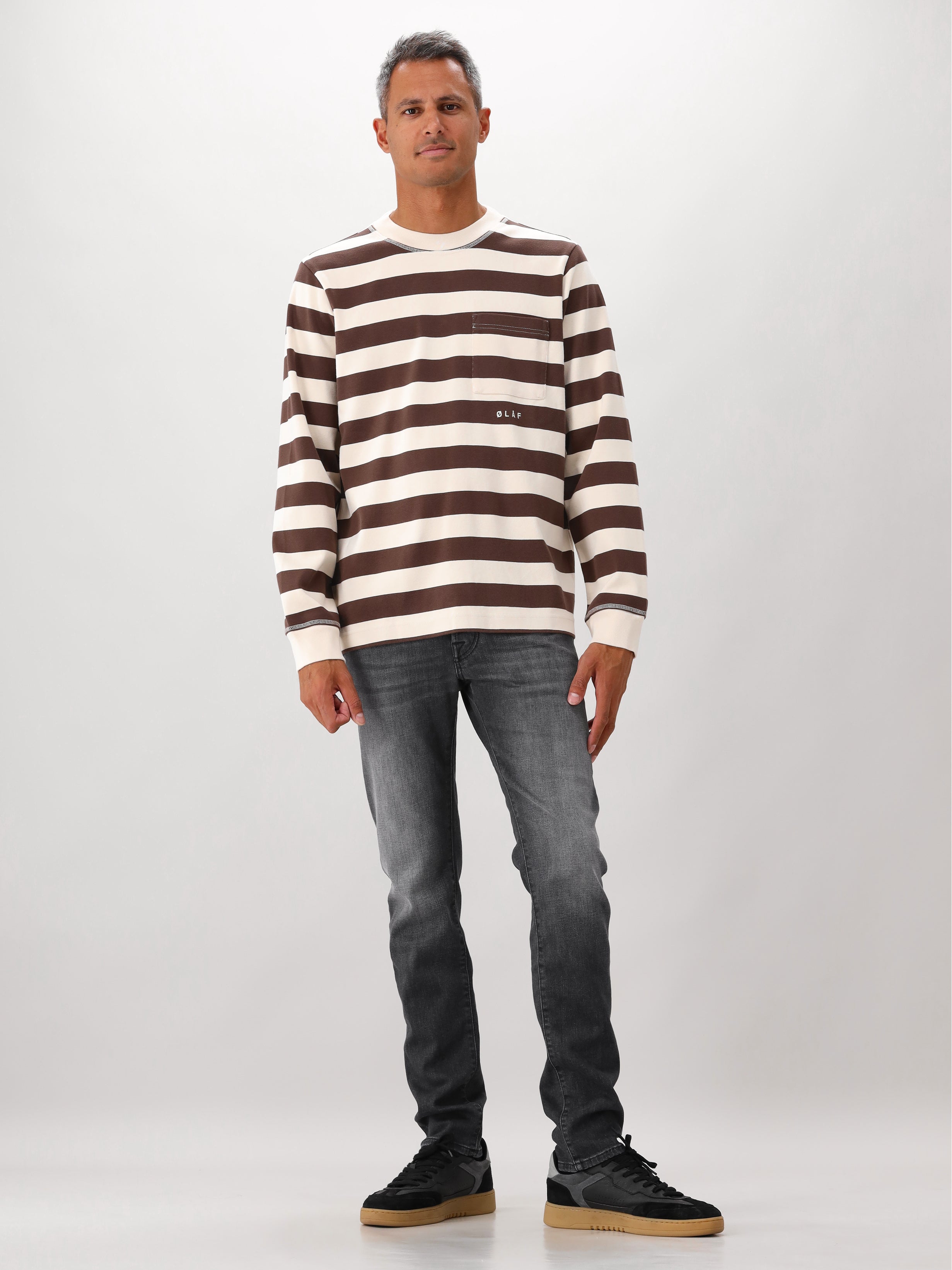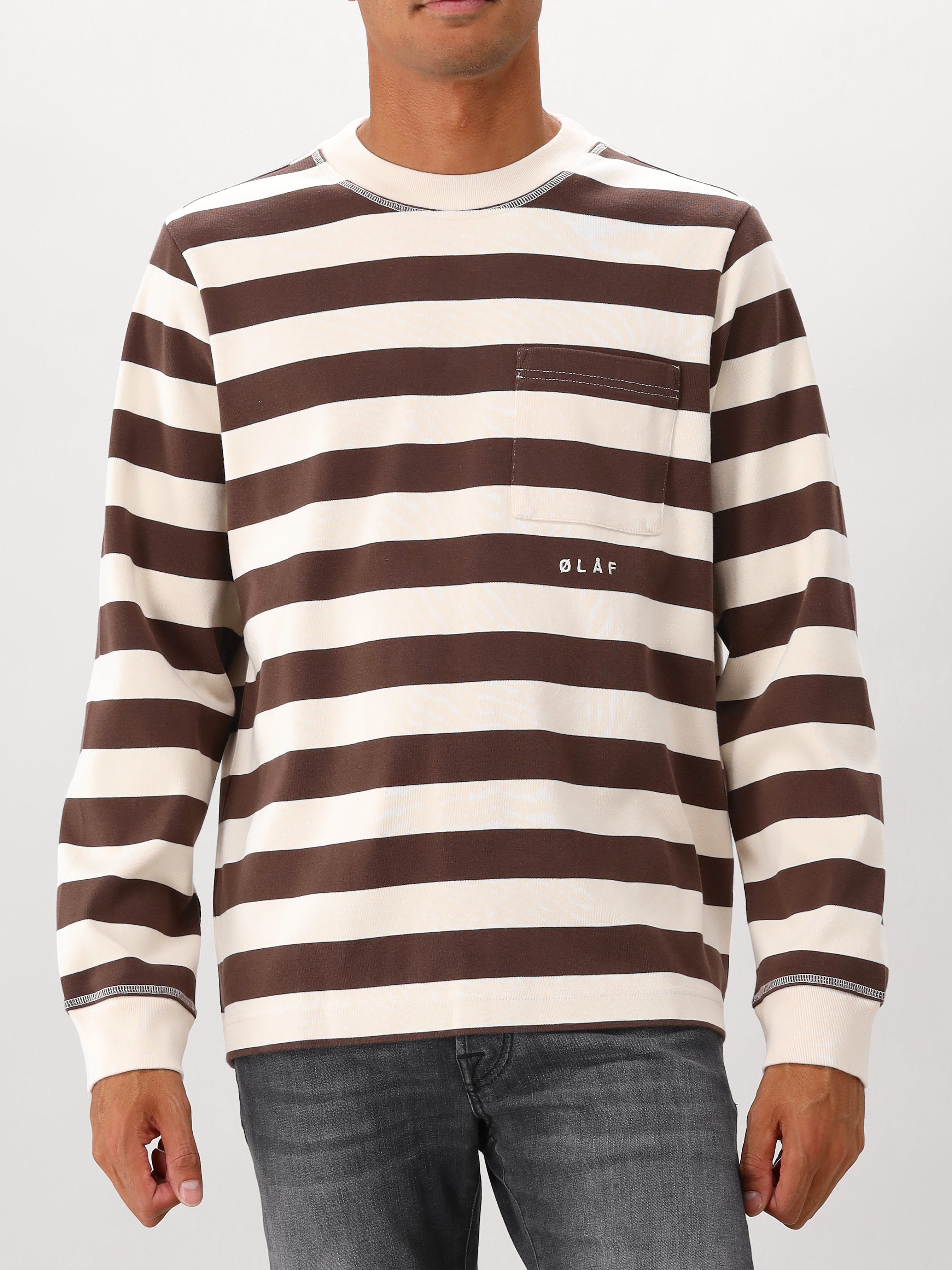Deze gestreepte sweater van ØLÅF bestaat voor 100% uit biologisch katoen. Onder de borstzak vind je een klein merklogo terug. De horizontale strepen zijn stijlvol en geven een frisse uitstraling aan jouw outfit!