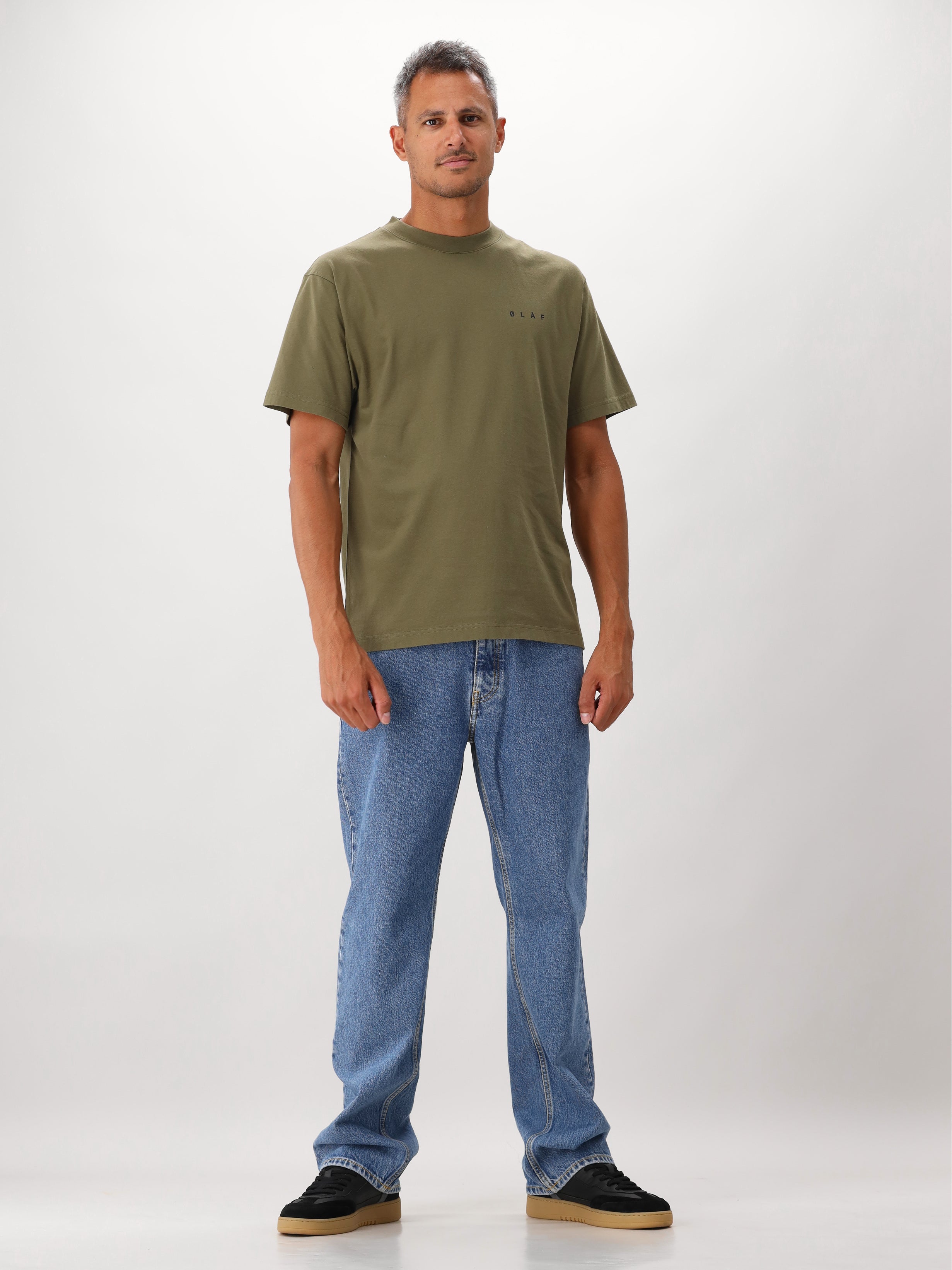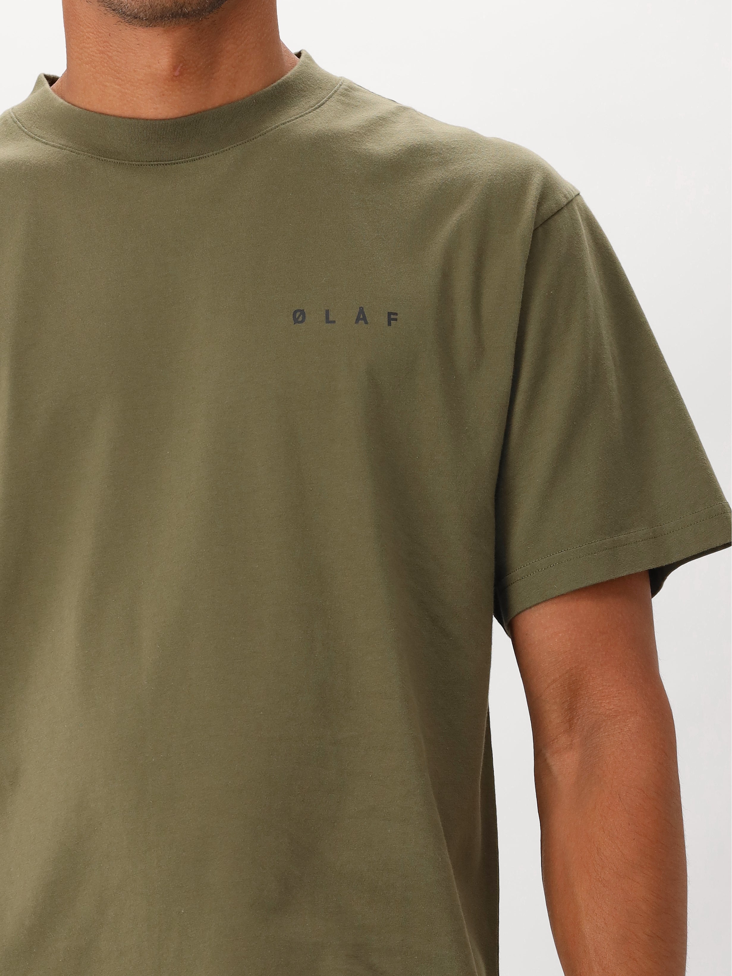 Stijlvol de deur uit met dit groene T-shirt van ØLÅF! Op de rug vind je een groot design terug, het merklogo staat op de borst. Het item is volledig vanuit katoen vervaardigd. De groene kleur geeft een frisse uitstraling aan jouw outfit.