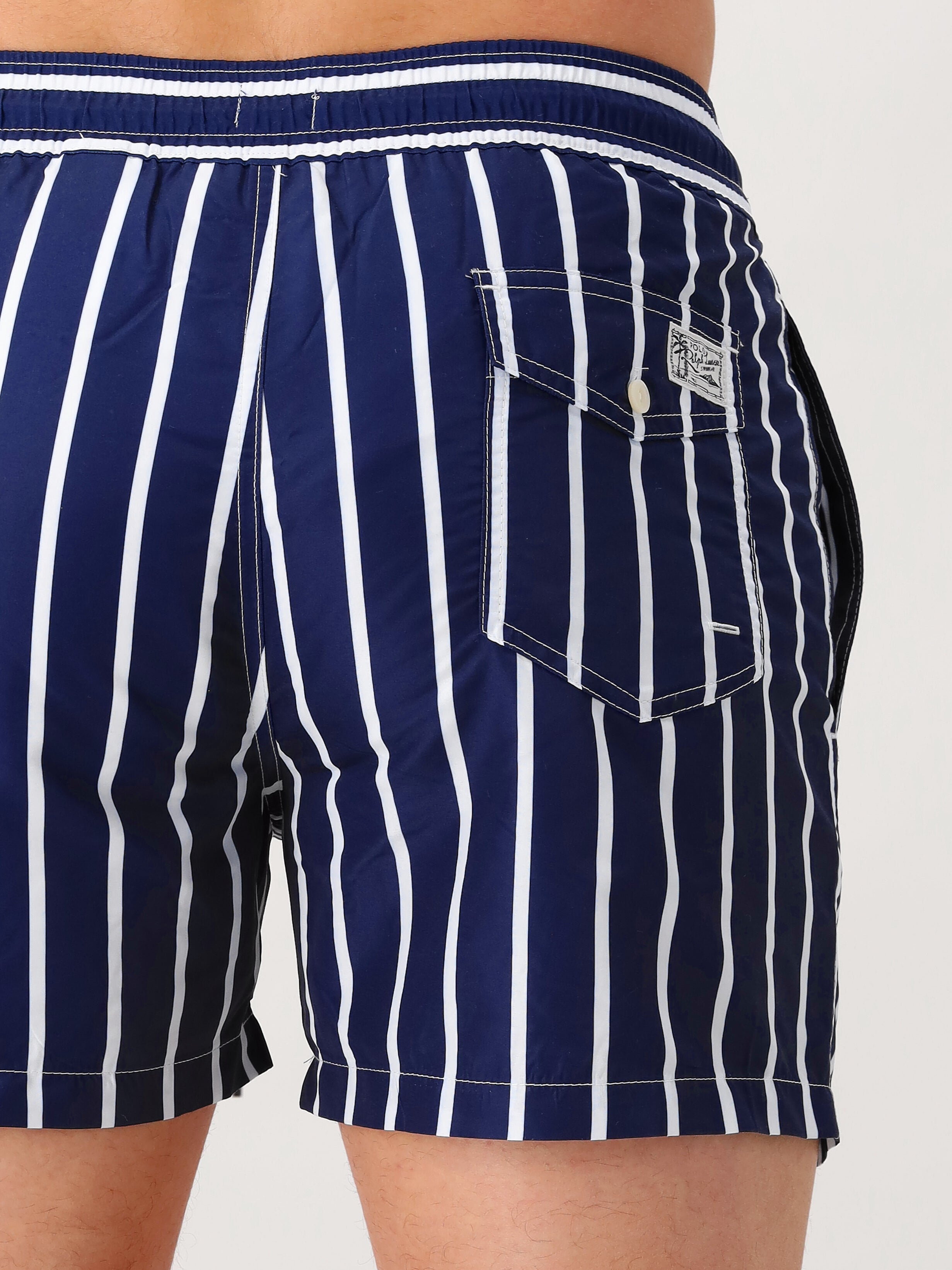 Deze Polo Ralph Lauren zwembroek in het donkerblauw met wit gestreept is een stijlvolle keuze. De zwembroek heeft een lengte die boven de knie valt en een normale taillehoogte met een elastische tailleband en trekkoortjes. Ook heeft de zwembroek twee zijzakken en een achterzak. In de hoek staat het merklogo geborduurd.