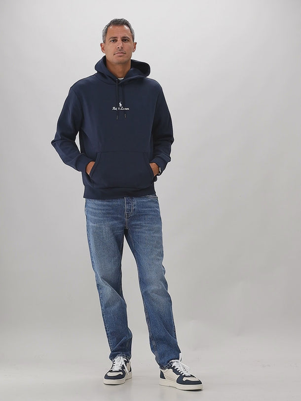 Stijlvol en comfortabel met deze donkerblauwe hoodie van Polo Ralph Lauren. De blauwe kleur kan gemakkelijk gestyled worden op verschillende broeken. Op de borst vind je een klein merkdesign terug. De hoodie bestaat uit een mix van katoen en polyester.