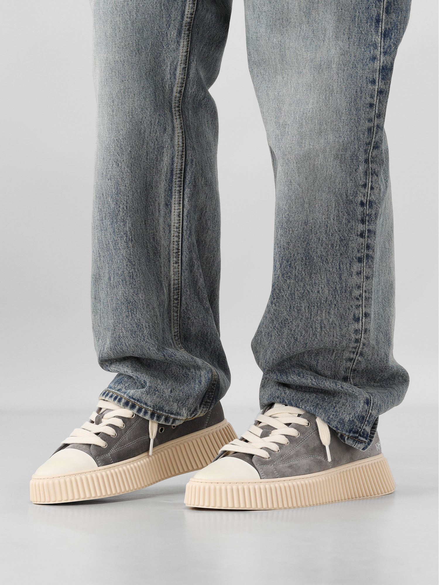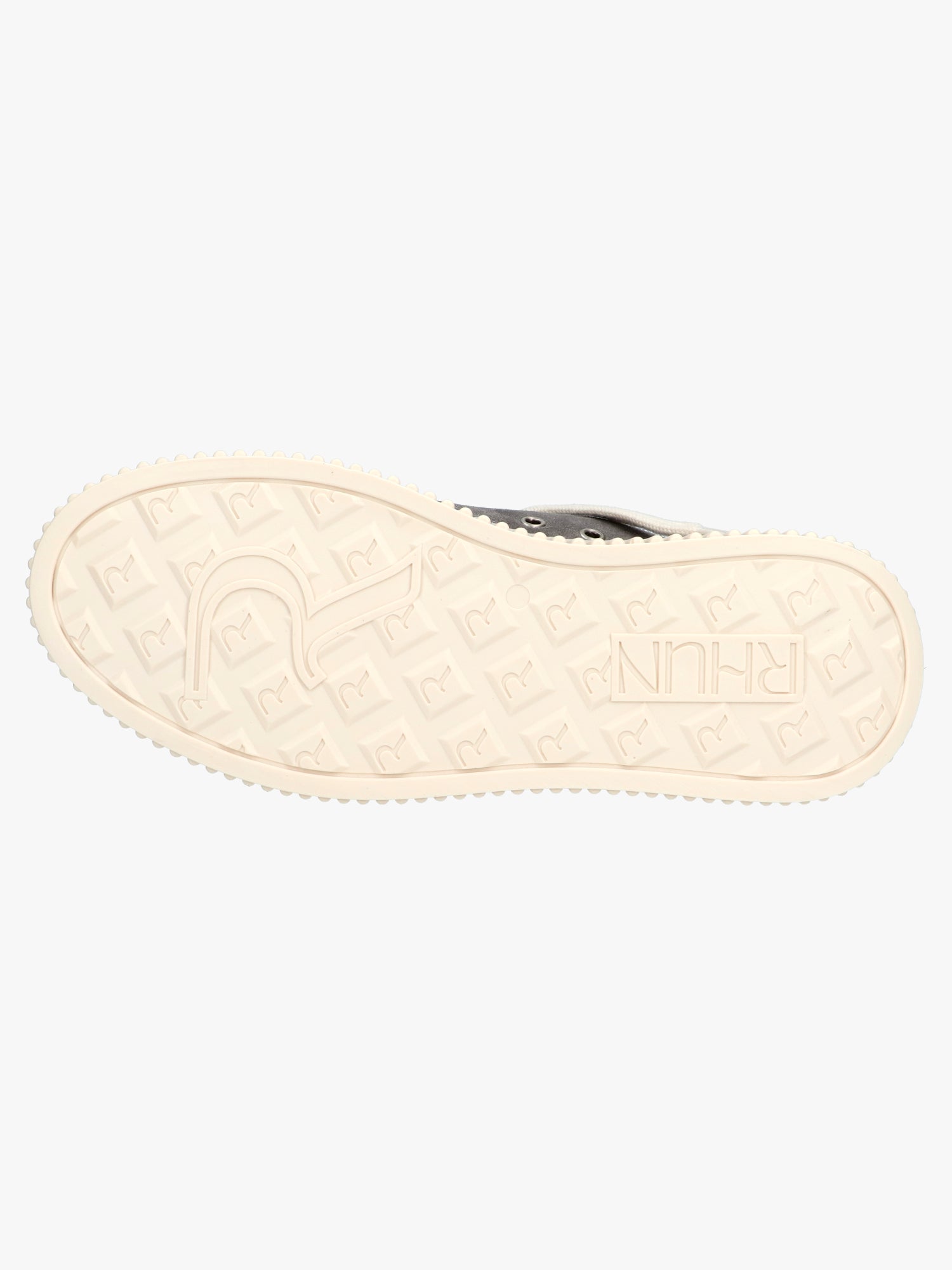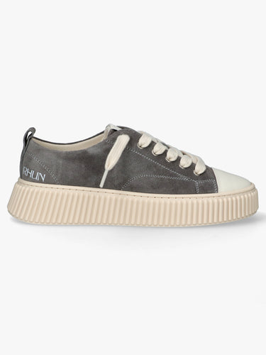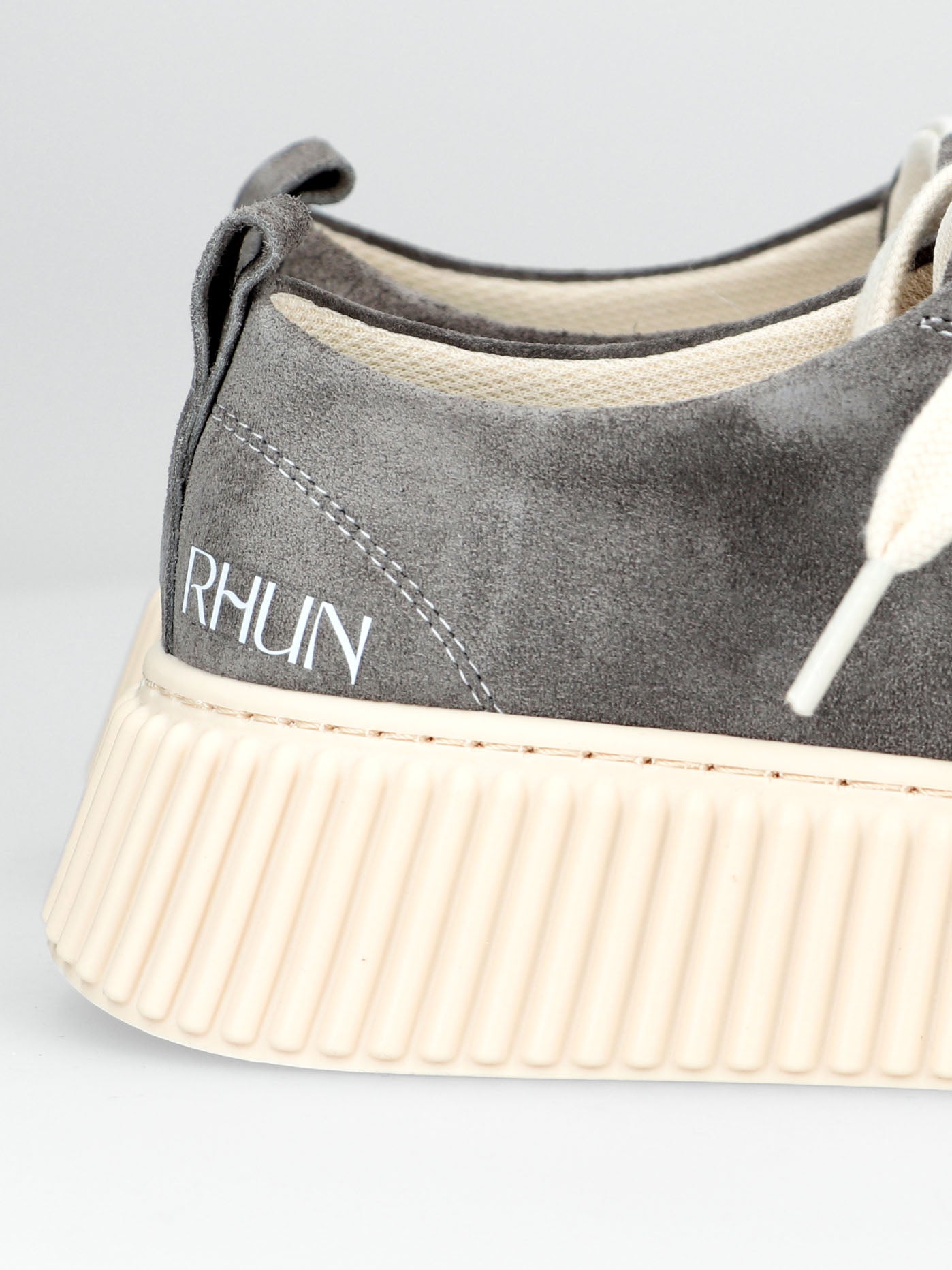 Stijlvol de deur uit dankzij deze grijze sneaker van Rhun. De sneaker heeft een hoge zool en stijlvolle uitstraling. De grijze kleur is gemakkelijk te combineren.