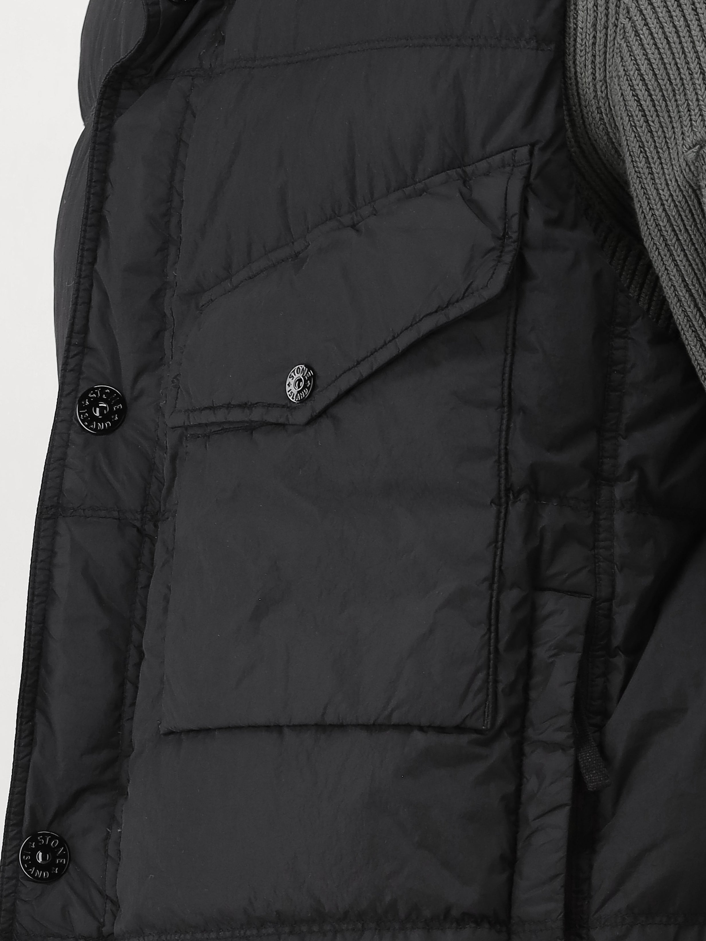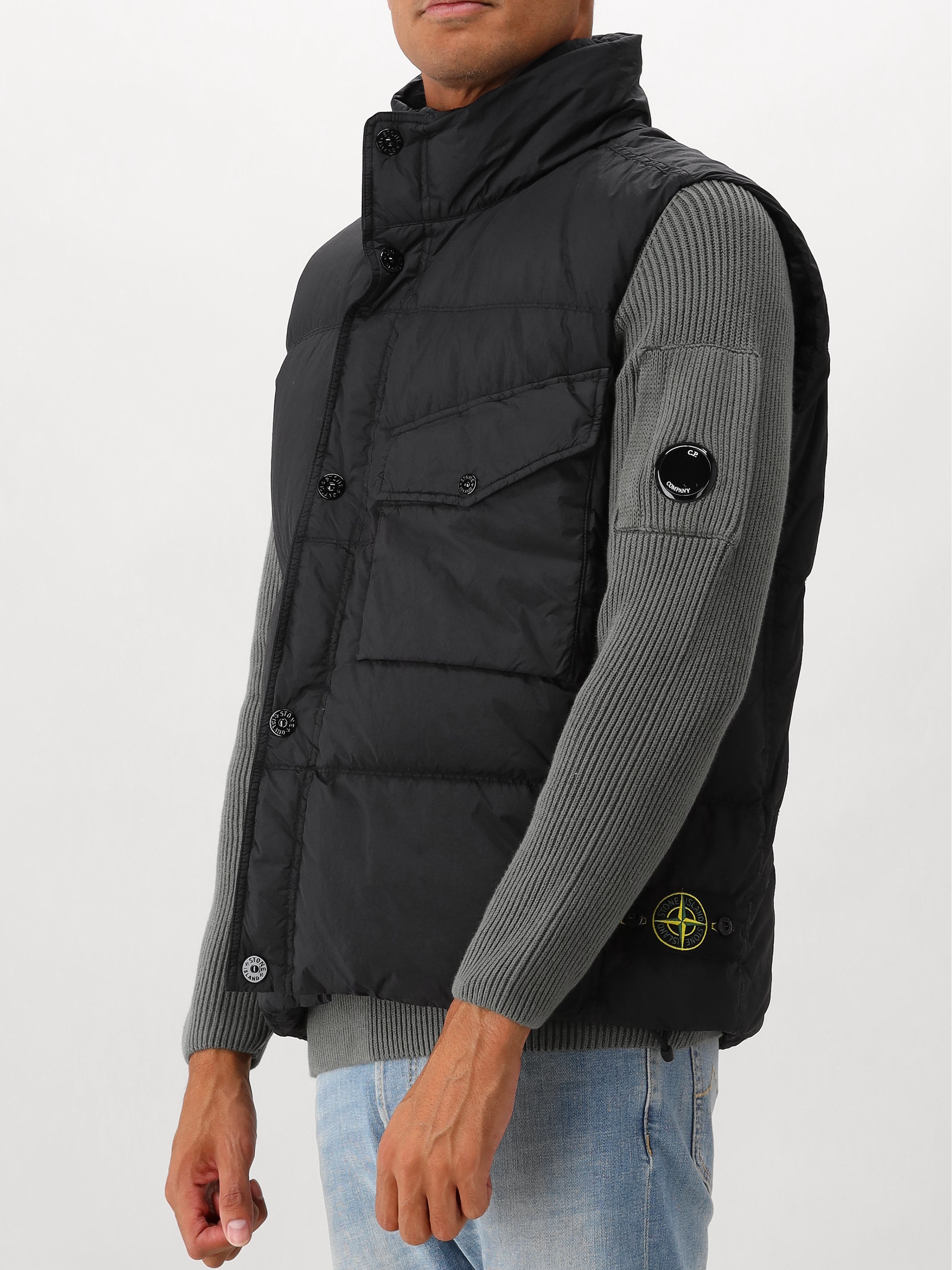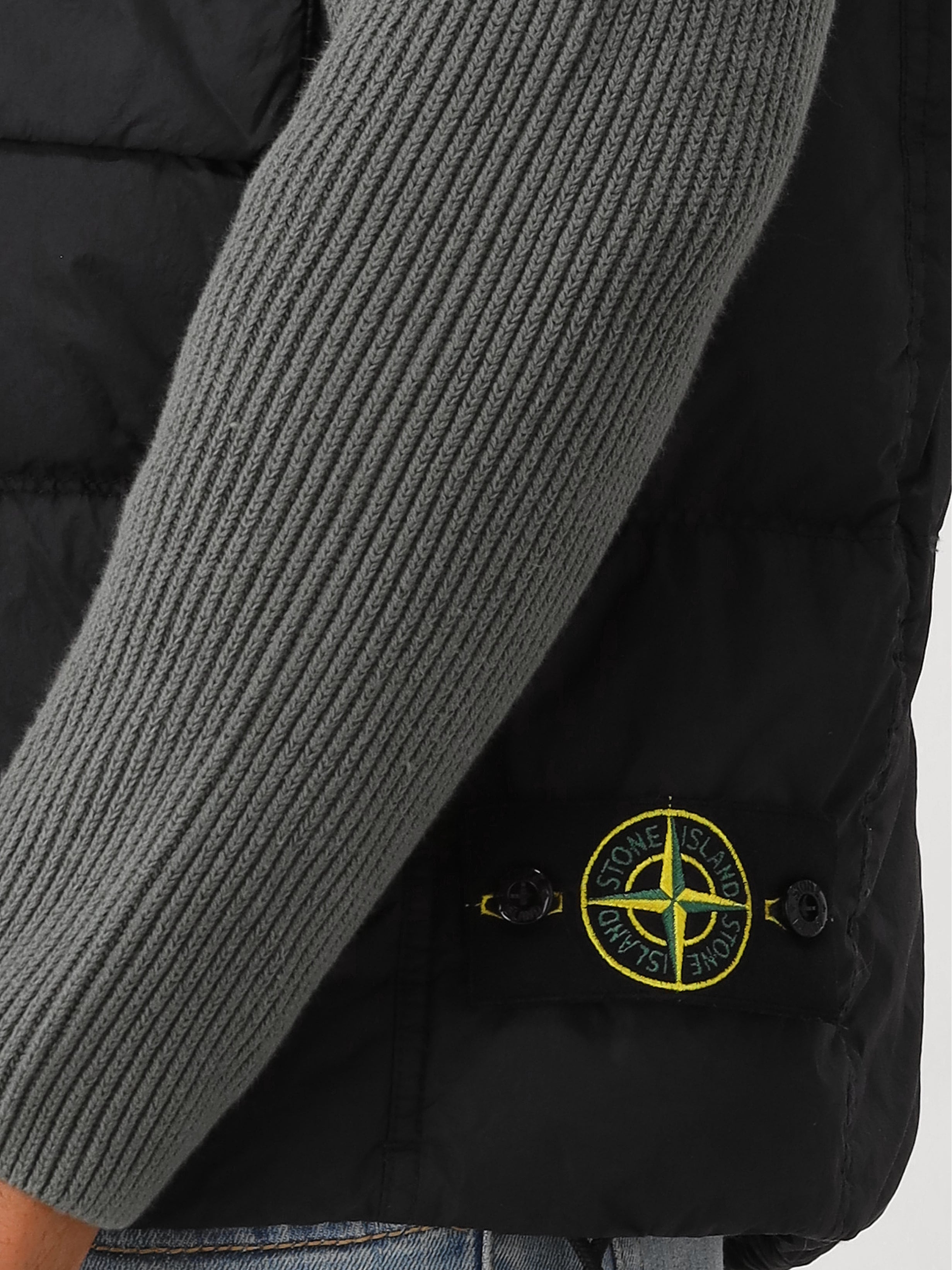 Deze zwarte bodywarmer van Stone Island is gevuld met verantwoorde eendendons. Aan de linkerkant aan de onderzijde vind je de Stone Island badge terug. De bodywarmer wordt gesloten met een rits- en knoopsluiting. De zwarte kleur is tijdloos en geweldig te stijlen op verschillende outfits.