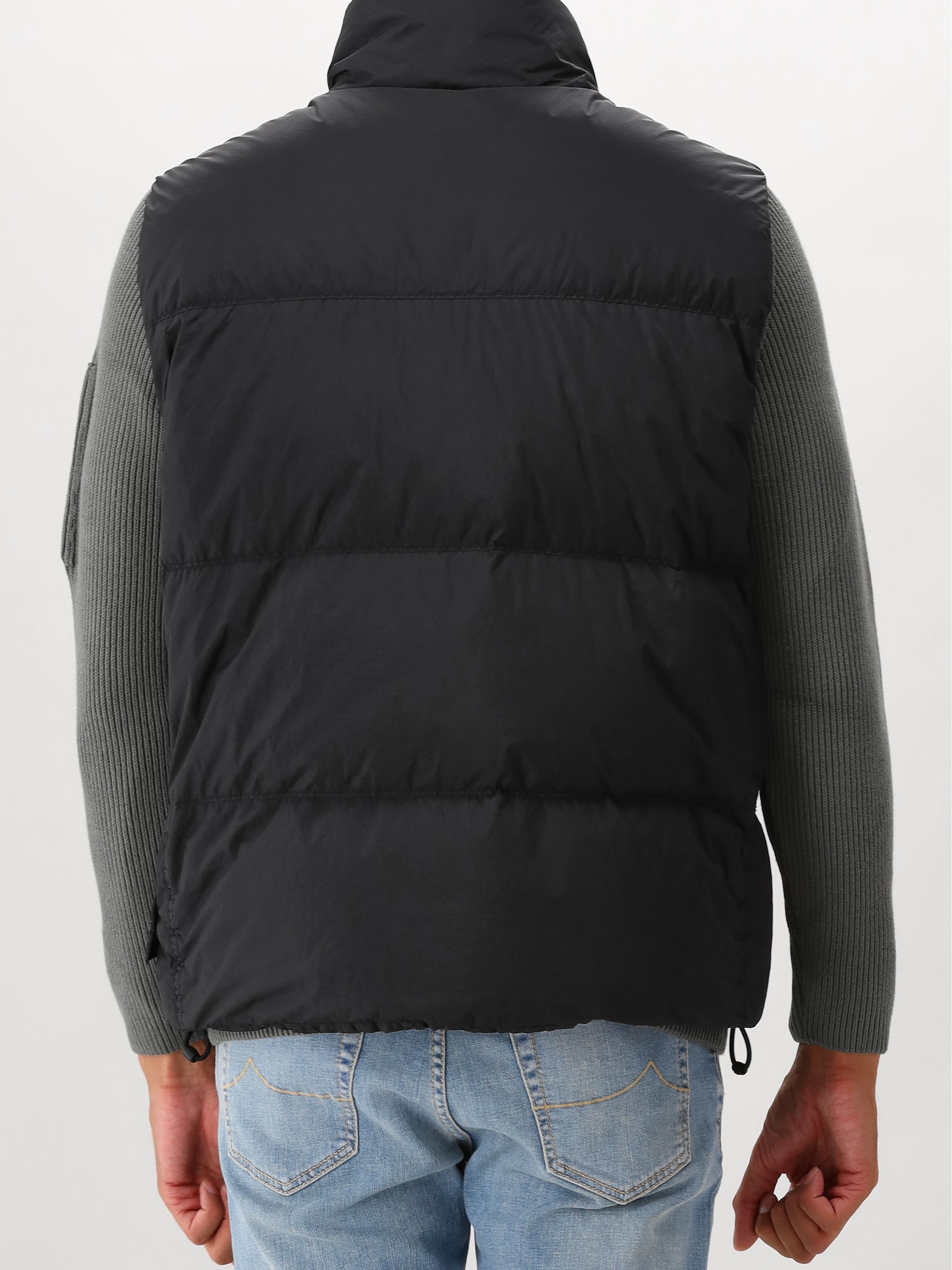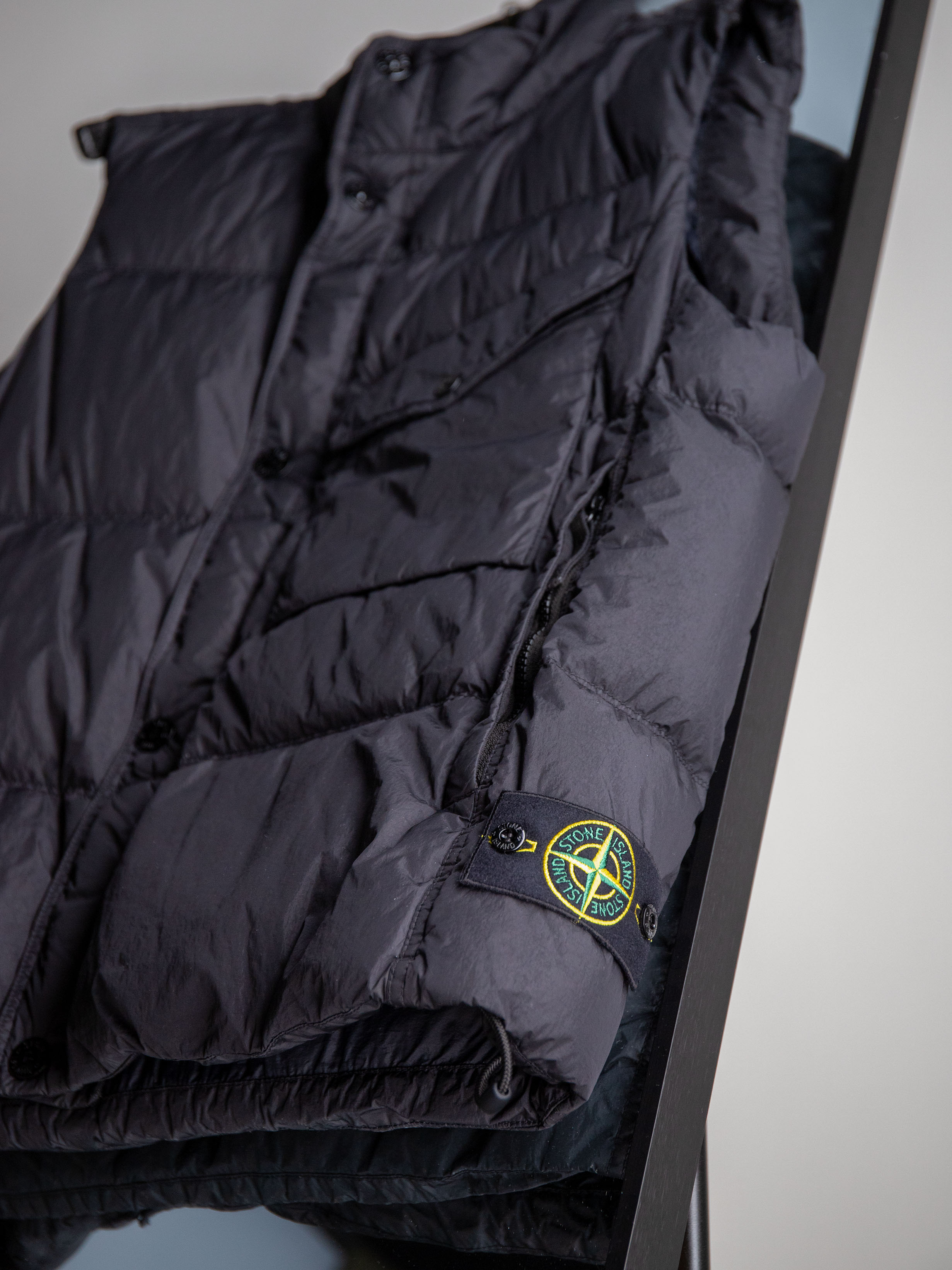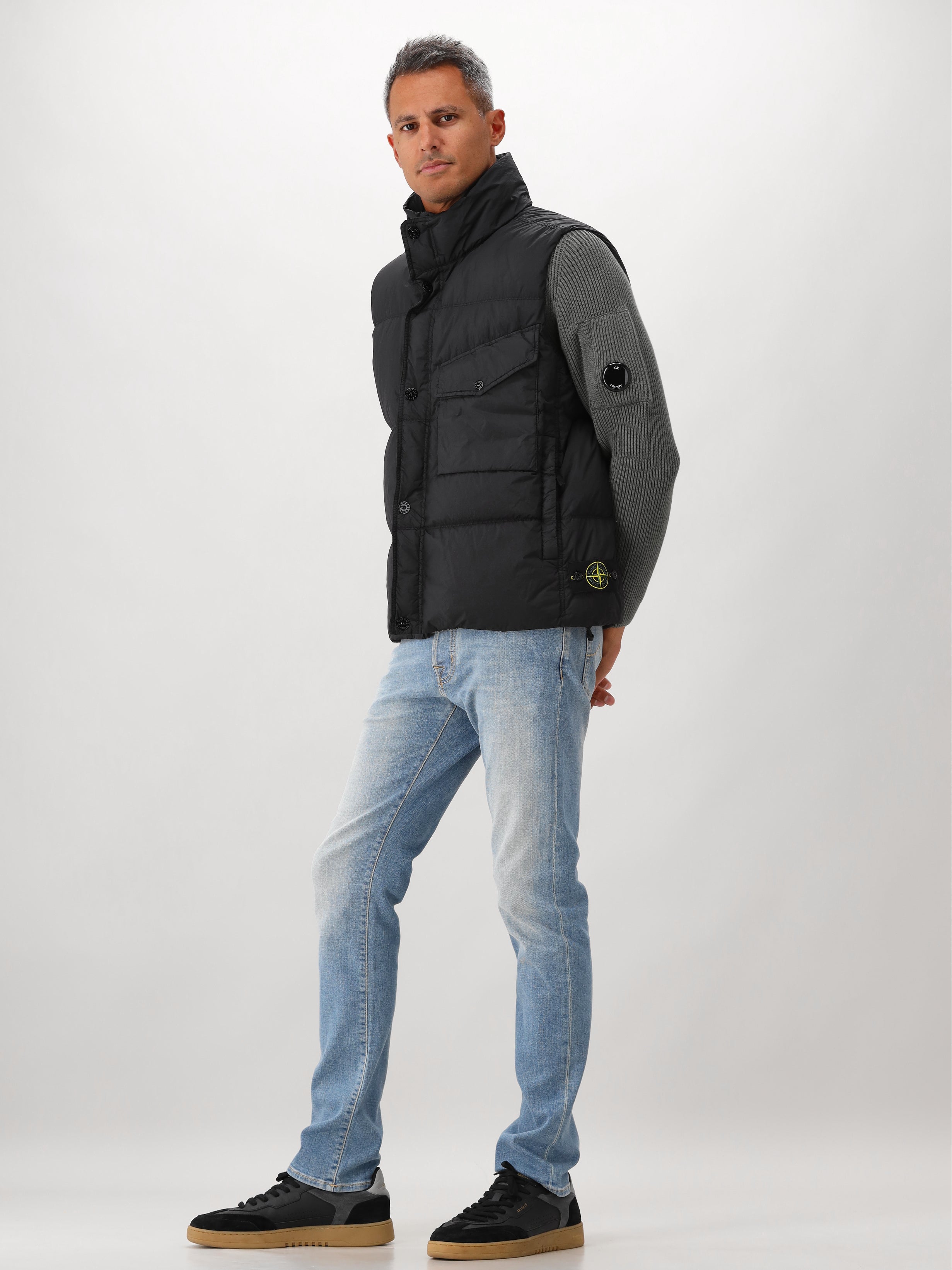 Deze zwarte bodywarmer van Stone Island is gevuld met verantwoorde eendendons. Aan de linkerkant aan de onderzijde vind je de Stone Island badge terug. De bodywarmer wordt gesloten met een rits- en knoopsluiting. De zwarte kleur is tijdloos en geweldig te stijlen op verschillende outfits.