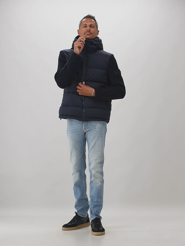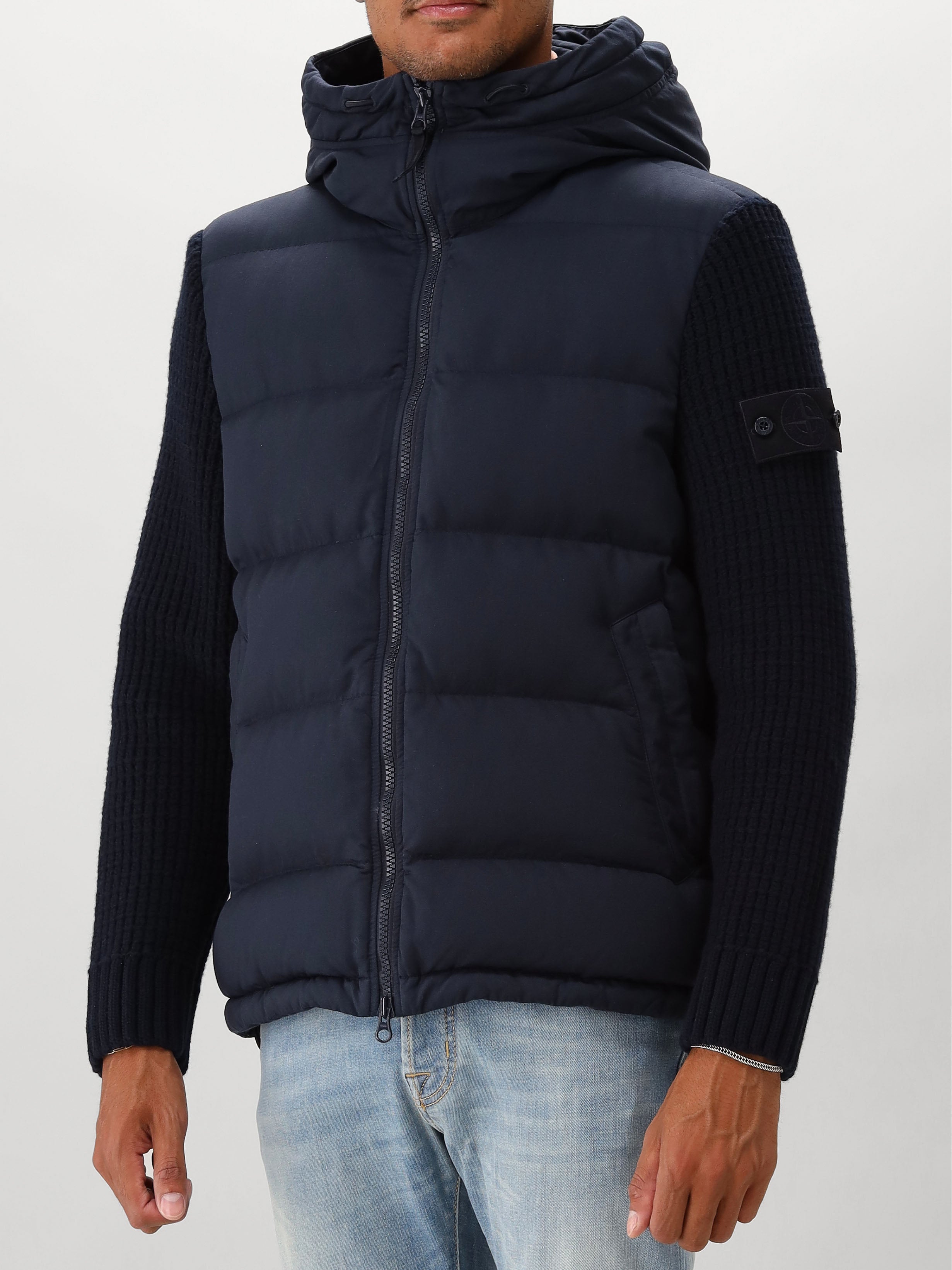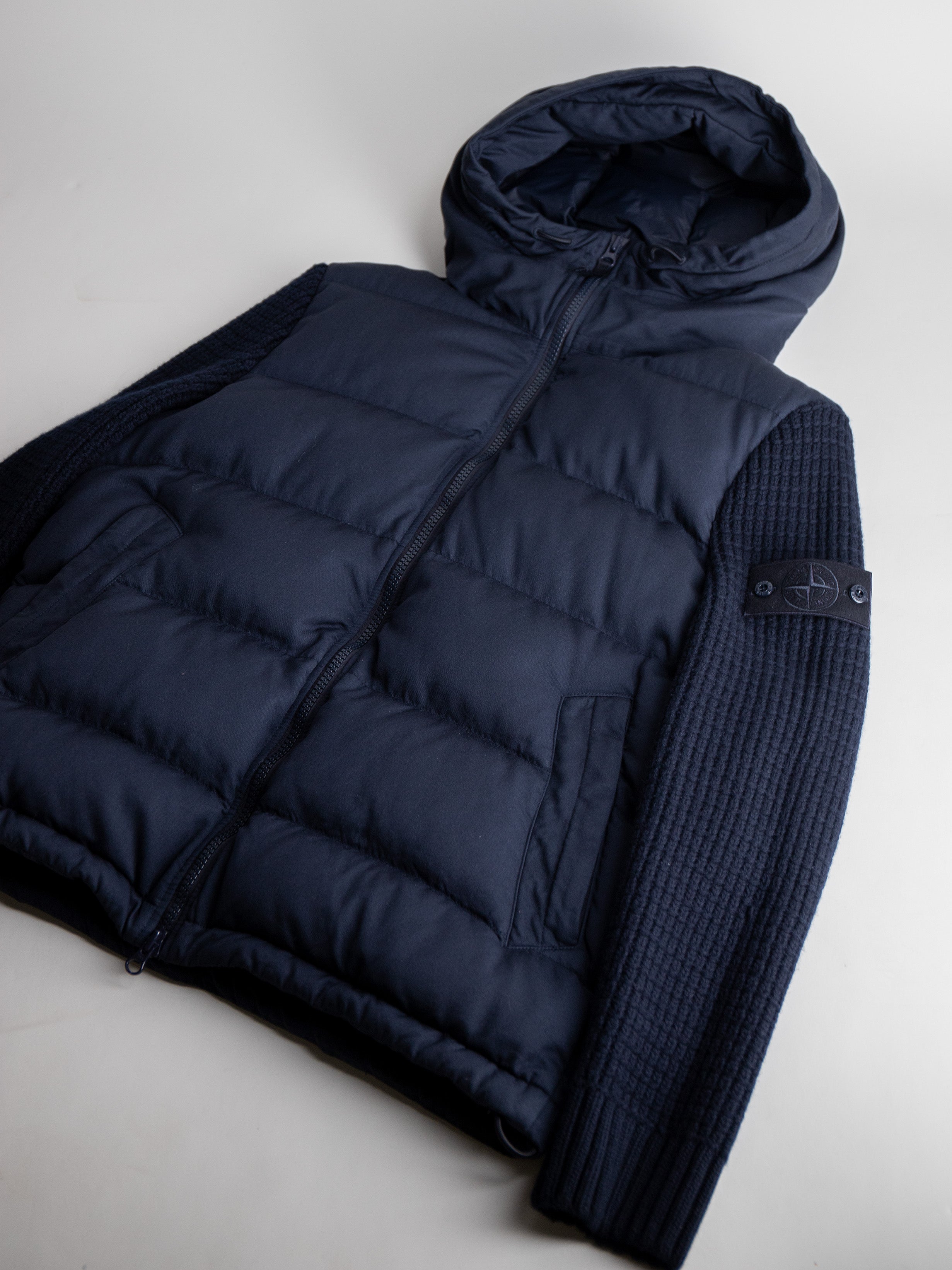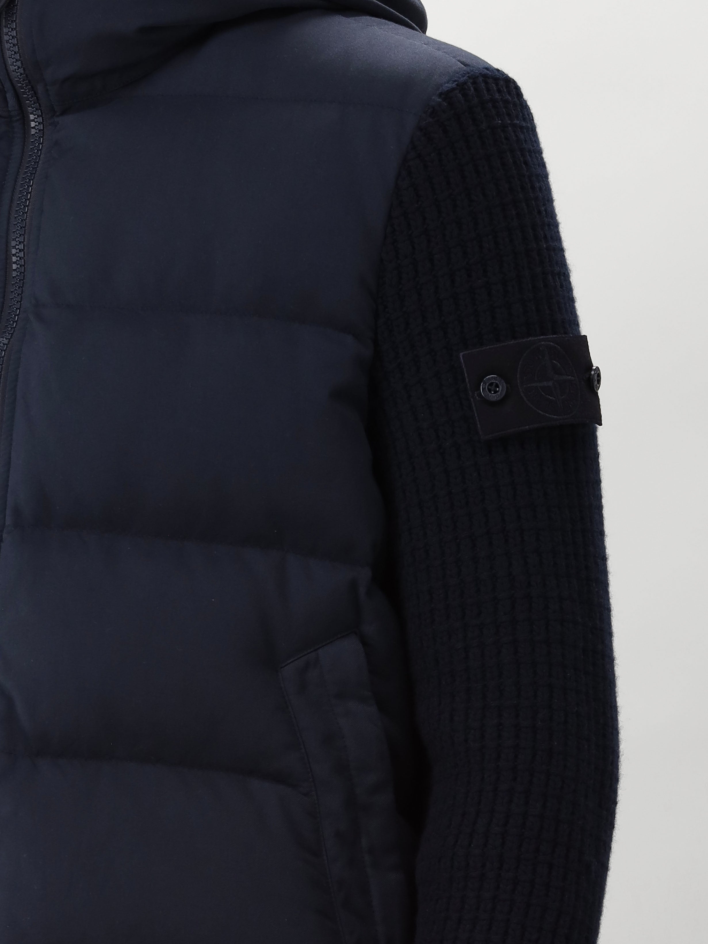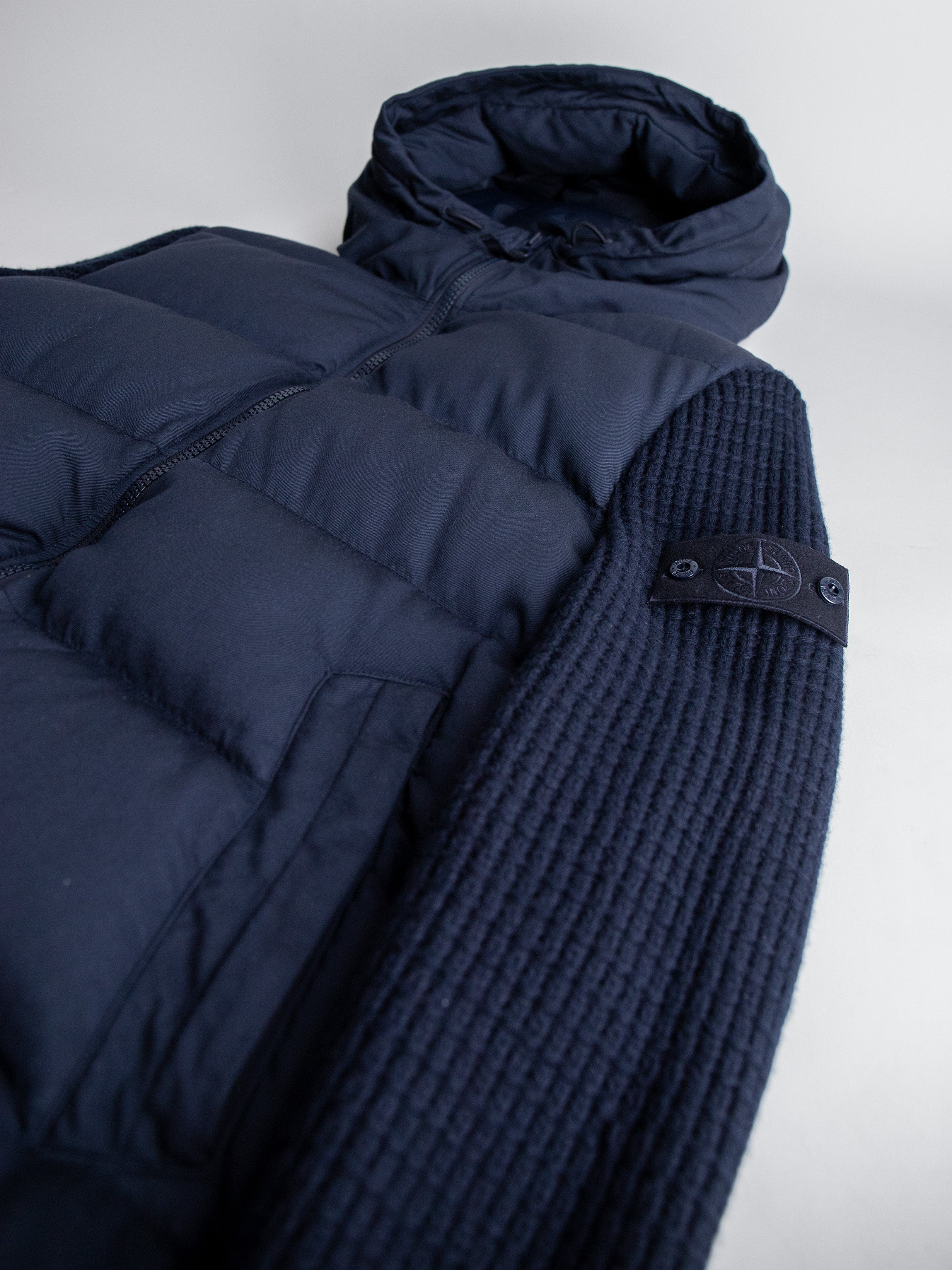 Donkerblauwe Stone Island Twill Wool-TC Knit Ghost piece. Deze bijzondere jas komt uit de Ghost-collectie. De bekende logobadge op de mouw is in dezelfde kleur als de jas. De jas is gevuld met eendendons en heeft gebreide mouwen van wol. De jas is voorzien van een anti-drop finish en is hiermee waterafstotend.