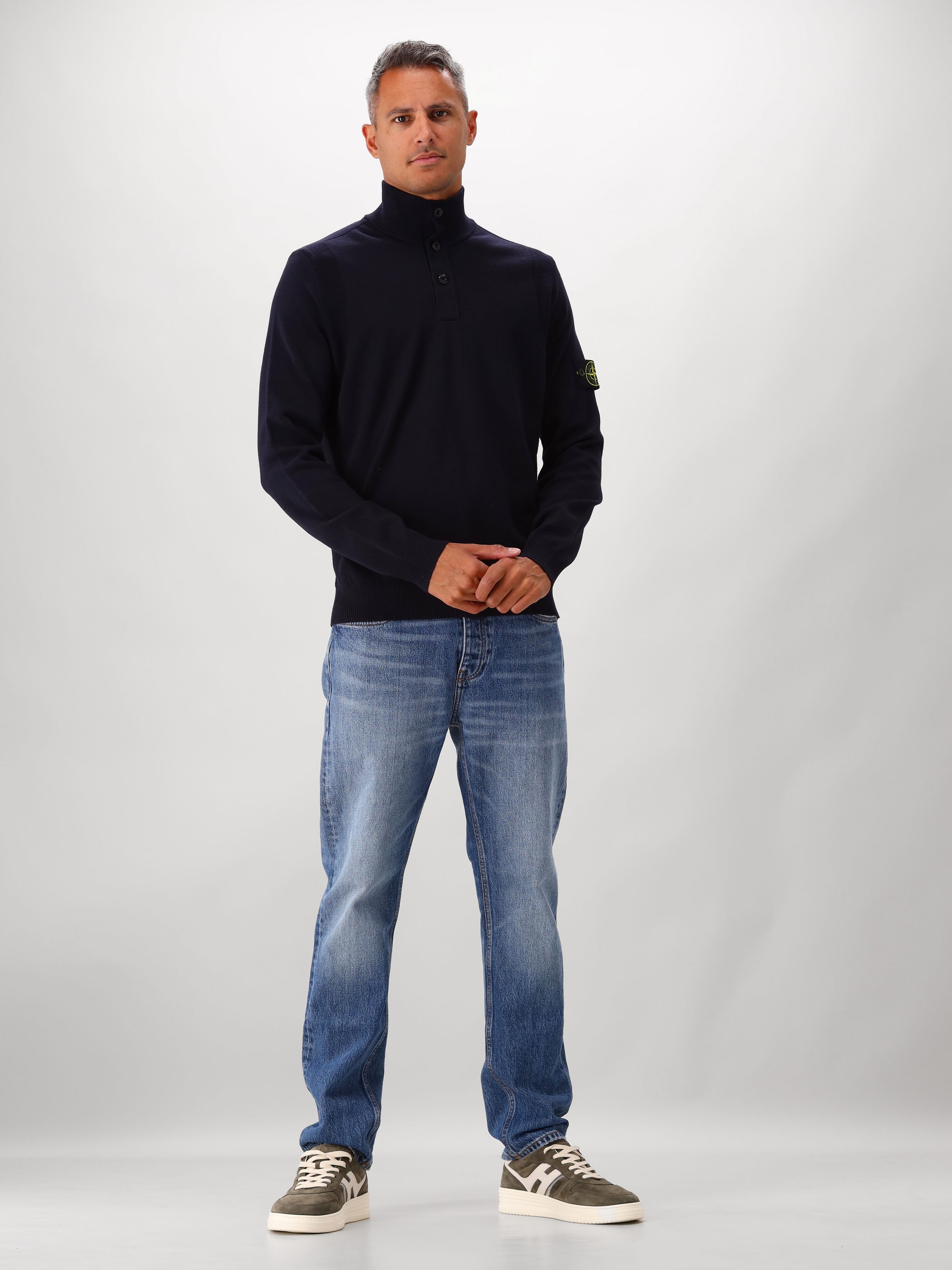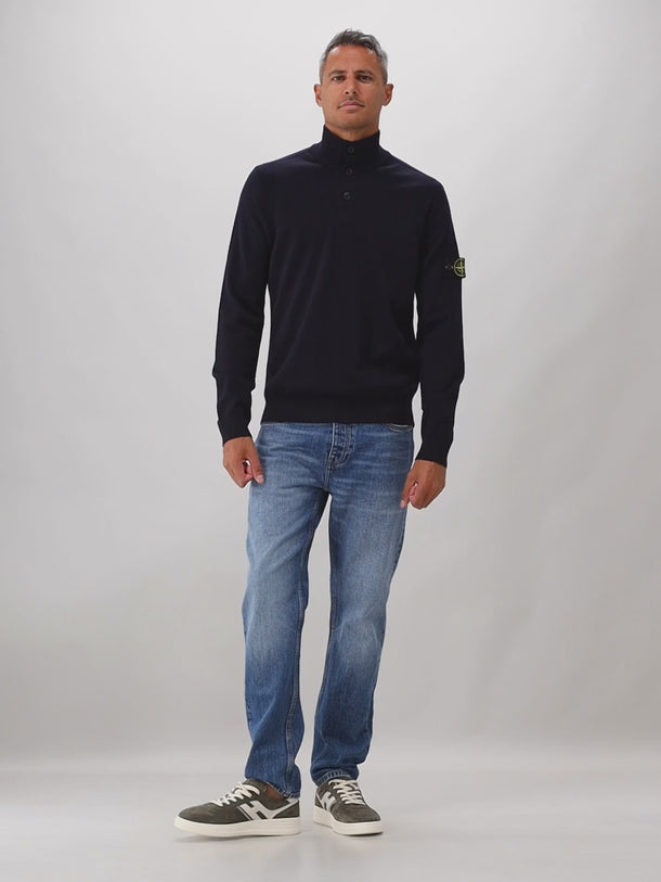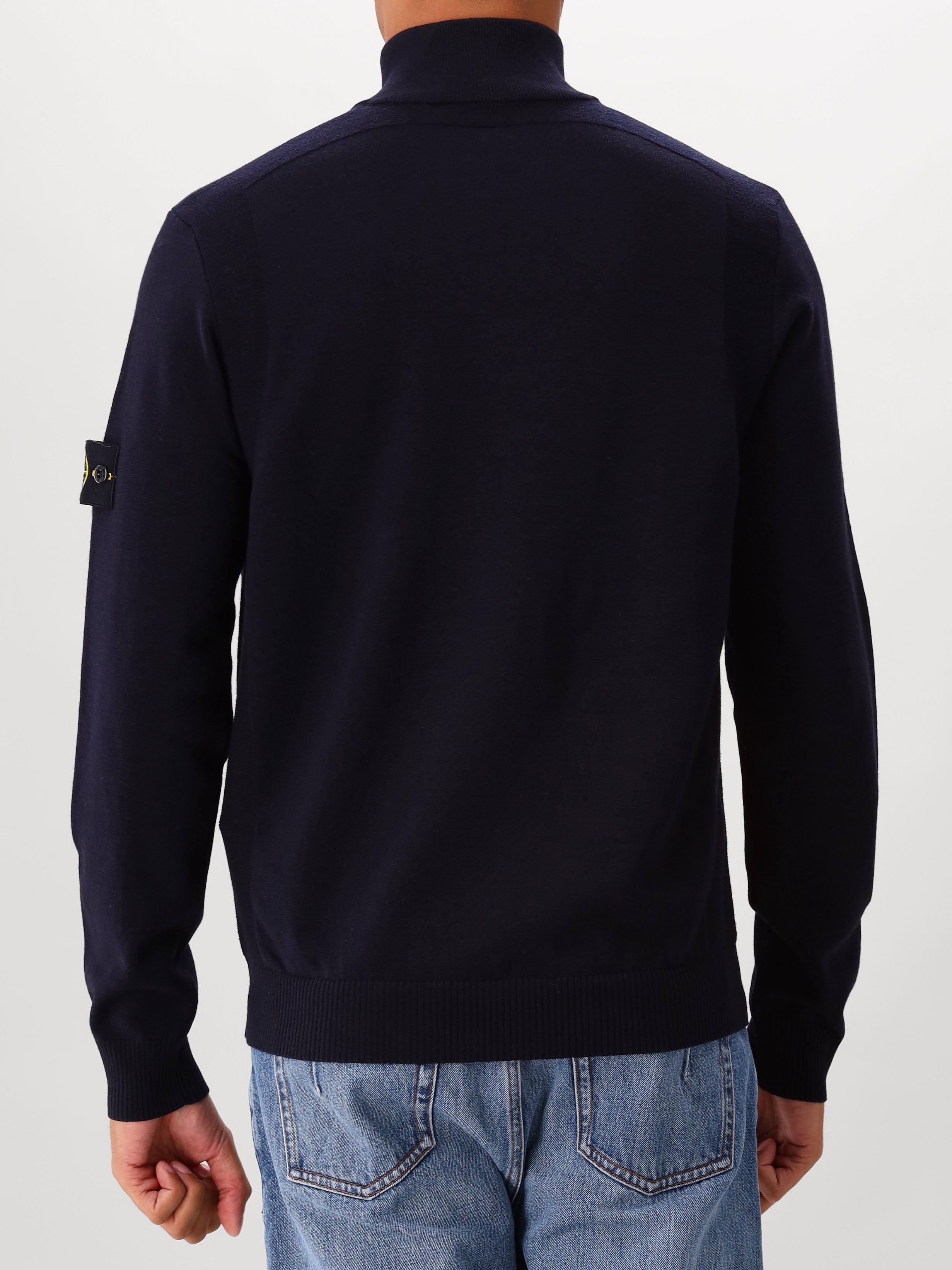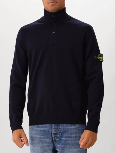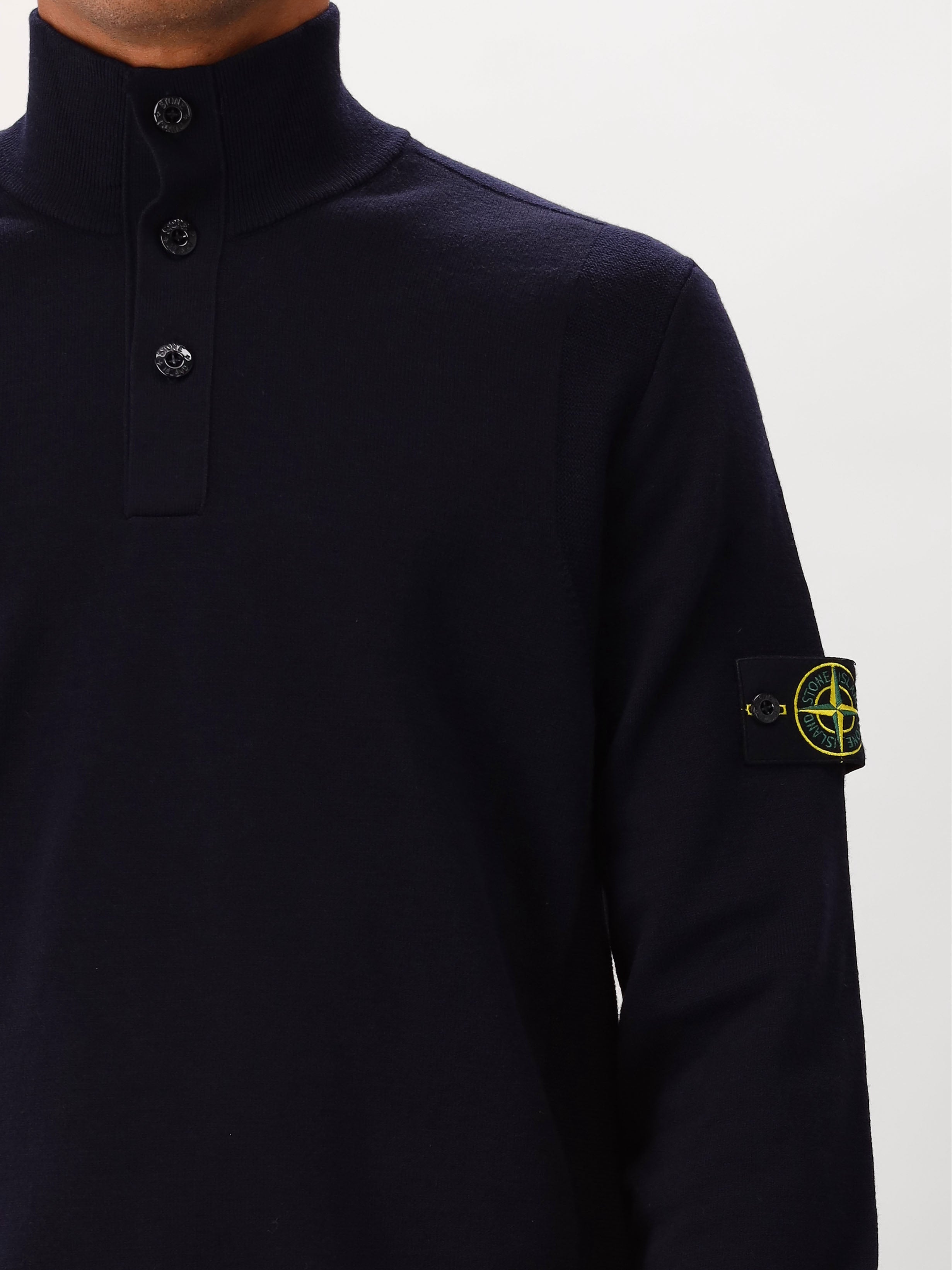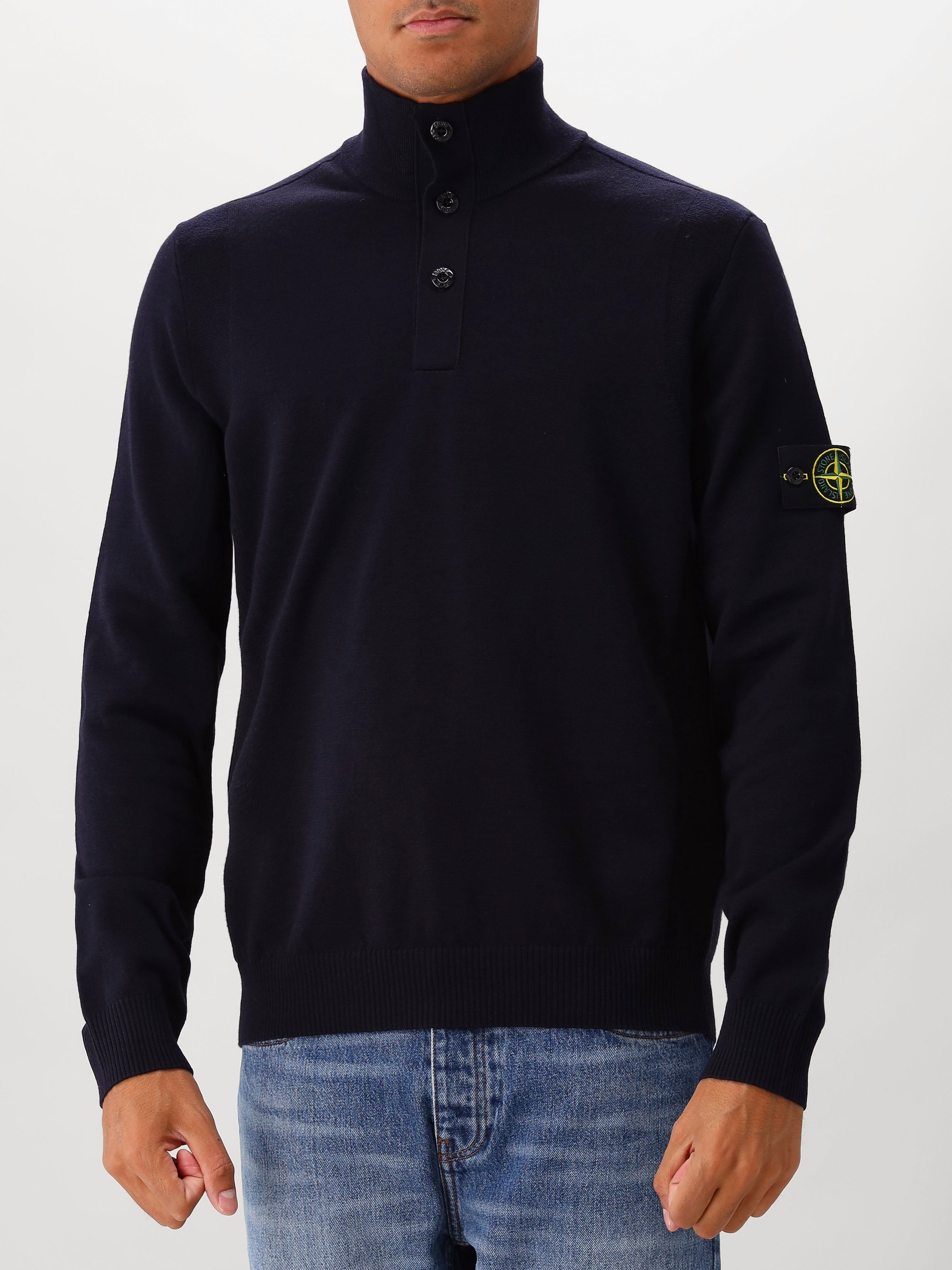 Ga voor deze donkerblauwe gebreide trui van Stone Island. Op de linkermouw vind je het Stone Island logo terug. De col kan worden gesloten met een knoopsluiting. De trui is vervaardigd van wol en polyester.