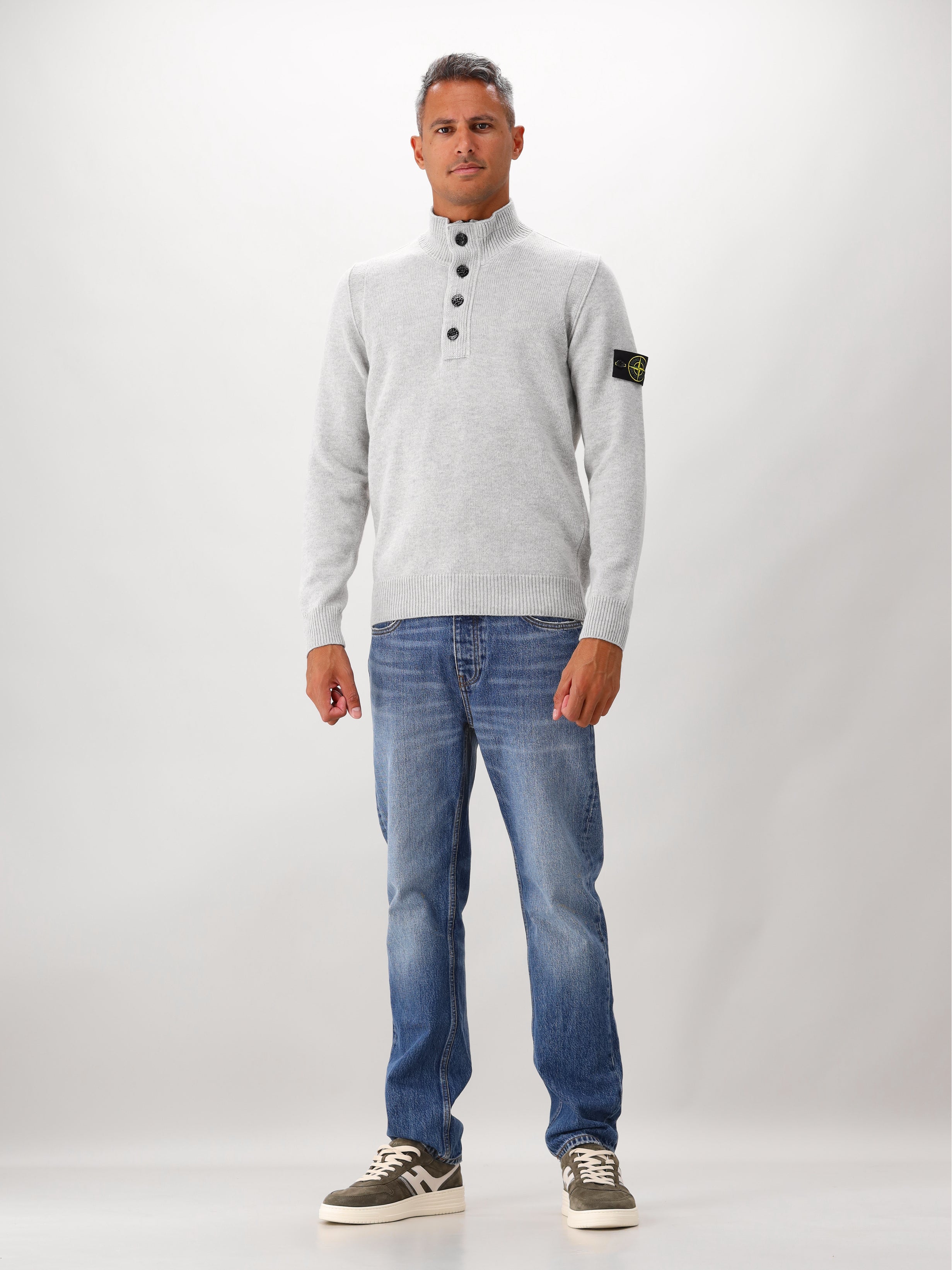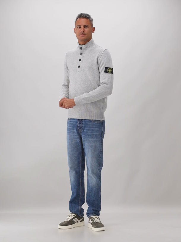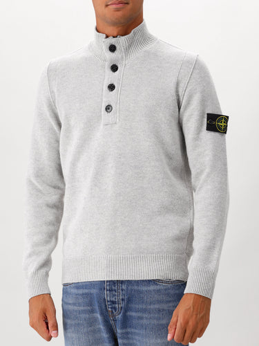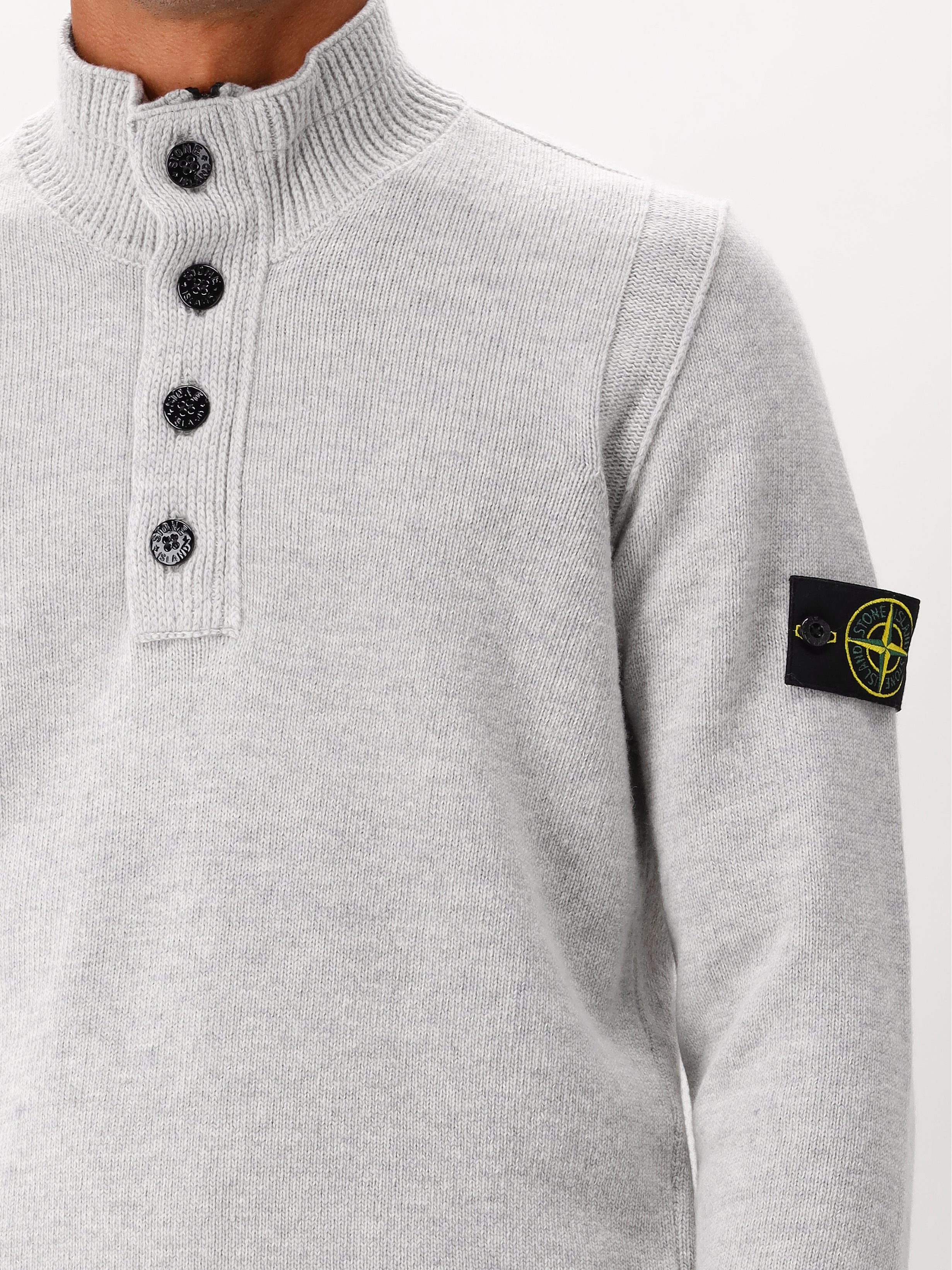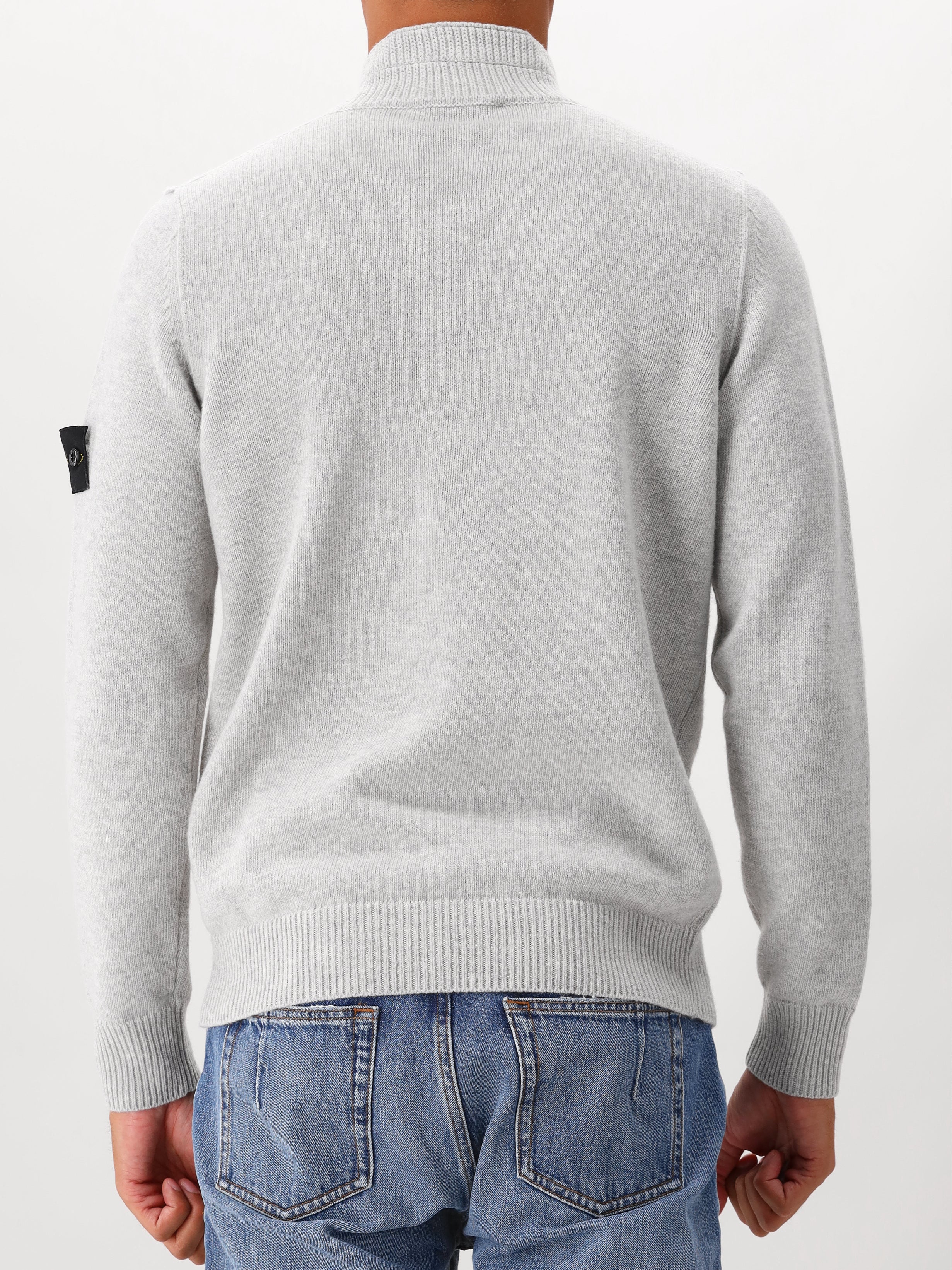Deze gebreide trui van Stone Island bestaat uit een mix van wol en polyamide, die zorgen voor isolatie, comfort en rekbaarheid. De grijze kleur kun je gemakkelijk stijlen op verschillende broeken. Op de linkermouw vind je de Stone Island badge terug, ook de knopen hebben Stone Island branding.