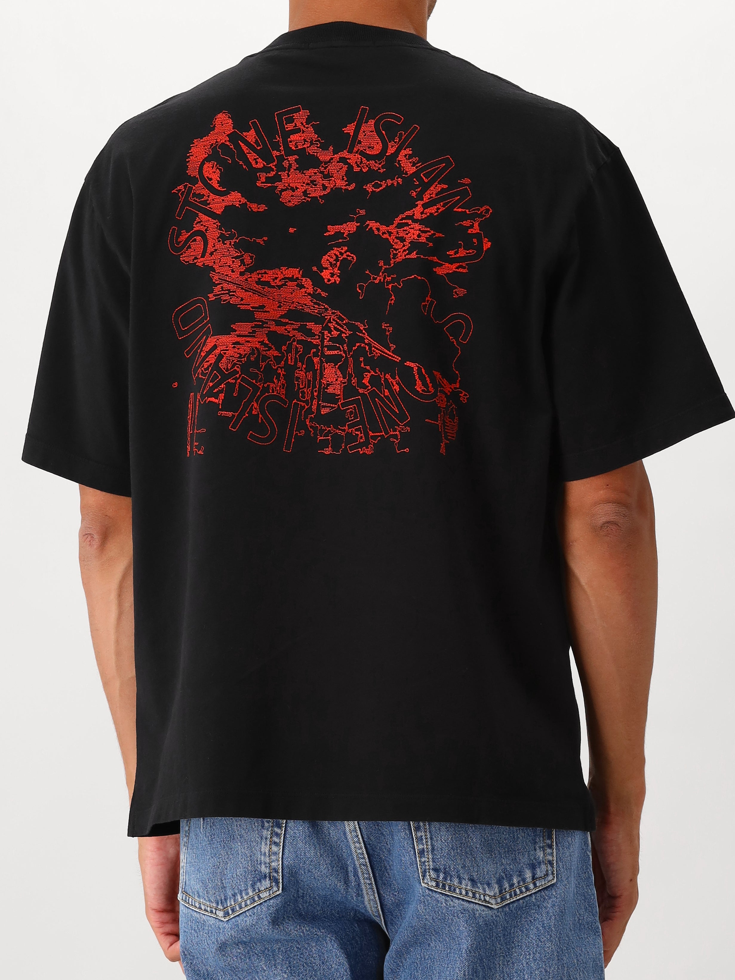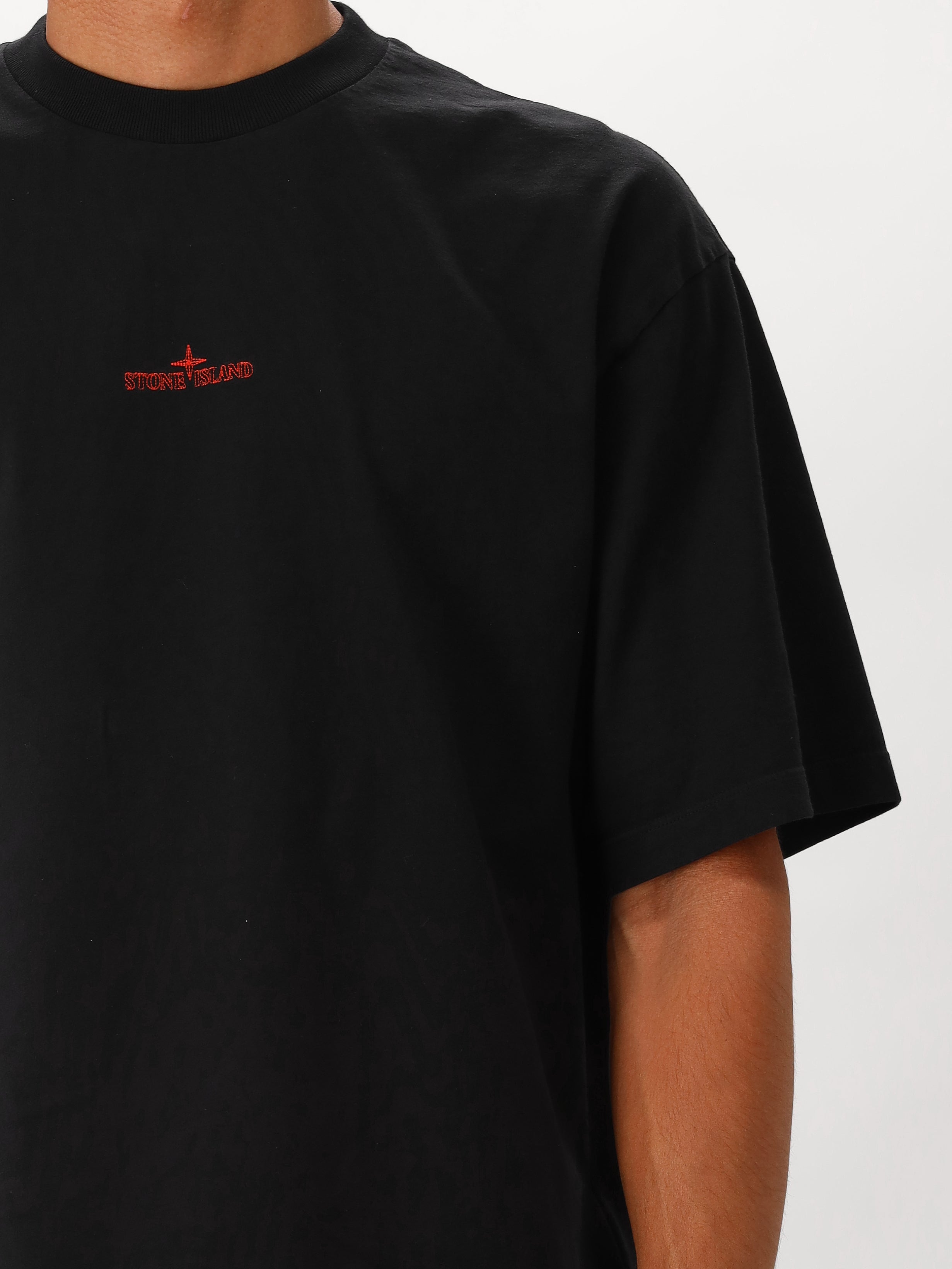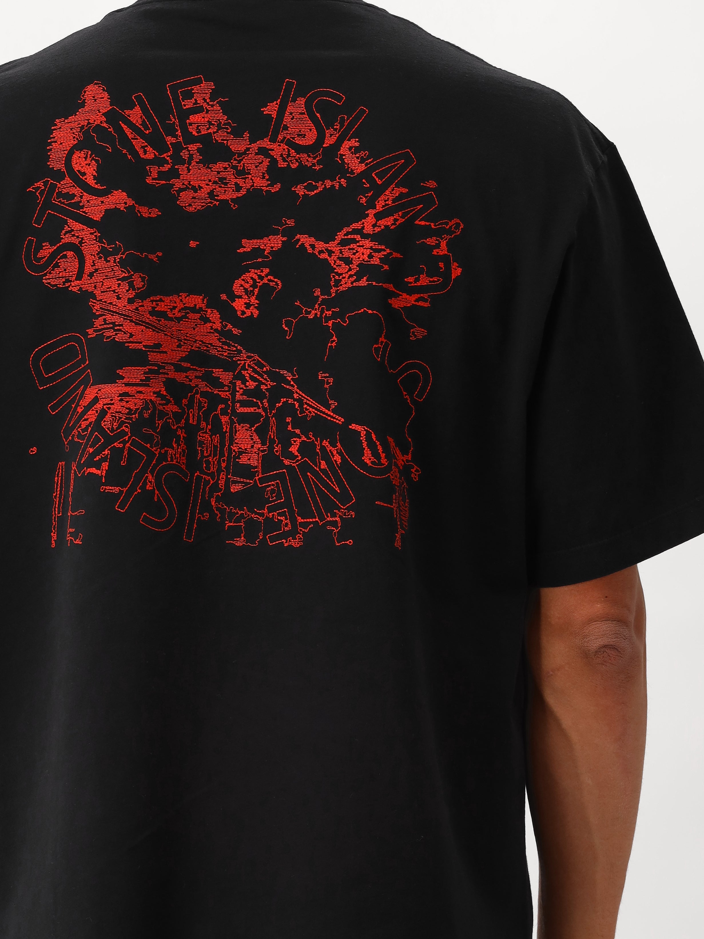 Dit zwarte T-shirt van Stone Island heeft een groot design op de rug in een felle rode kleur. Dit geeft het item een stijlvolle uitstraling. Het design zit in het T-shirt genaaid, dankzij de oversized fitting geef je jouw outfit een tijdloze uitstraling. Het T-shirt bestaat volledig uit katoen.