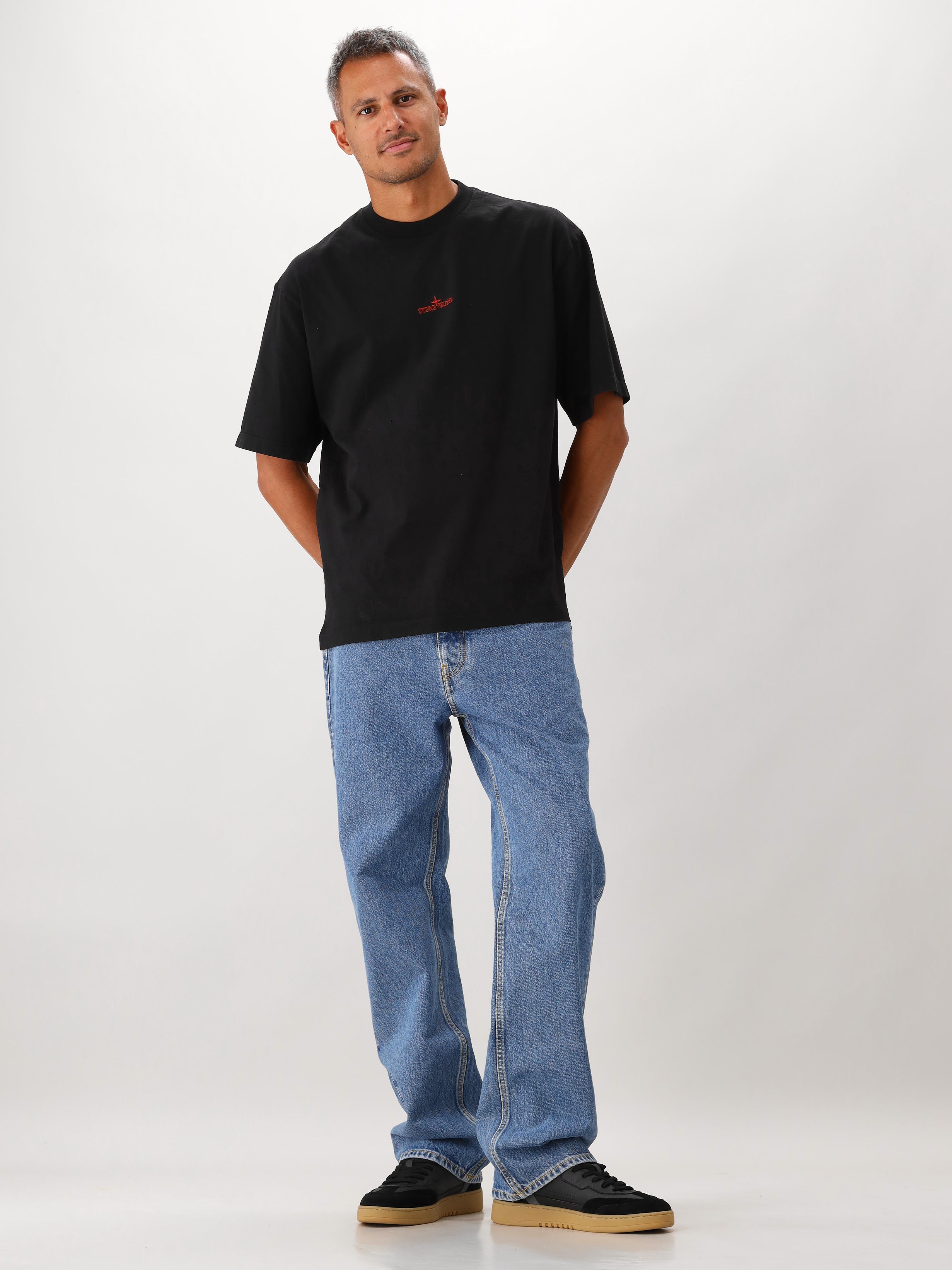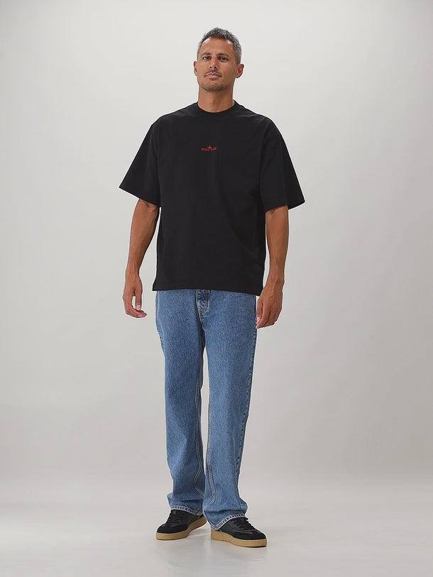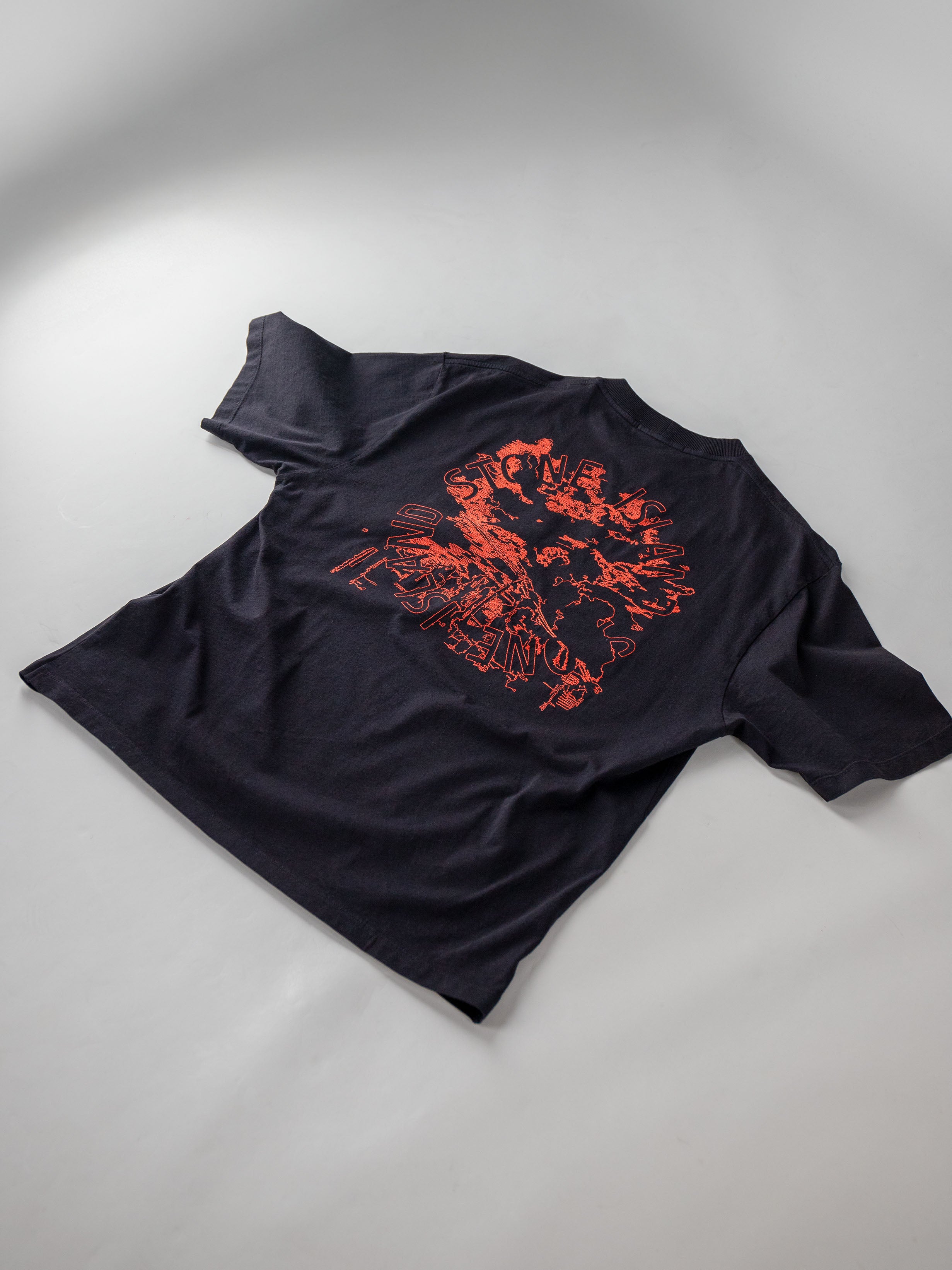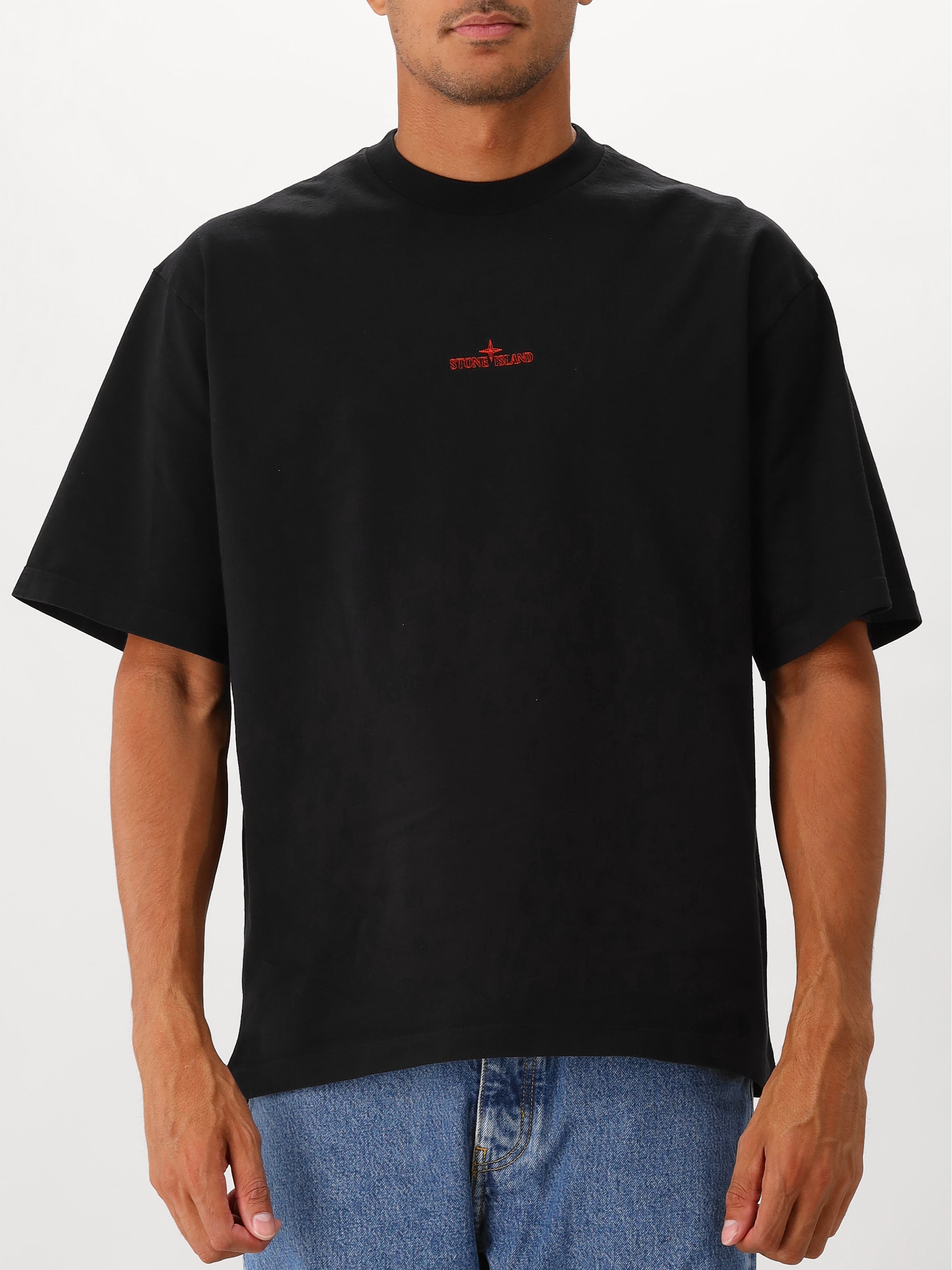Dit zwarte T-shirt van Stone Island heeft een groot design op de rug in een felle rode kleur. Dit geeft het item een stijlvolle uitstraling. Het design zit in het T-shirt genaaid, dankzij de oversized fitting geef je jouw outfit een tijdloze uitstraling. Het T-shirt bestaat volledig uit katoen.