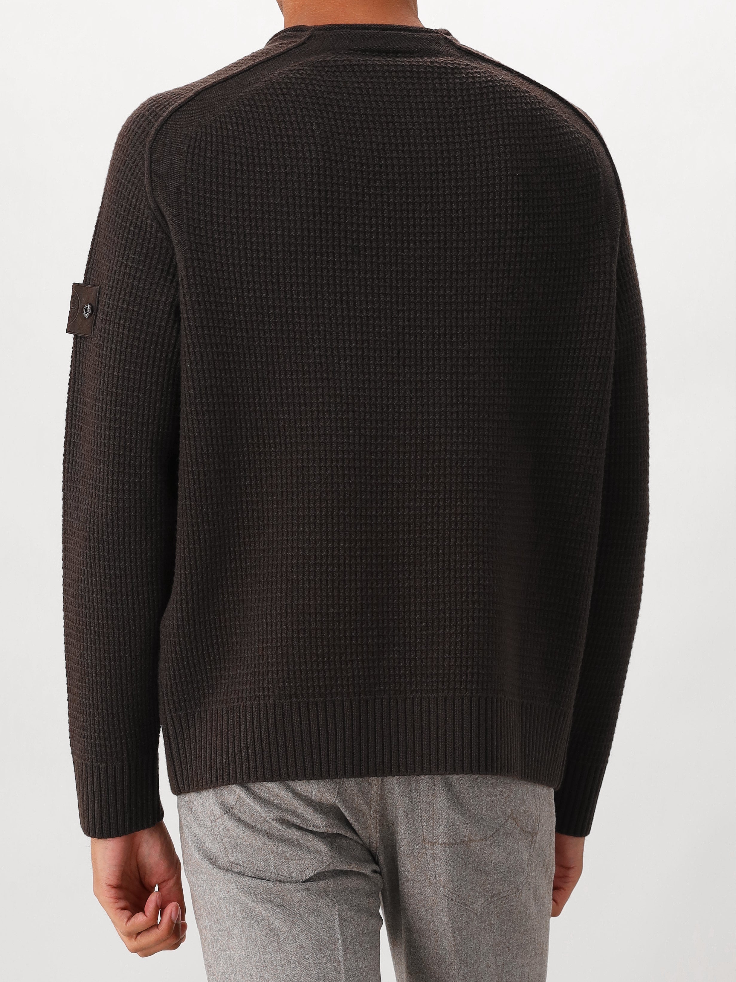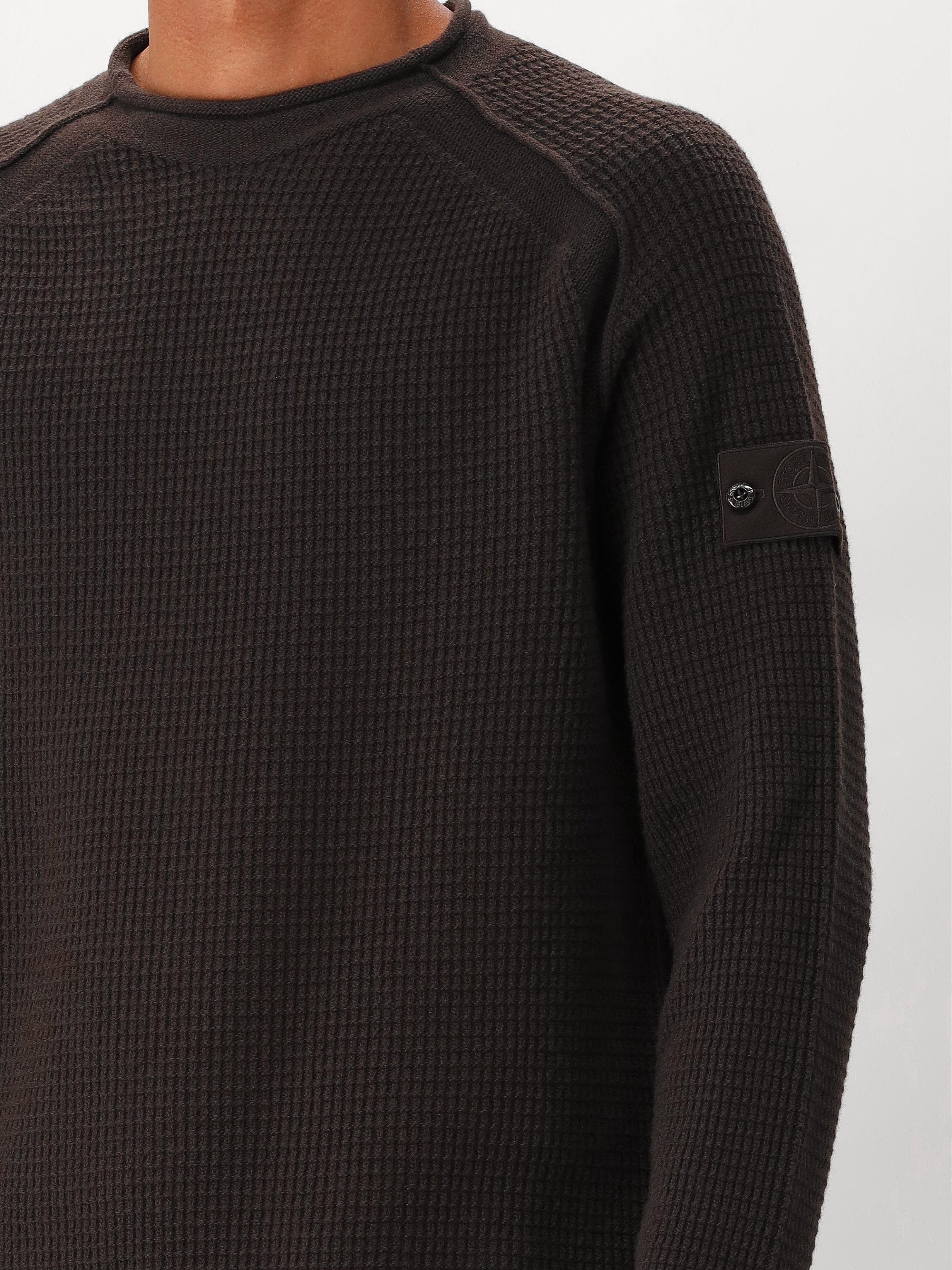Shop deze donkerbruine wollen trui van Stone Island! De trui is grof gebreid en heeft een regular fit. Bij de kraag zit een subtiel detail dat de trui net even anders maakt. Op de linkermouw zie je een Stone Island patch in dezelfde kleur als de trui, kenmerkend voor de exclusieve Ghost-serie.